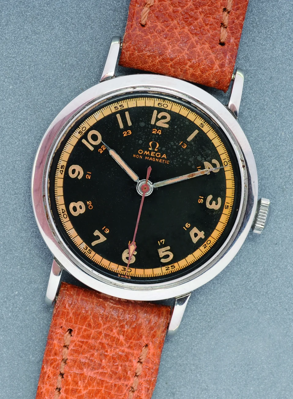 dark" dials. Black in the centre, bearing "NON MAGNETIC", and a narrow silvered seconds track. See photo