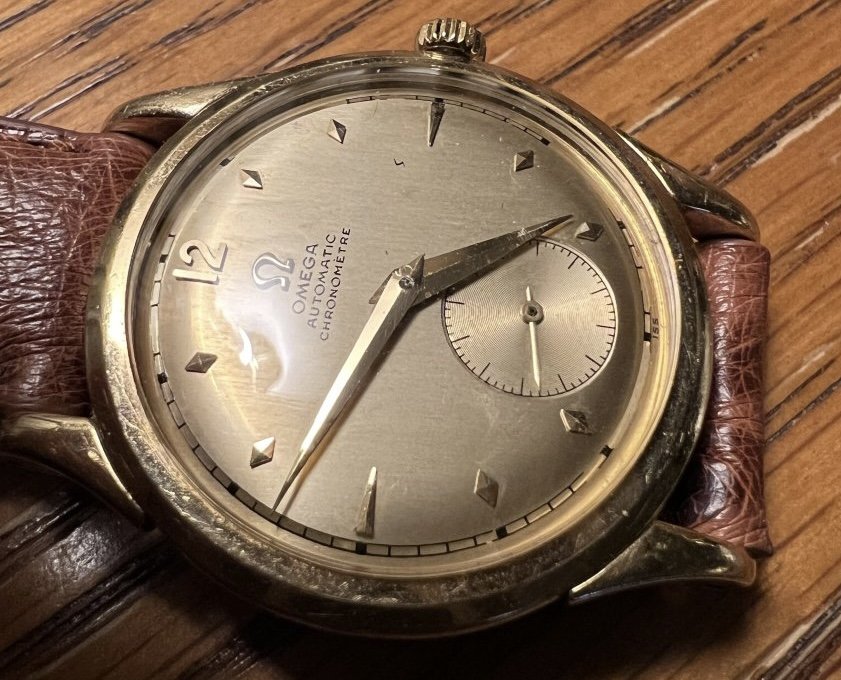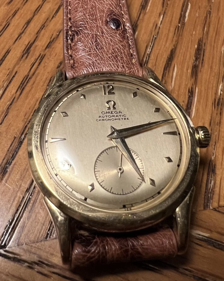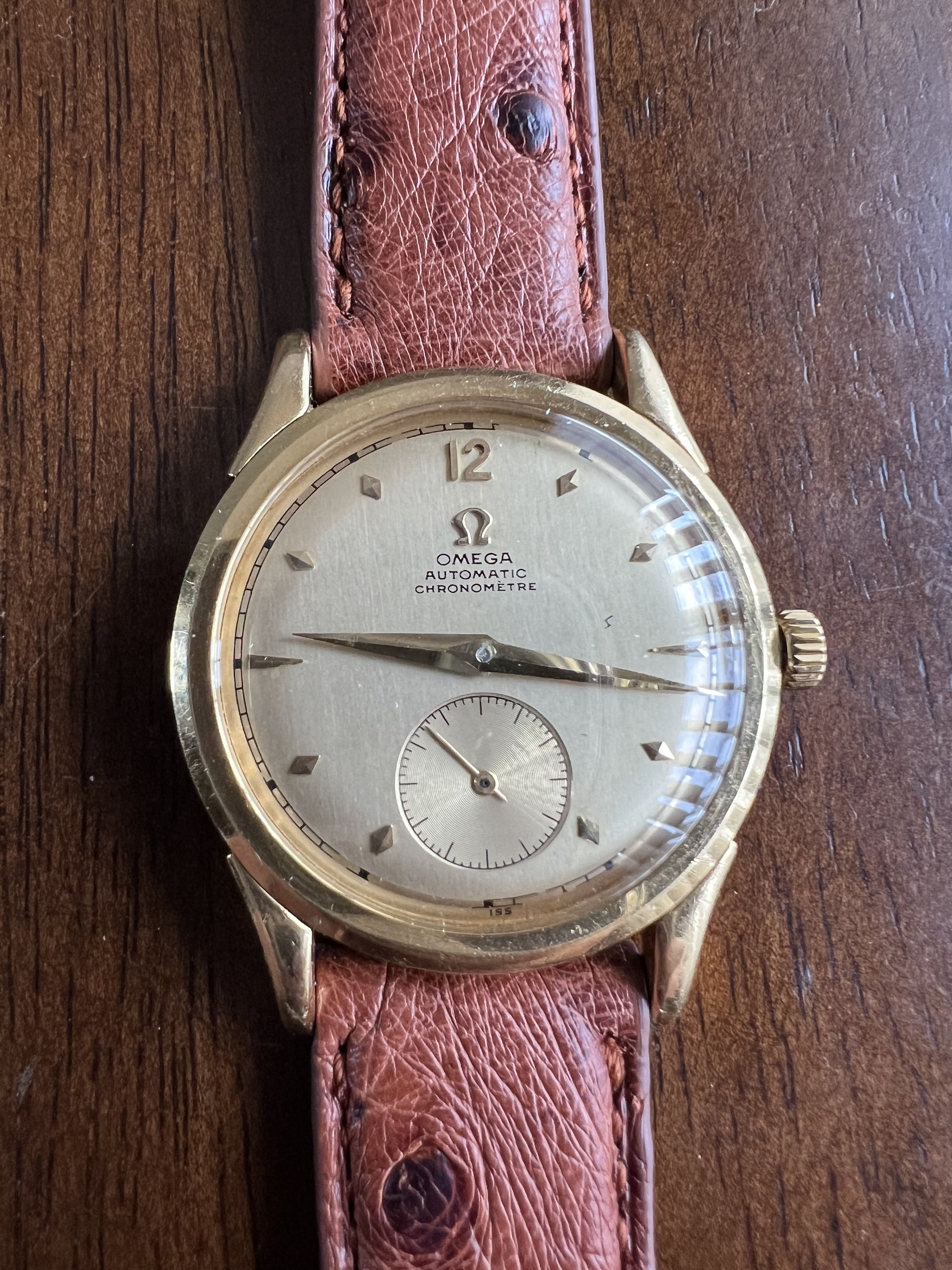 The 18k yellow gold case is about 33mm in diameter excluding the crown and in excellent condition. The original dial is in nice condition with some mild wear. The spot between 2 and 3 o’clock is a speck of dust under the crystal. Watch is running well but has not been serviced under my ownership so I would recommend one. It comes with an attractive ostrich strap with very minimal wear on steel spring bars.
