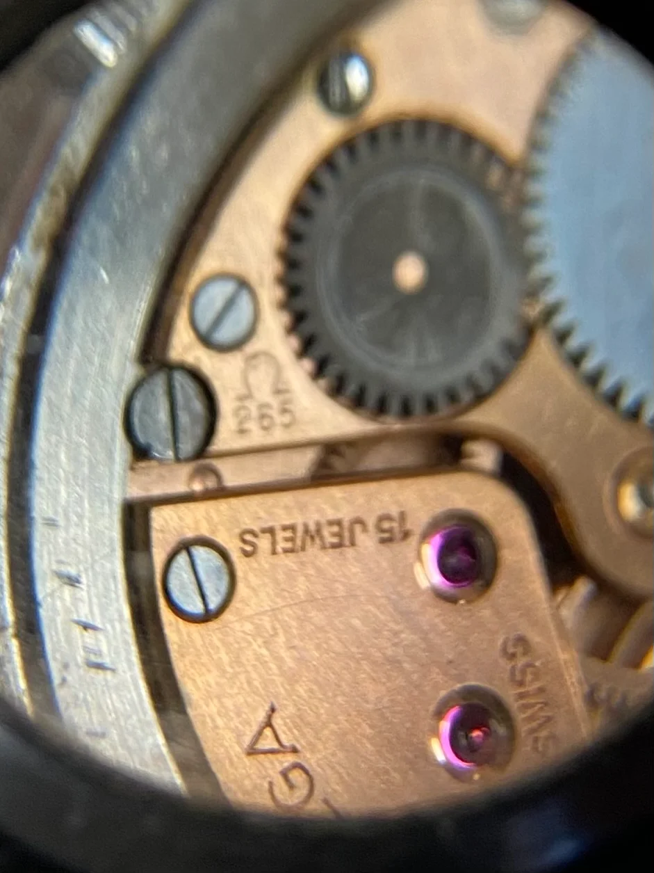 MOVEMENT: Omega caliber 265 manual-wind sub-second movement. Winds smooth, in good working order. Signed Omega, 265, serial # 11607776.