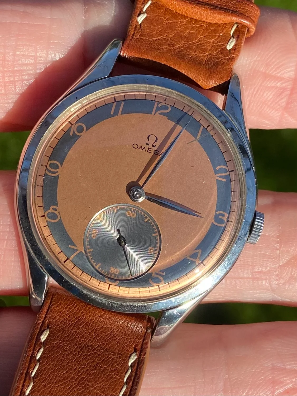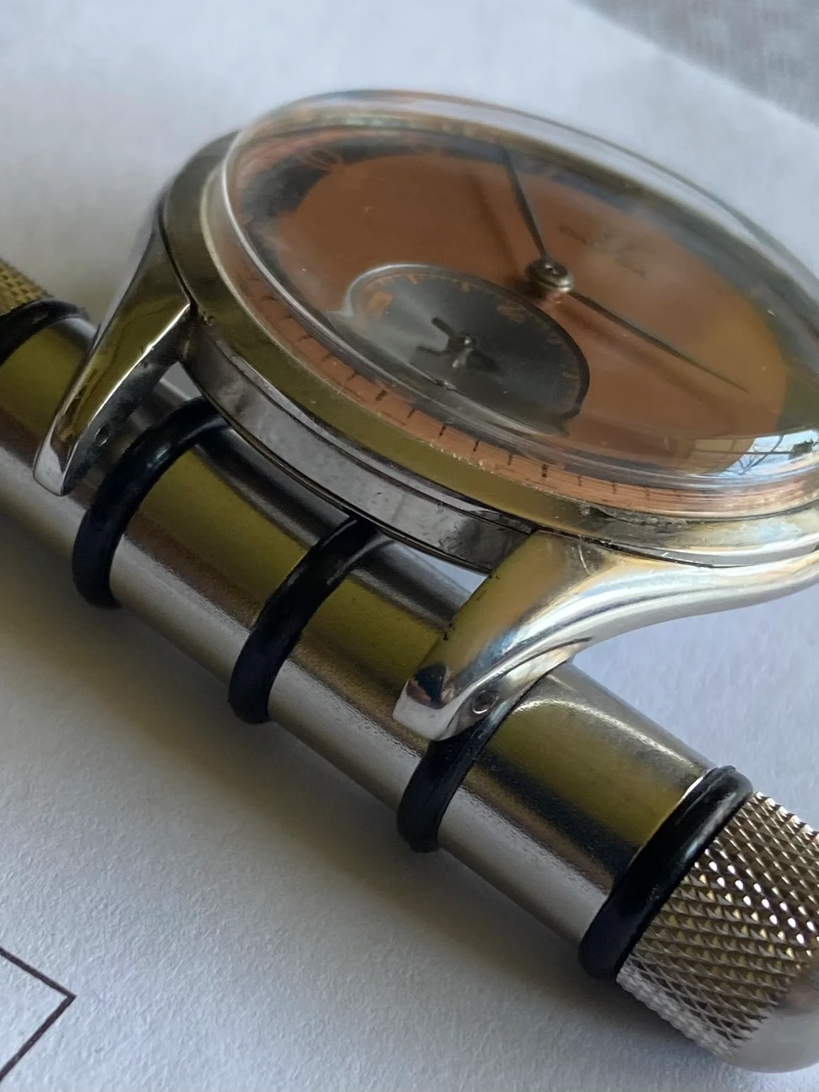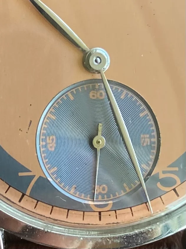 DIAL & HANDS: Rare salmon/copper non-lume dial with aging shown in pics. Stainless hands are elegant. VG vintage condition.