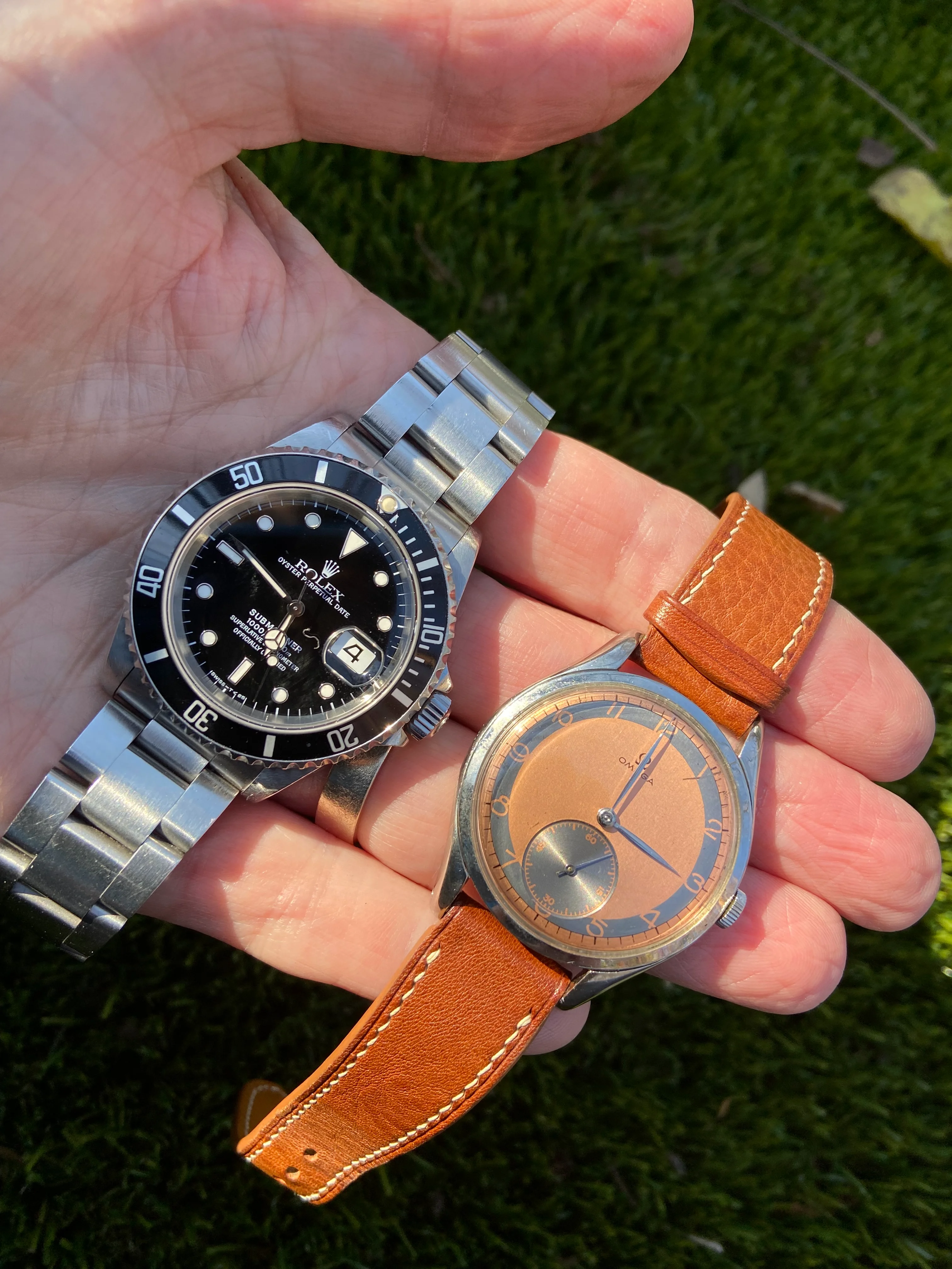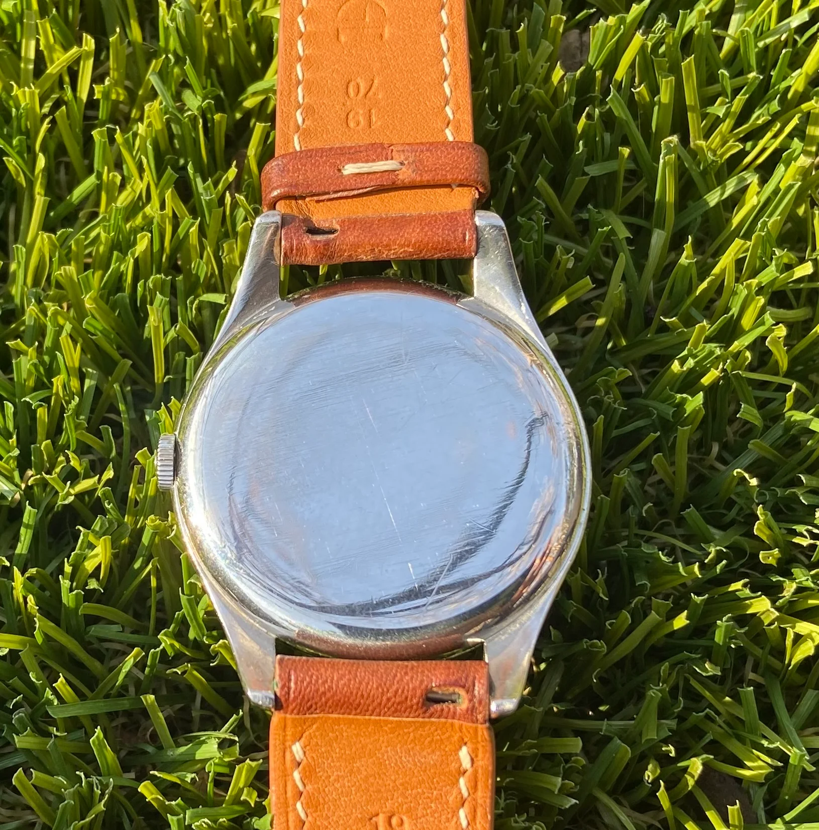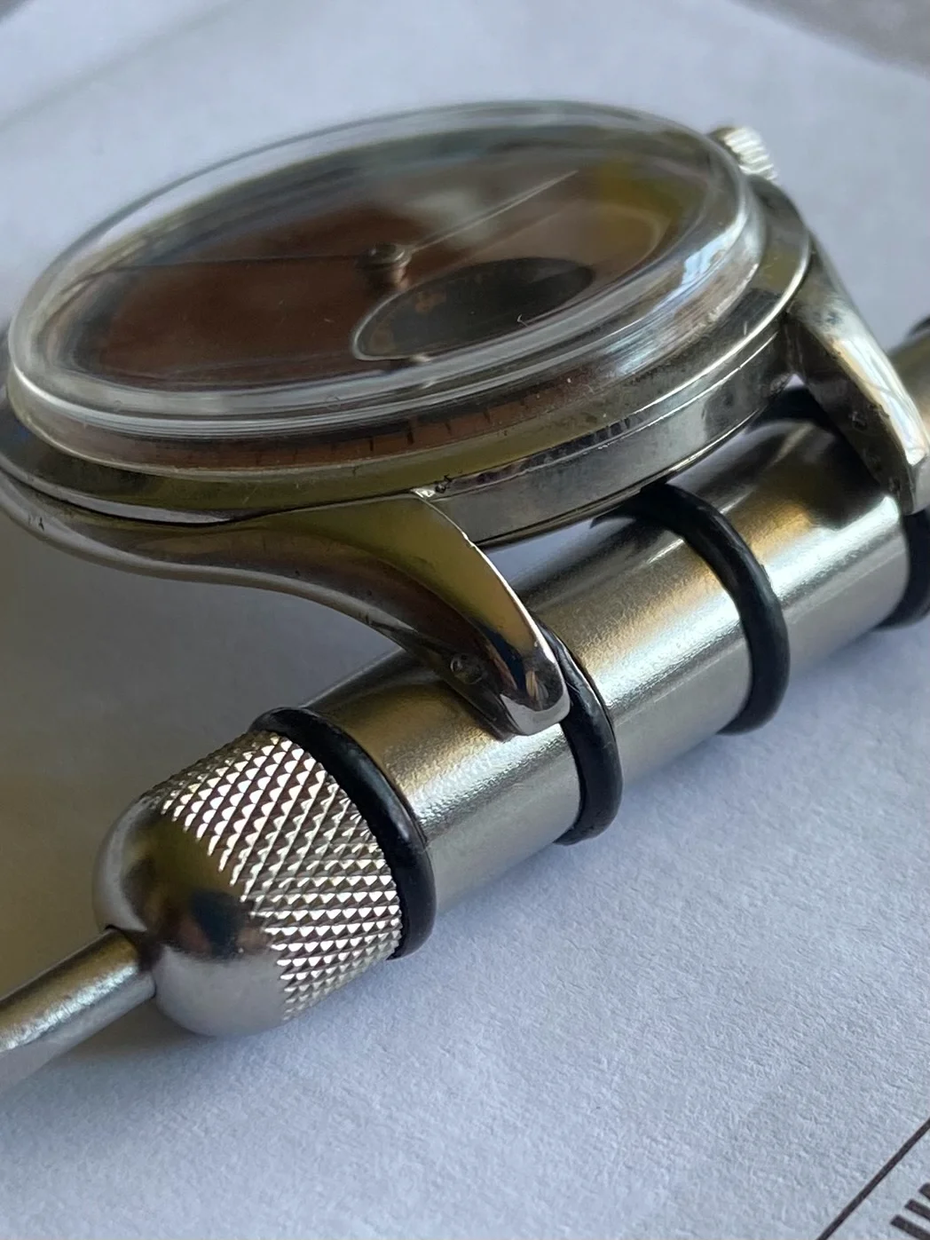 DIAL & HANDS: Rare salmon/copper non-lume dial with aging shown in pics. Stainless hands are elegant. VG vintage condition.
