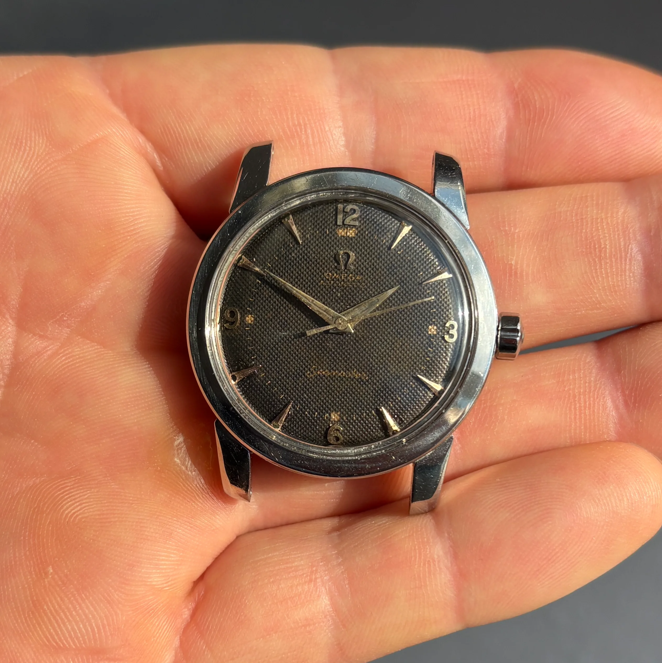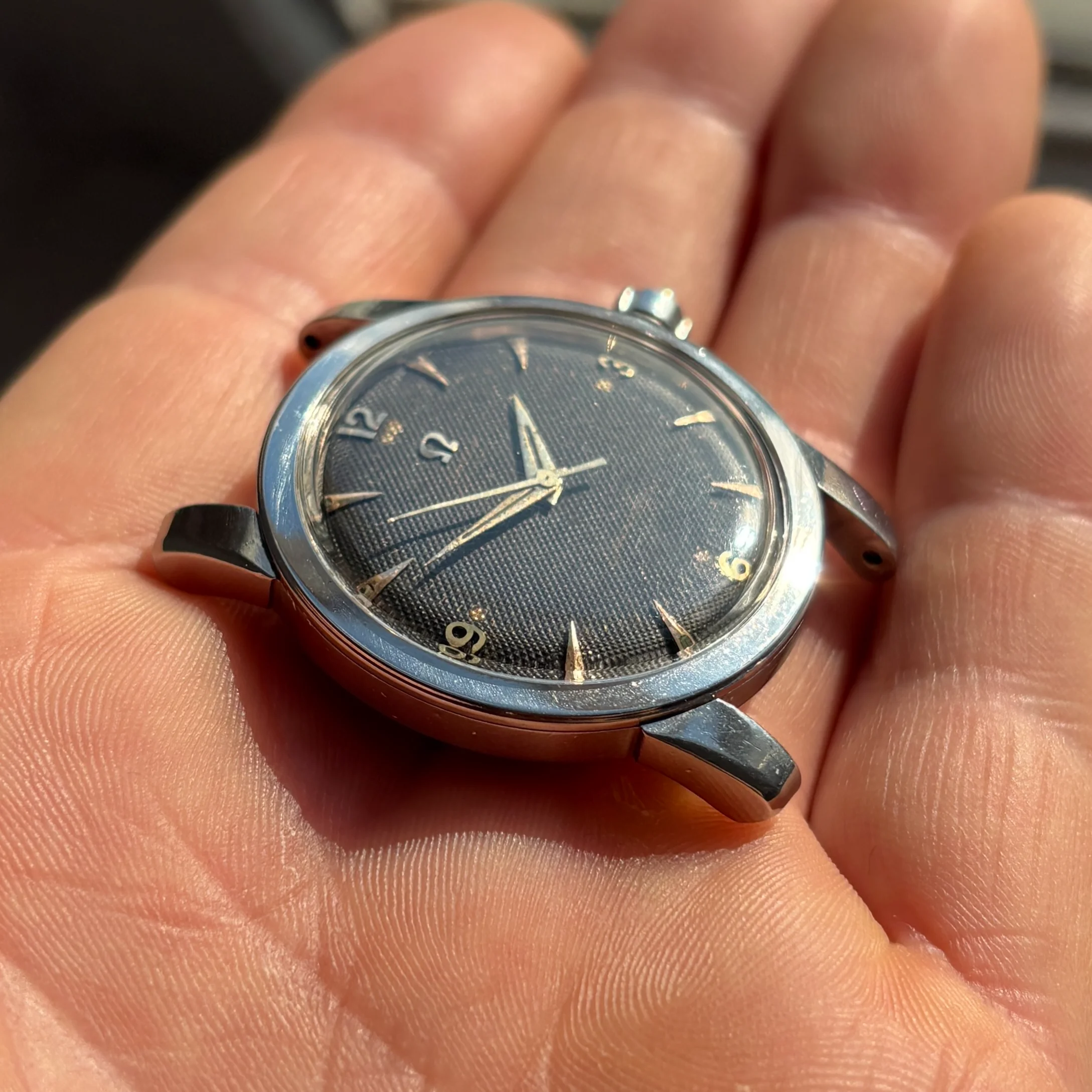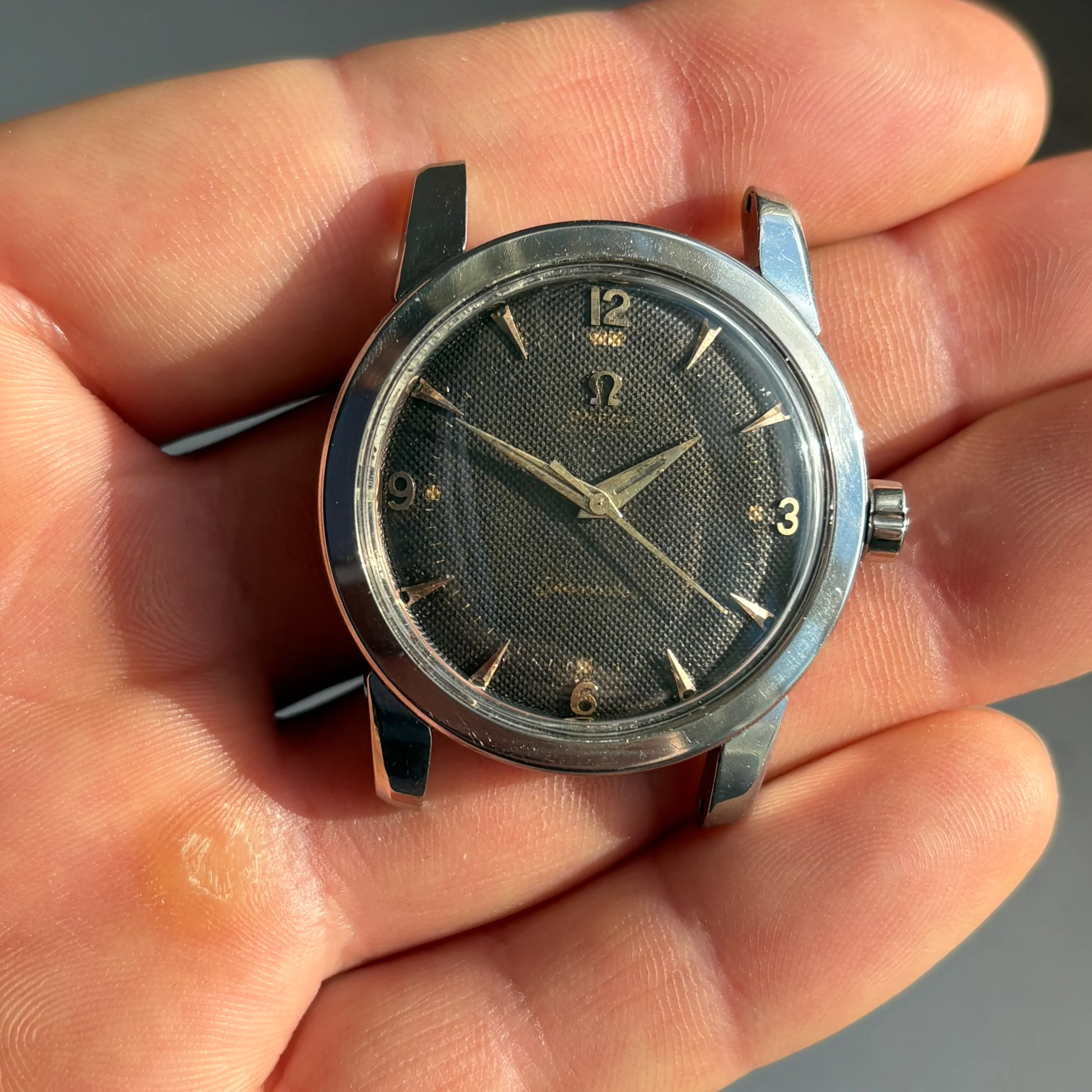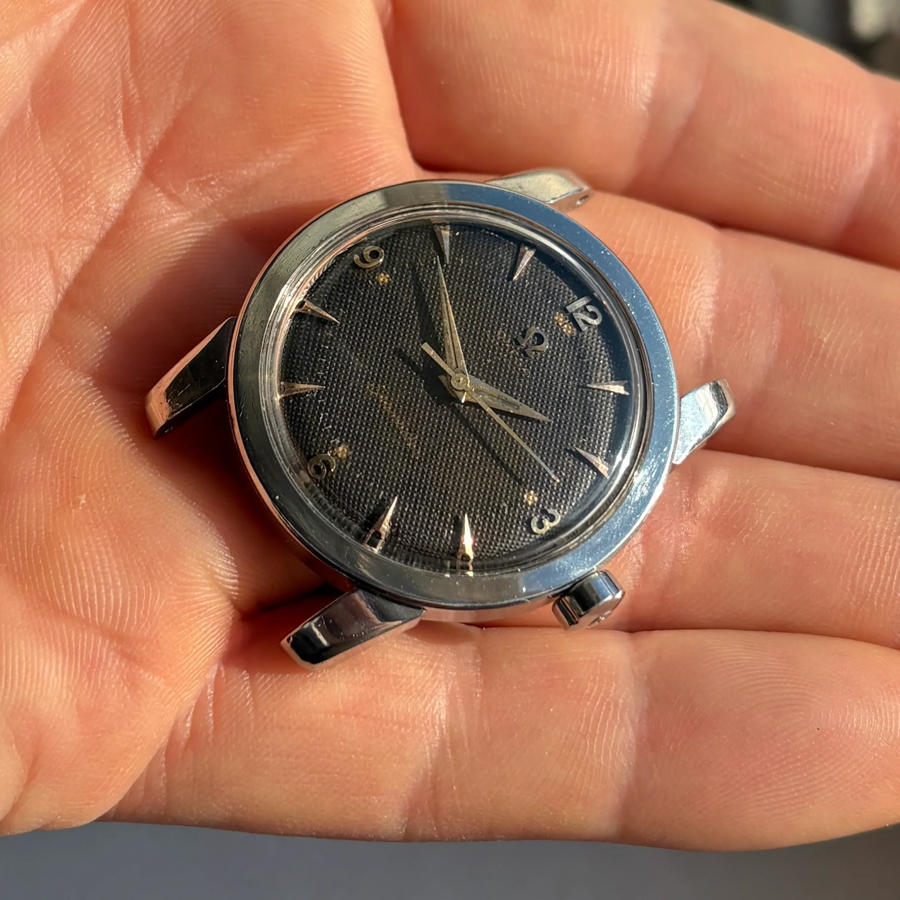 ·Omega Seamaster 2577 in steel with a black waffle / honeycomb dial, produced in 1952. This have an original flat foot naiad crown and a good case.