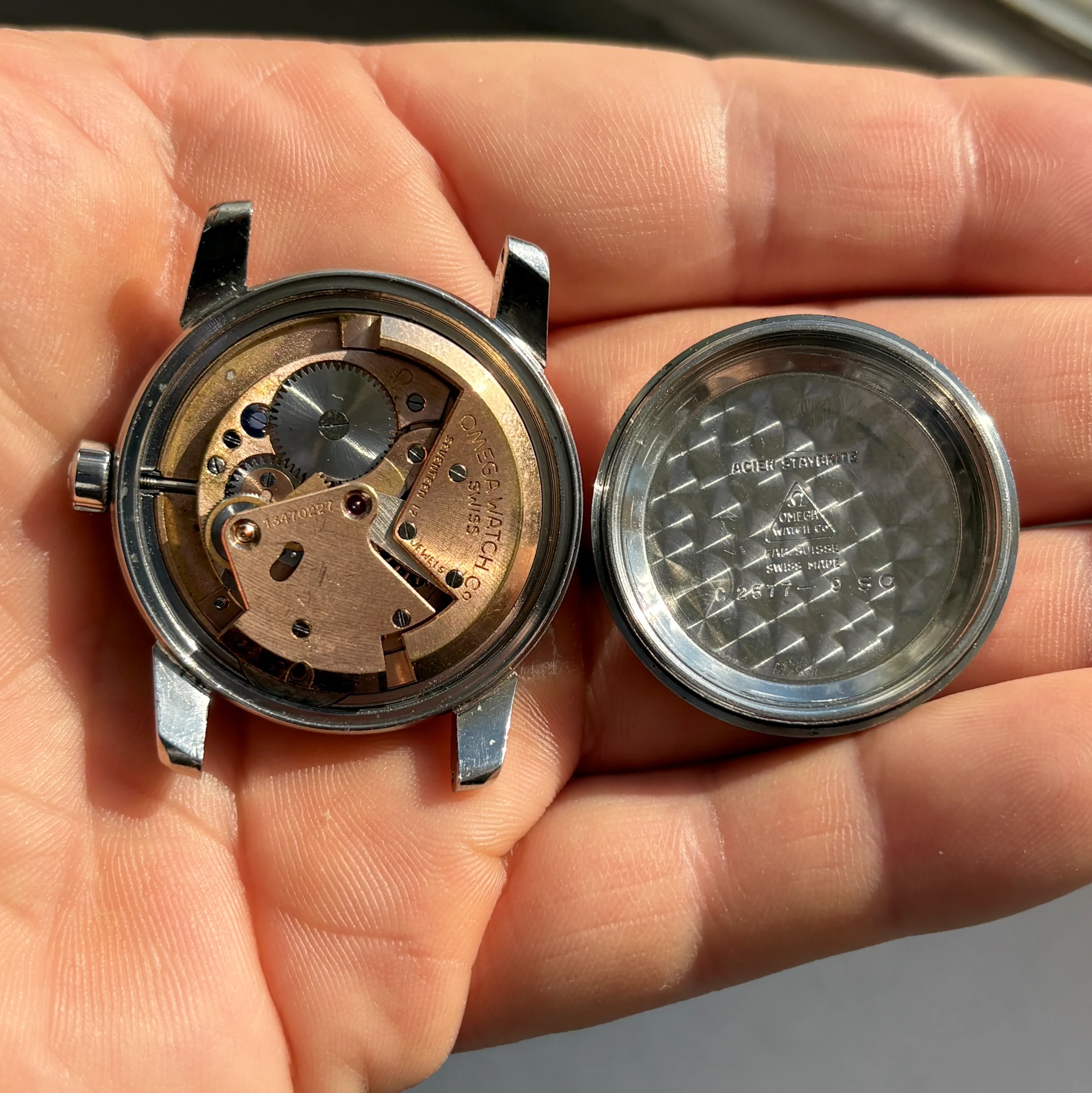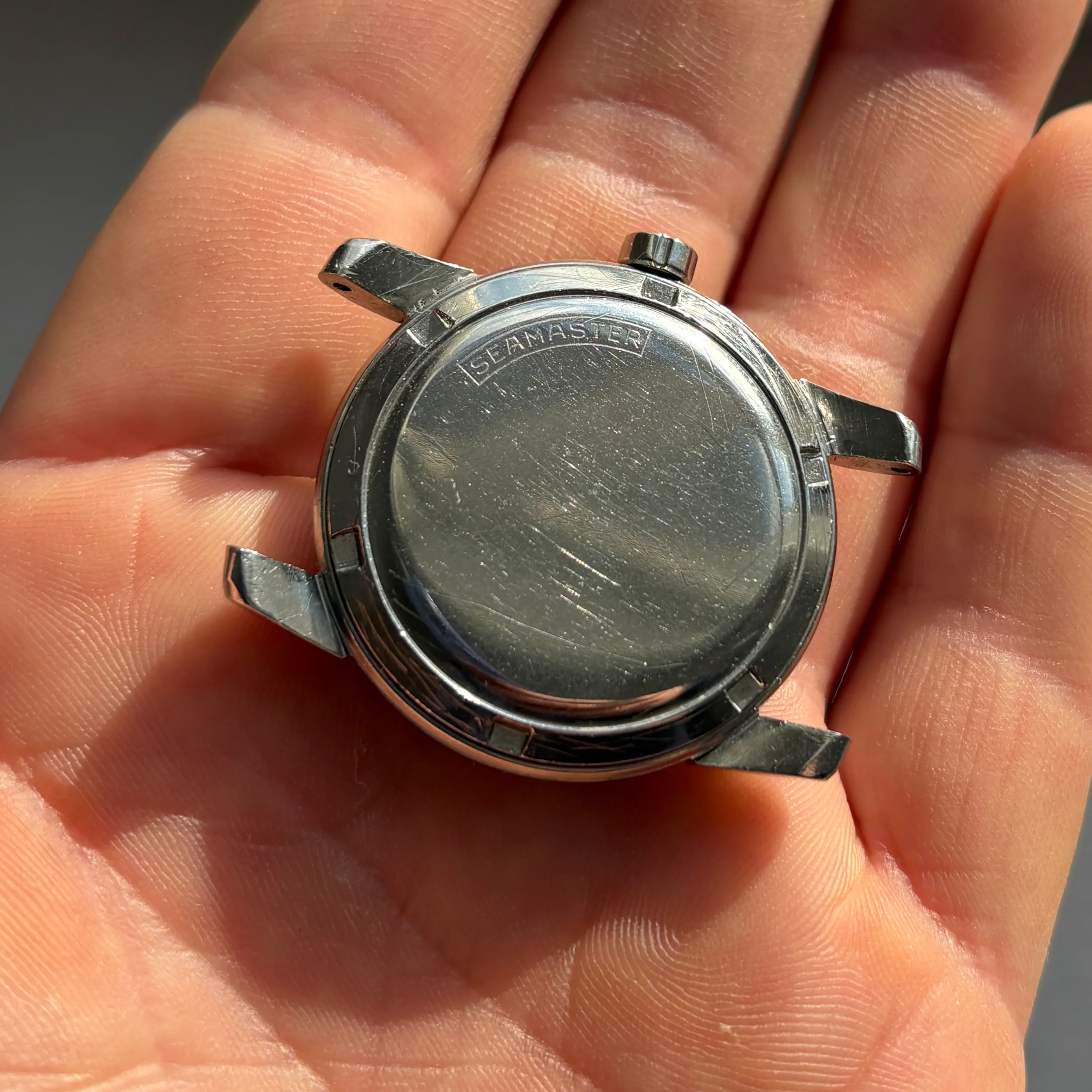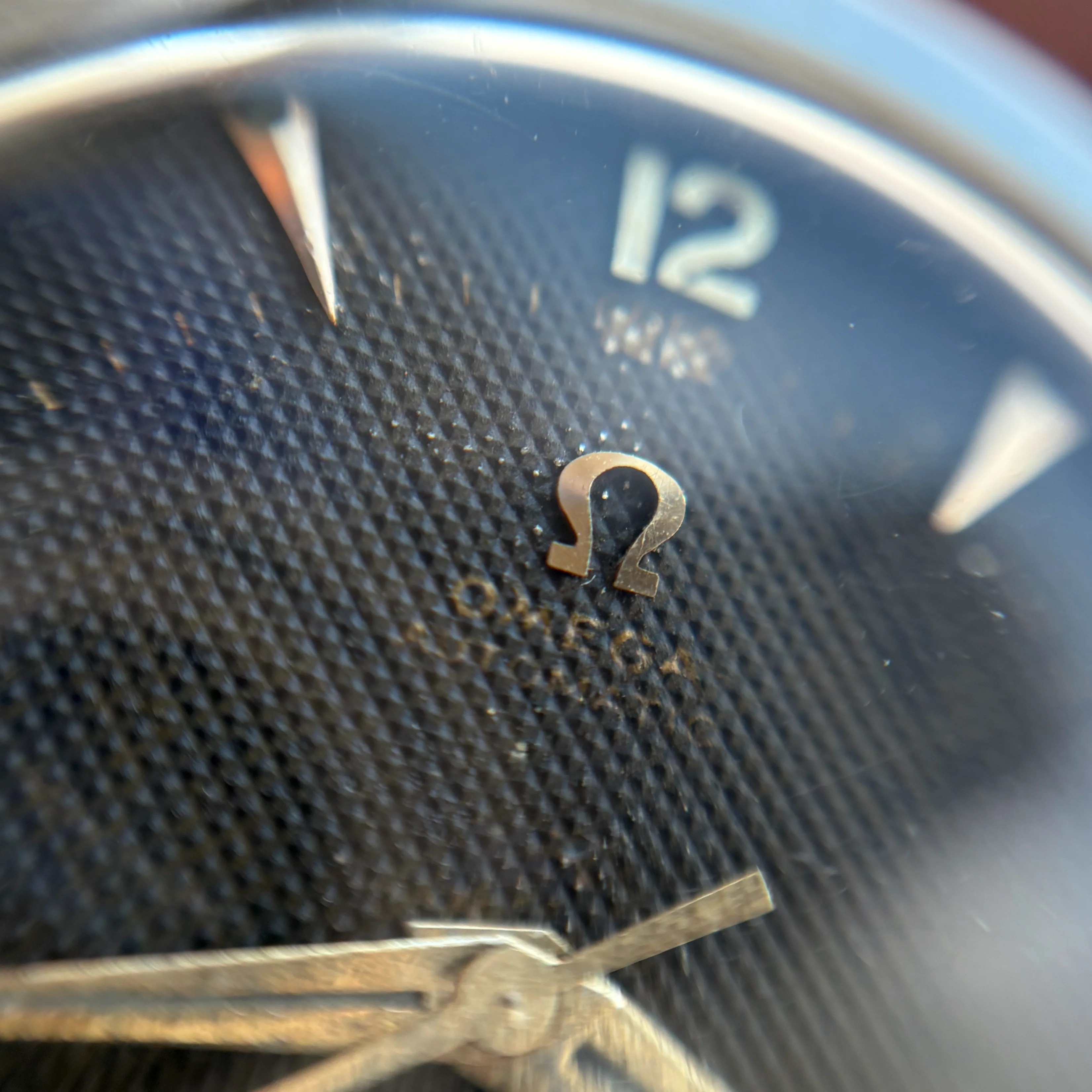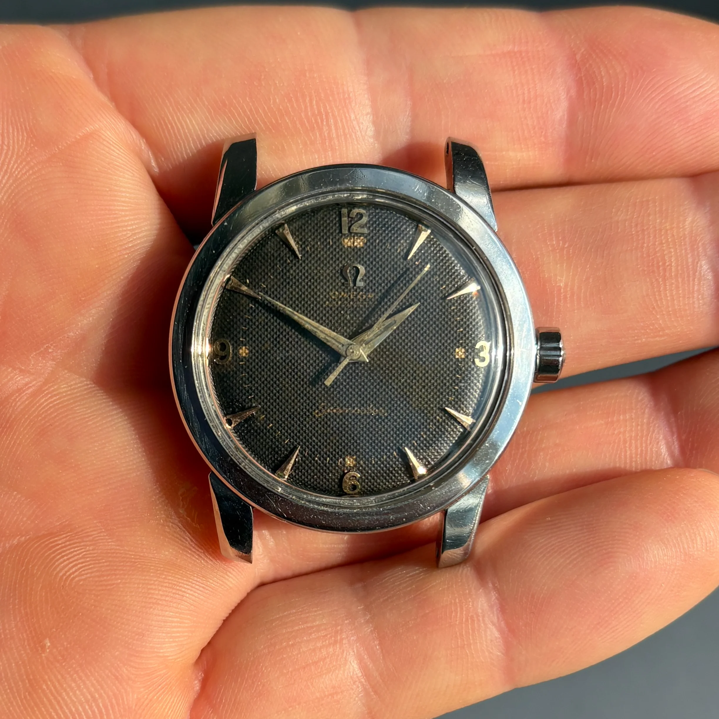 ·Omega Seamaster 2577 in steel with a black waffle / honeycomb dial, produced in 1952. This have an original flat foot naiad crown and a good case.