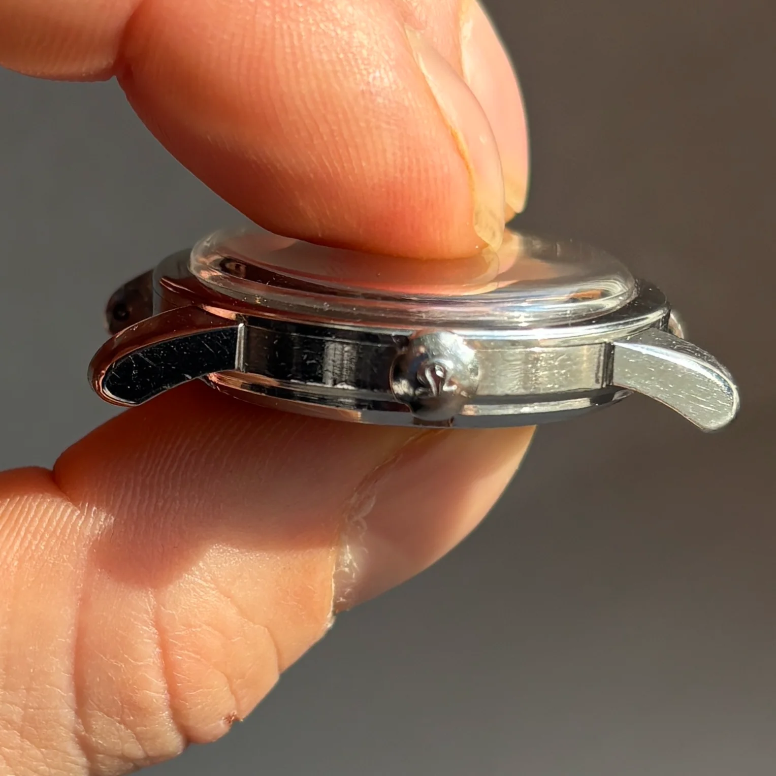 Case is well preserved with thick beveled lugs, nice touch with the quite rare naiad crown which are hard to come by.