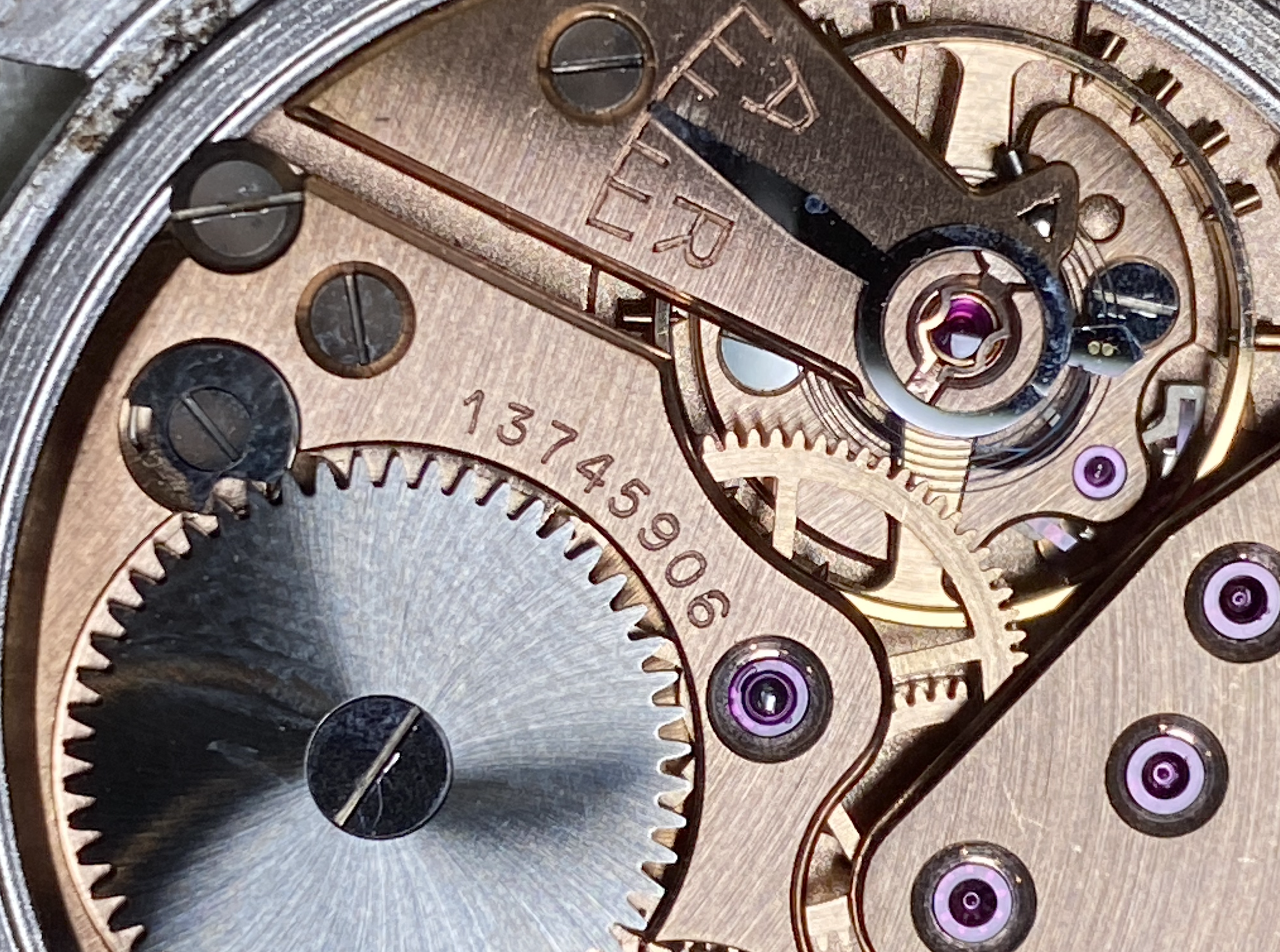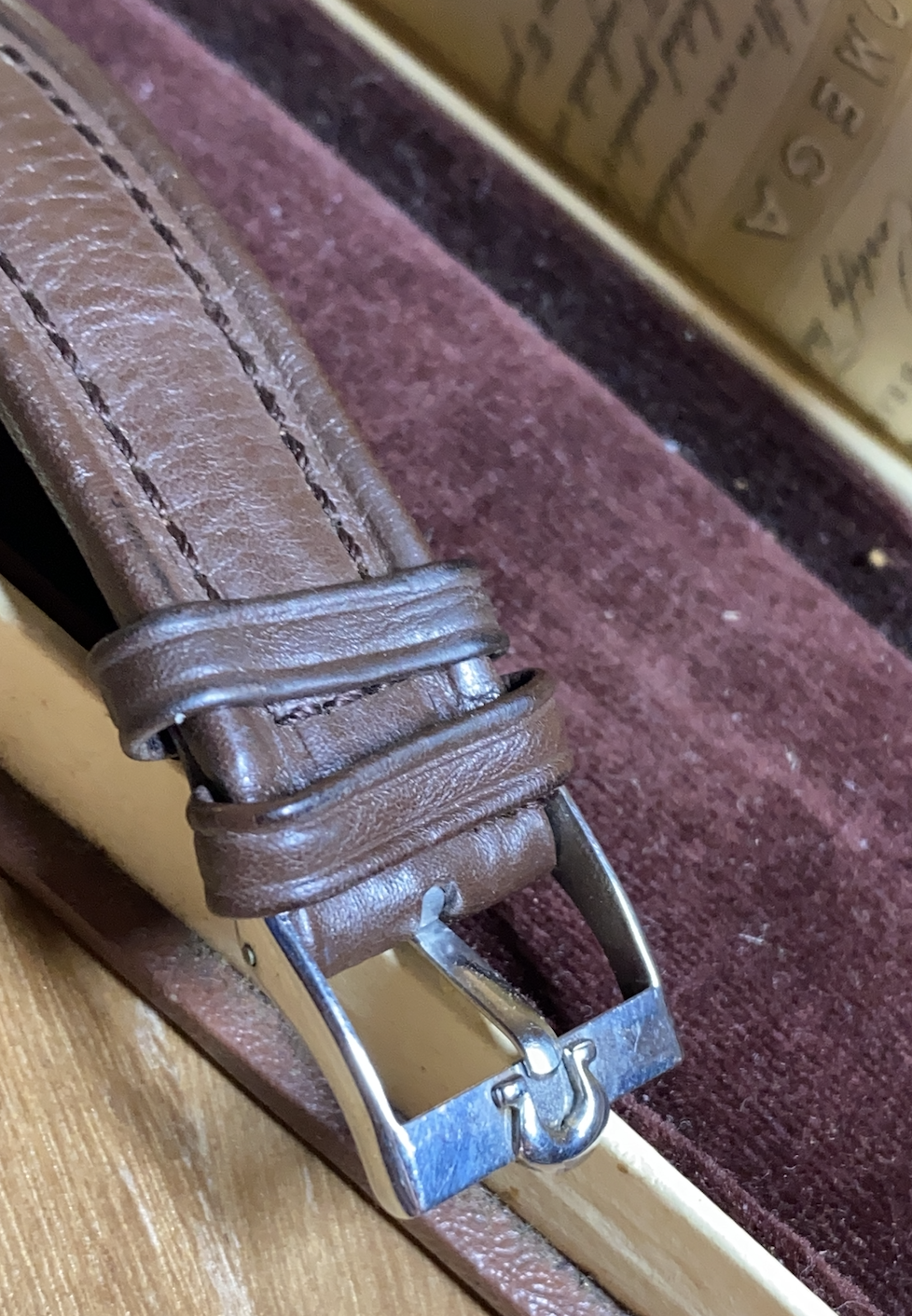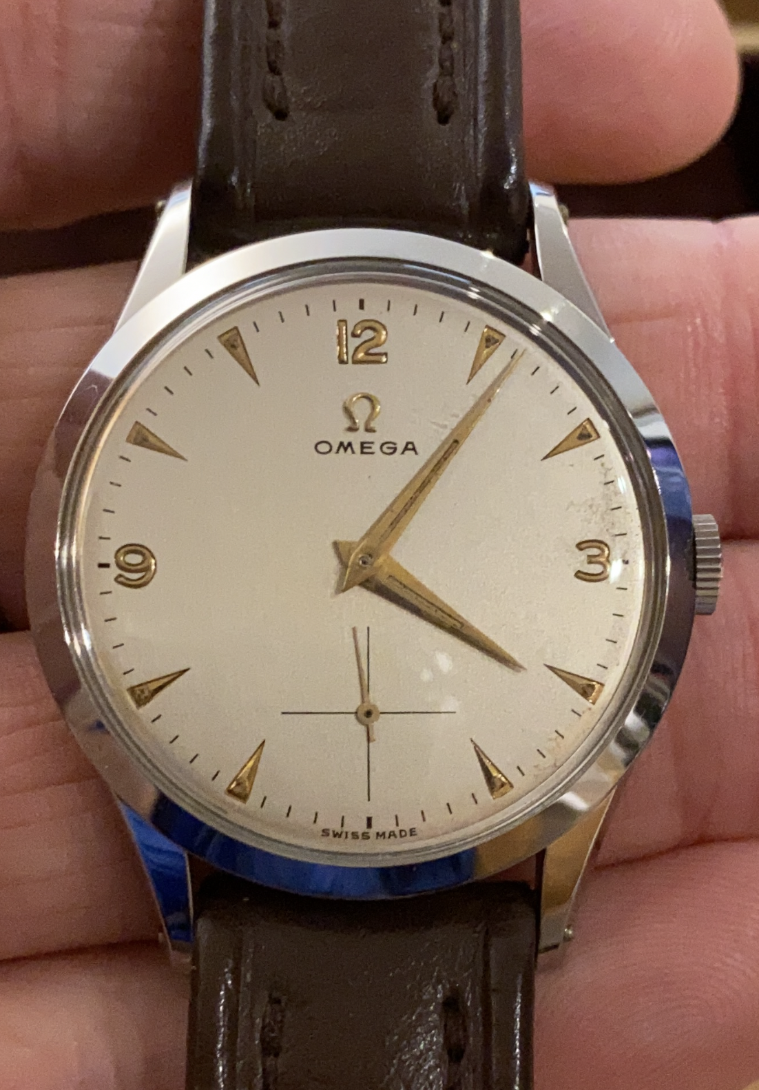 ·I wonder if anyone could help with this. I cant seem to find the same reference with the same dial (The dial has cut-outs for the markers and 3-9-12). Papers are dated 1955. I think this must also be the original strap that has seen VERY little wear. Unfortunately the guy who sold to me took it to his watchmaker to secure the stem and he has "signed" the inside of the caseback.
