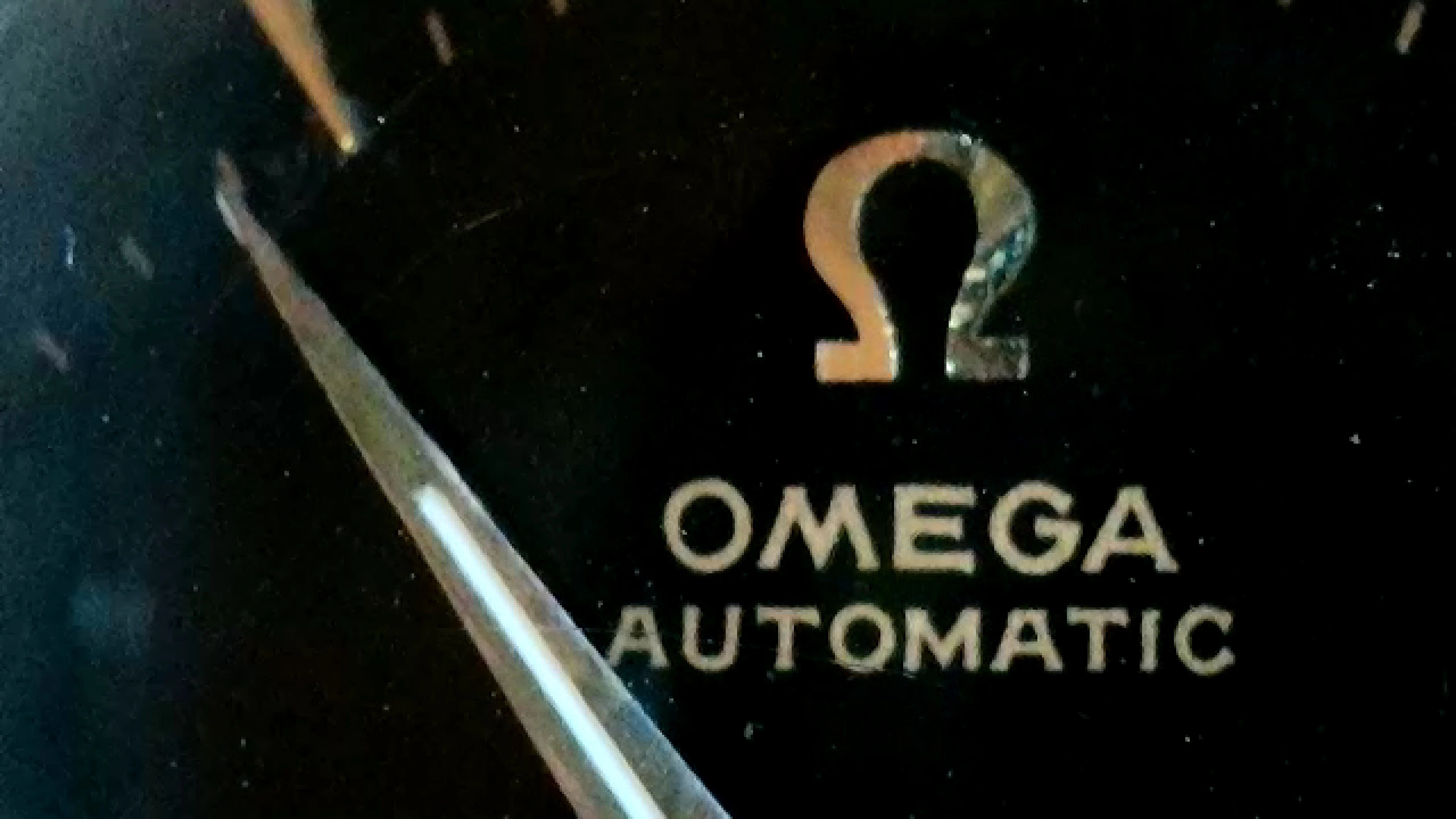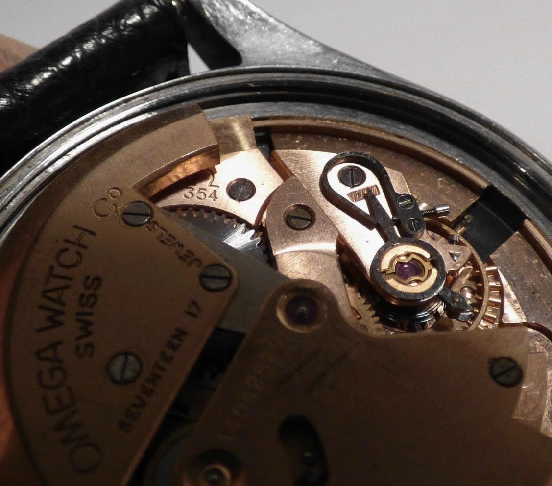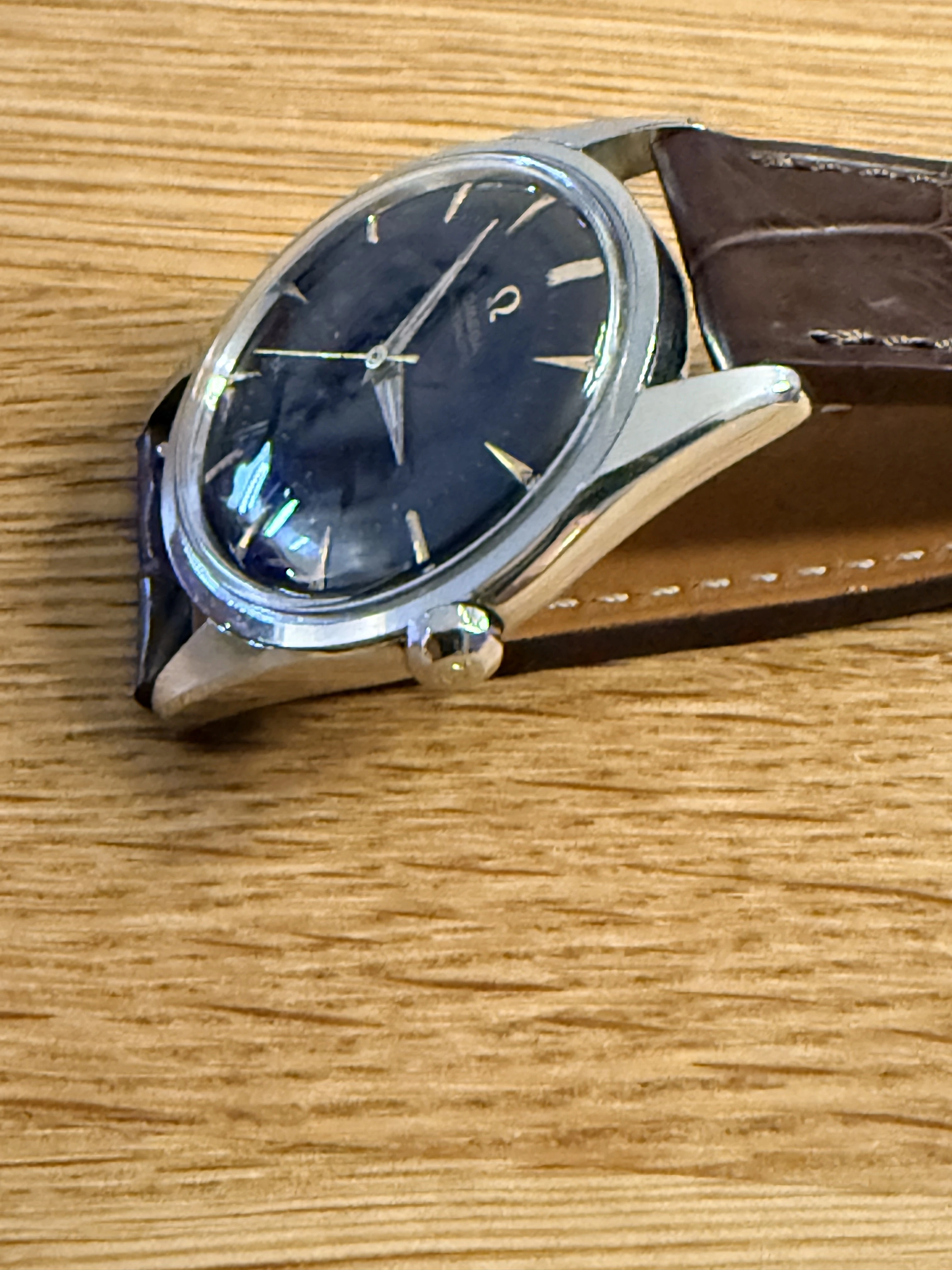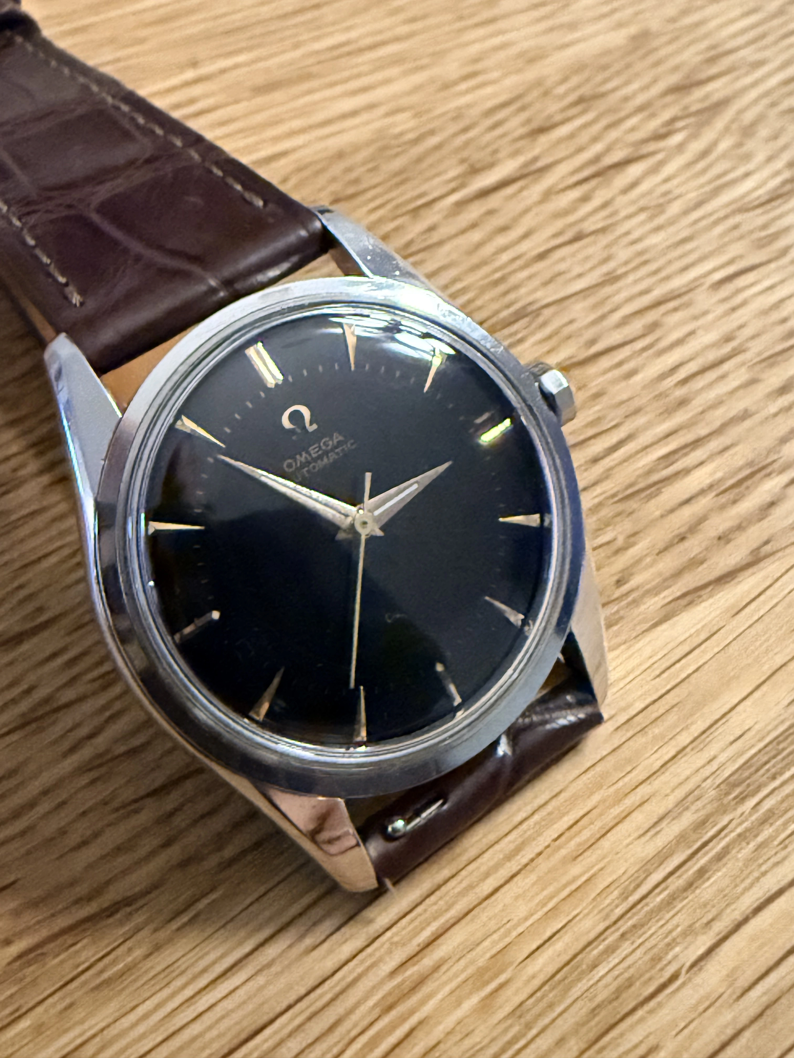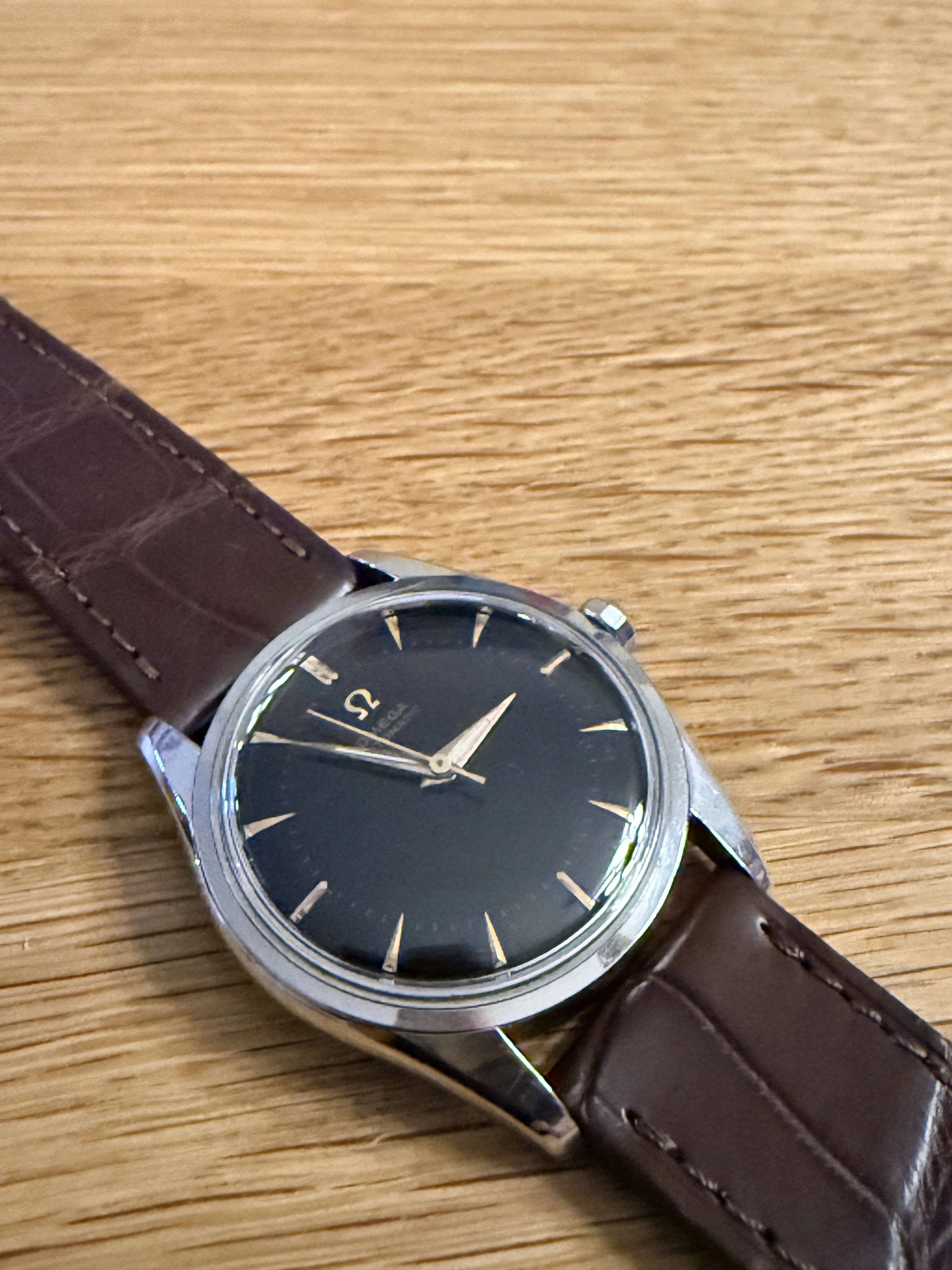 The watch is really difficult to photograph because the plexiglass is too reflective. To me, the dial looks original—the Omega lettering is razor sharp and the index lines are all identical and aligned. The "Suisse" or "Swissmade" imprint is missing, but after doing a little research, I found that this sometimes occurs with watches from the 1940s and 1950s. This model is really rare online, but if you look at the product photo in the Omega archive, there is no mention of it being Swiss-made either.