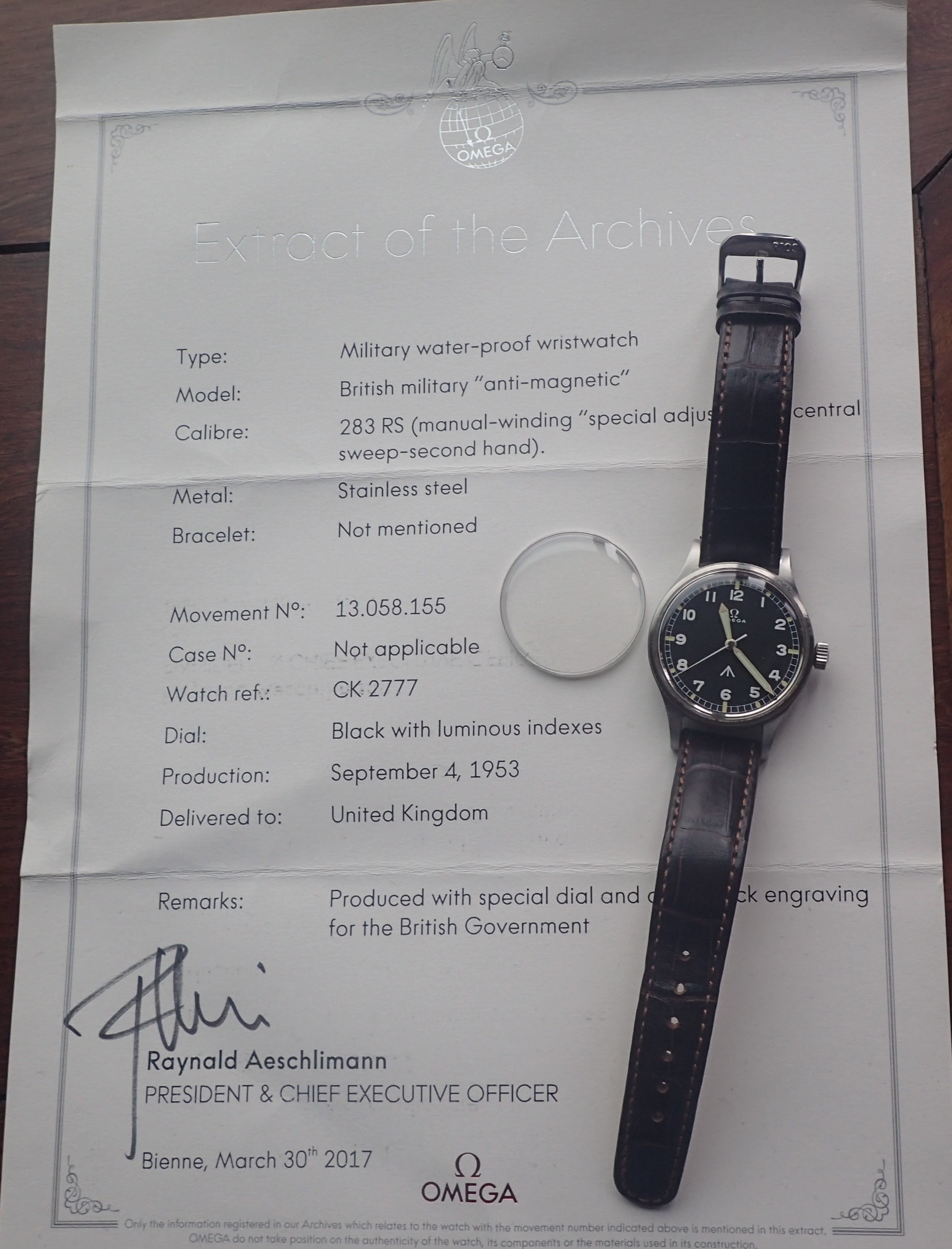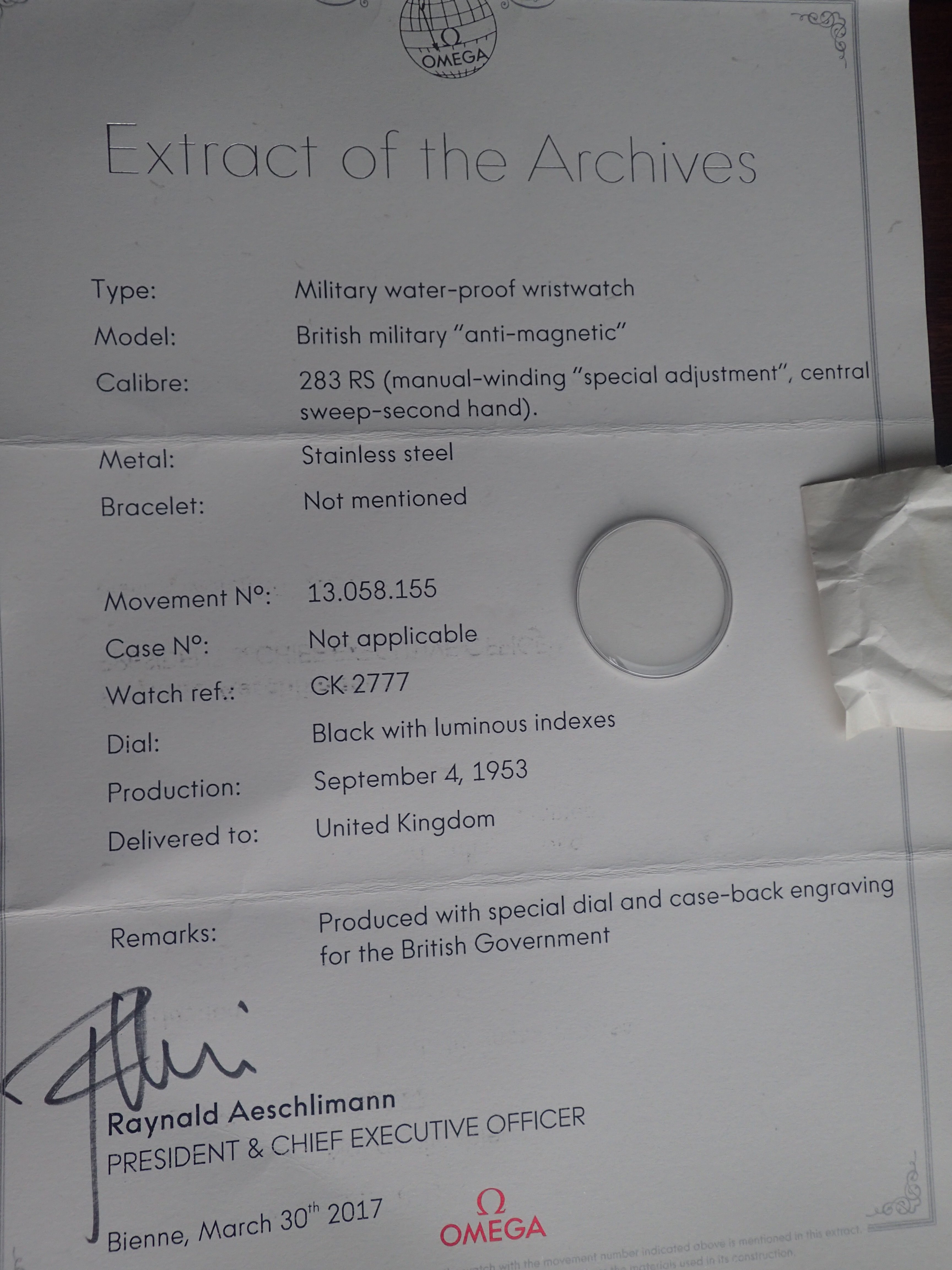 The watch comes with an Extract of the Archives and a spare crystal.