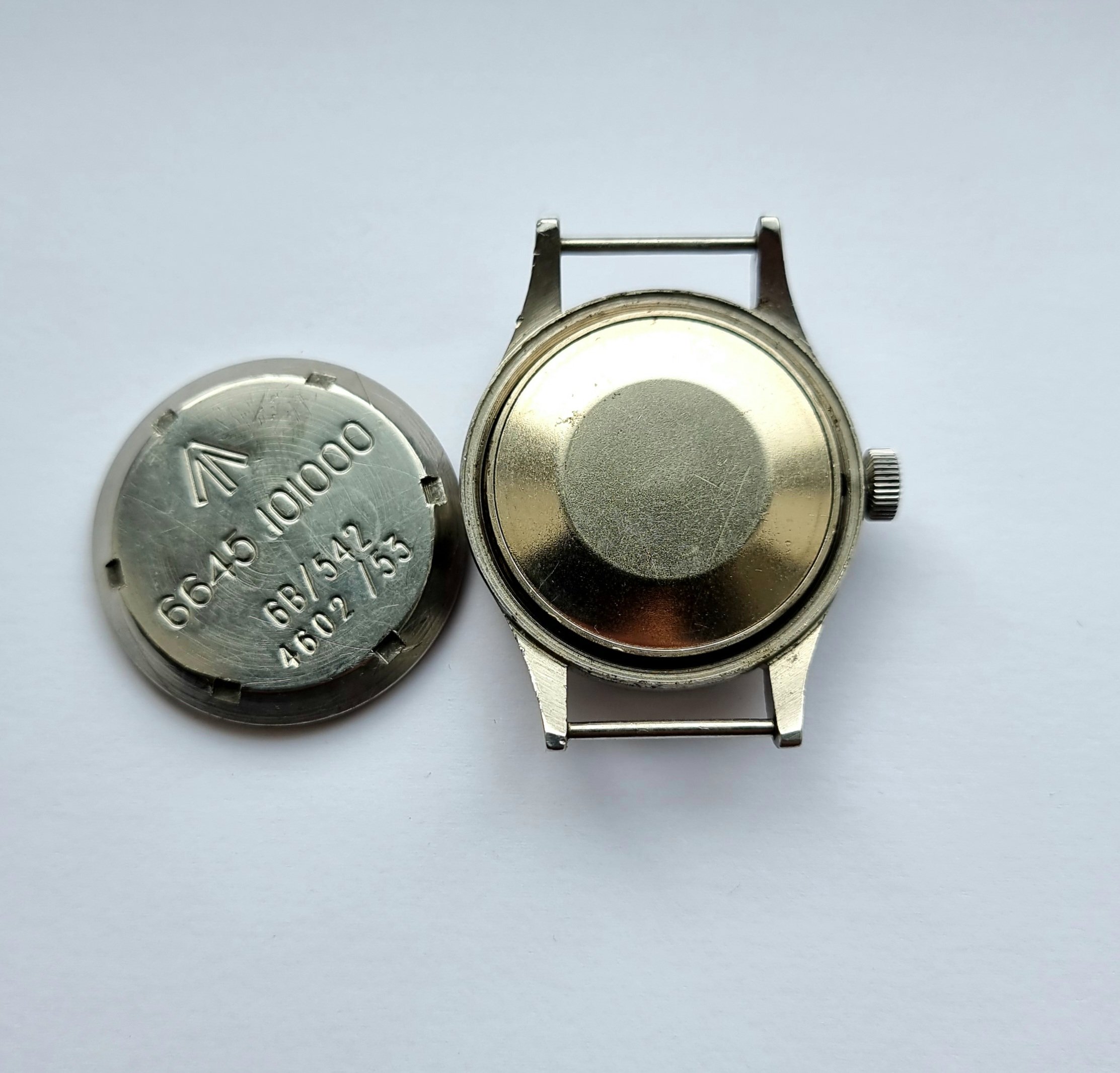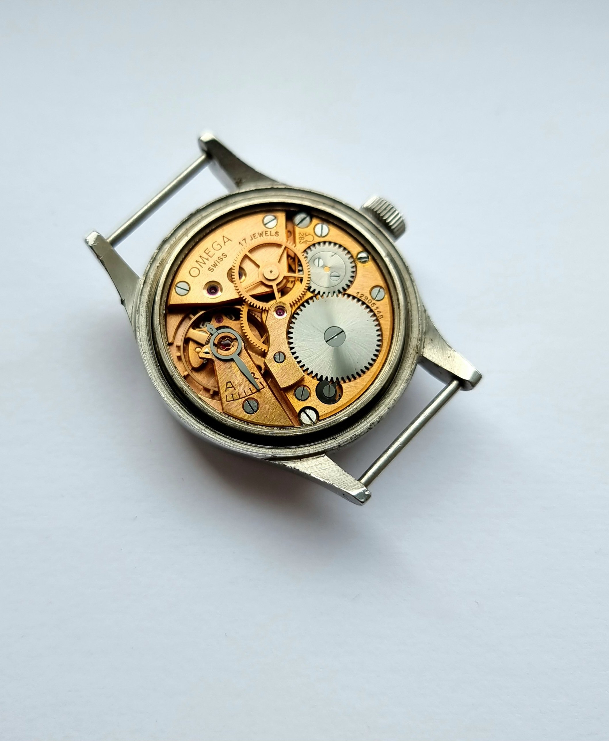 All parts are original to the watch, including the crown. There are a few small marks from wear, but they are commensurate with an issued watch of this age. The watch is 70+ years old.