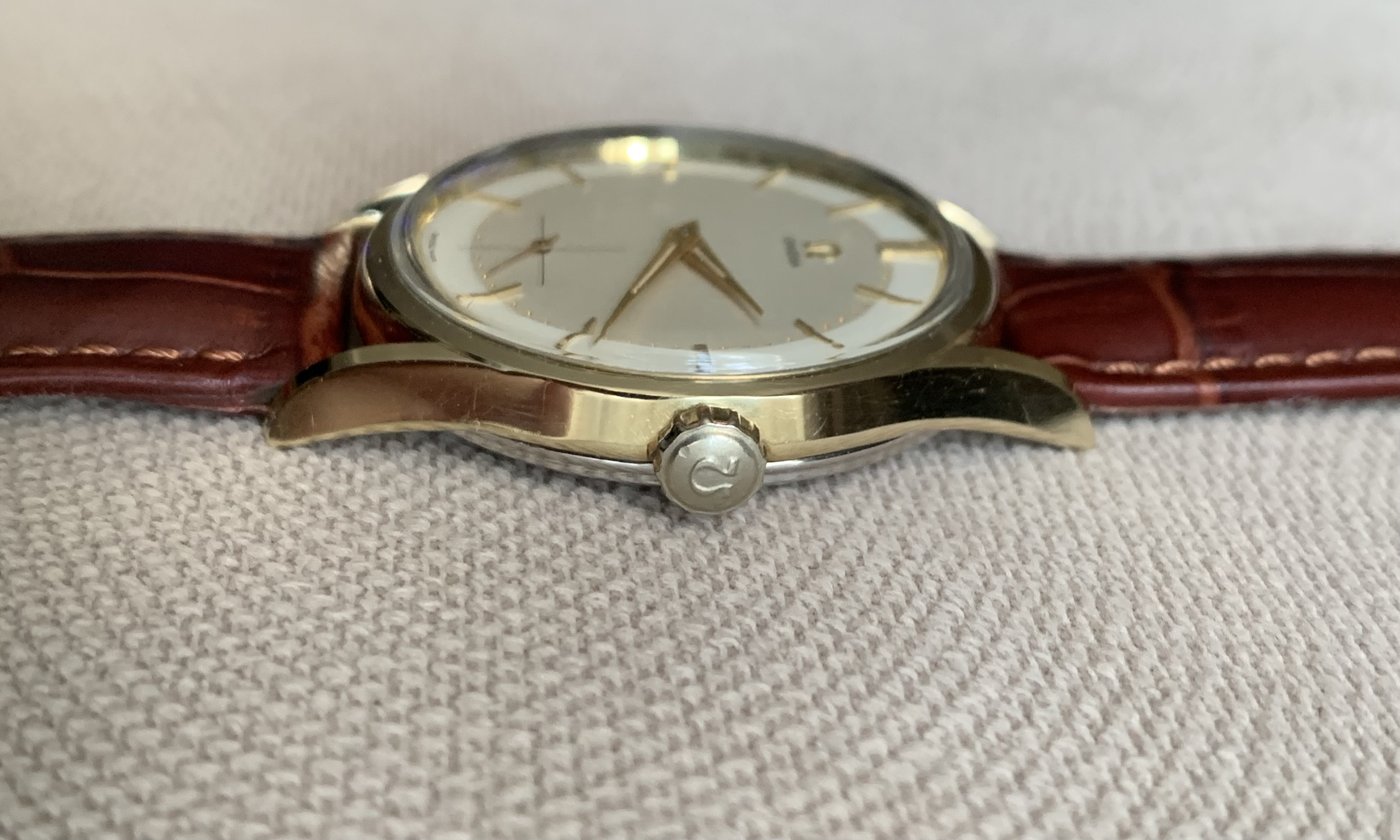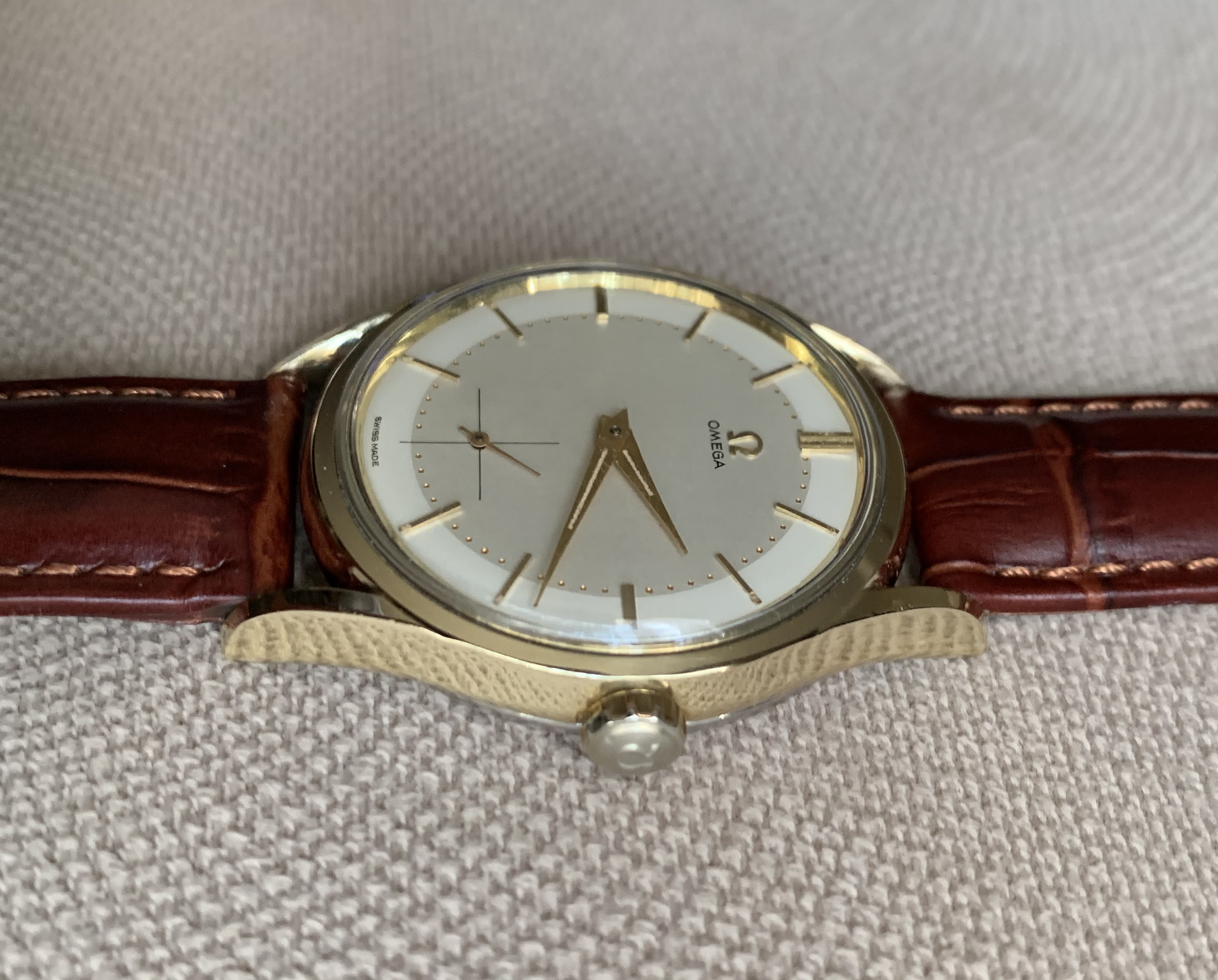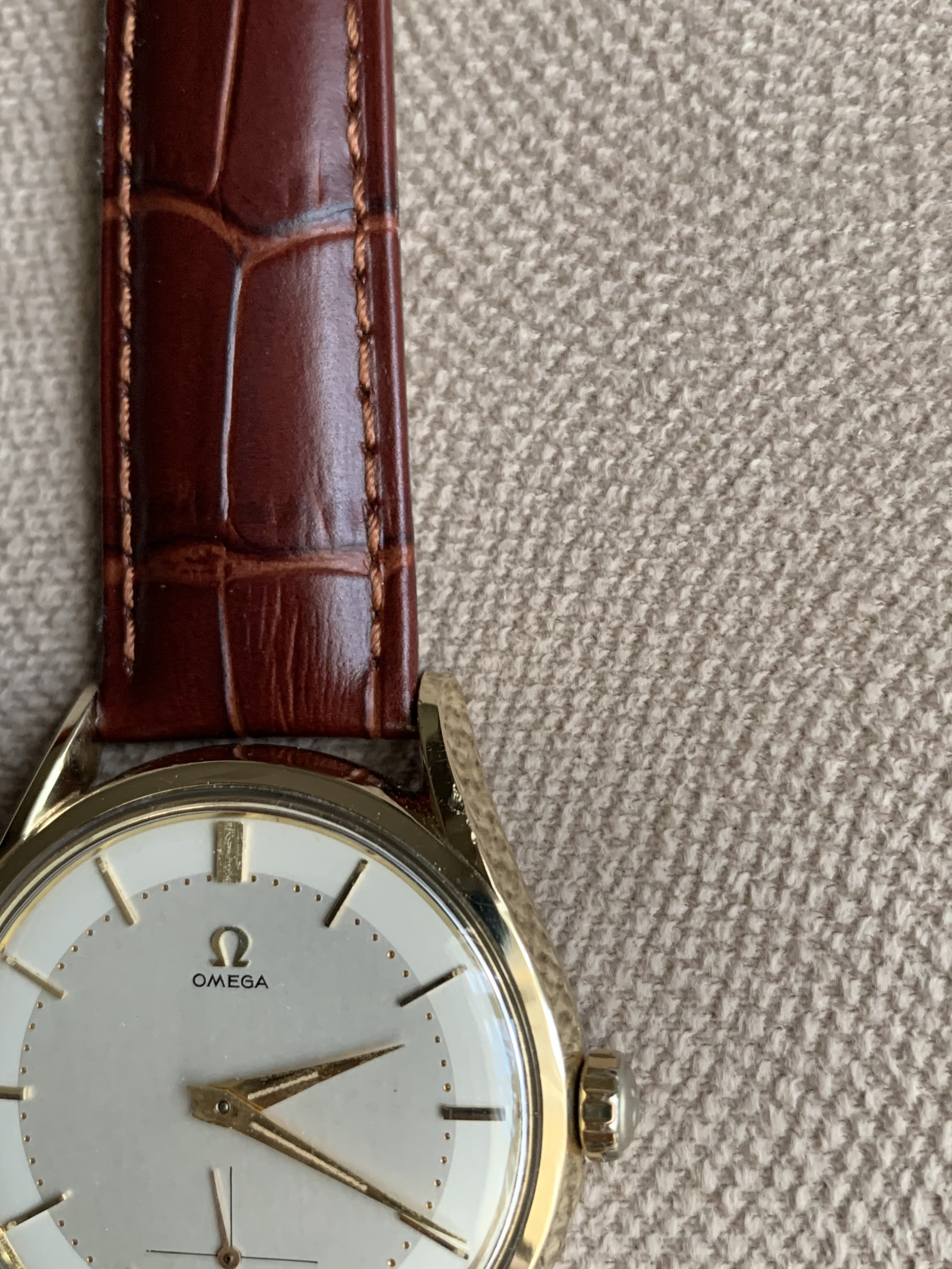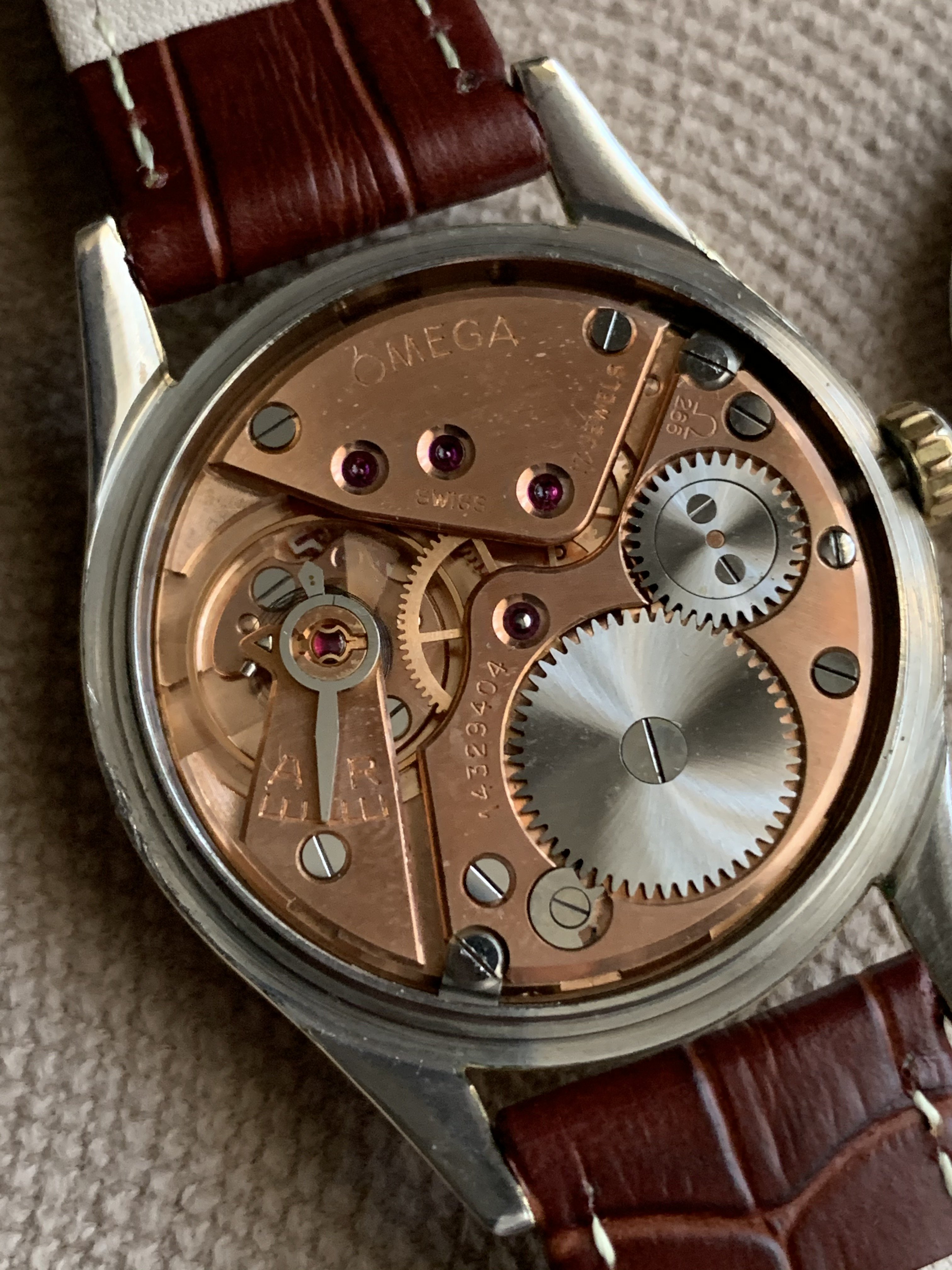 Movement is manual wind Omega caliber 266, has serial number 14329404 which means that the watch was made in 1954. Movement is recently serviced, cleaned and oiled up, runs decent.