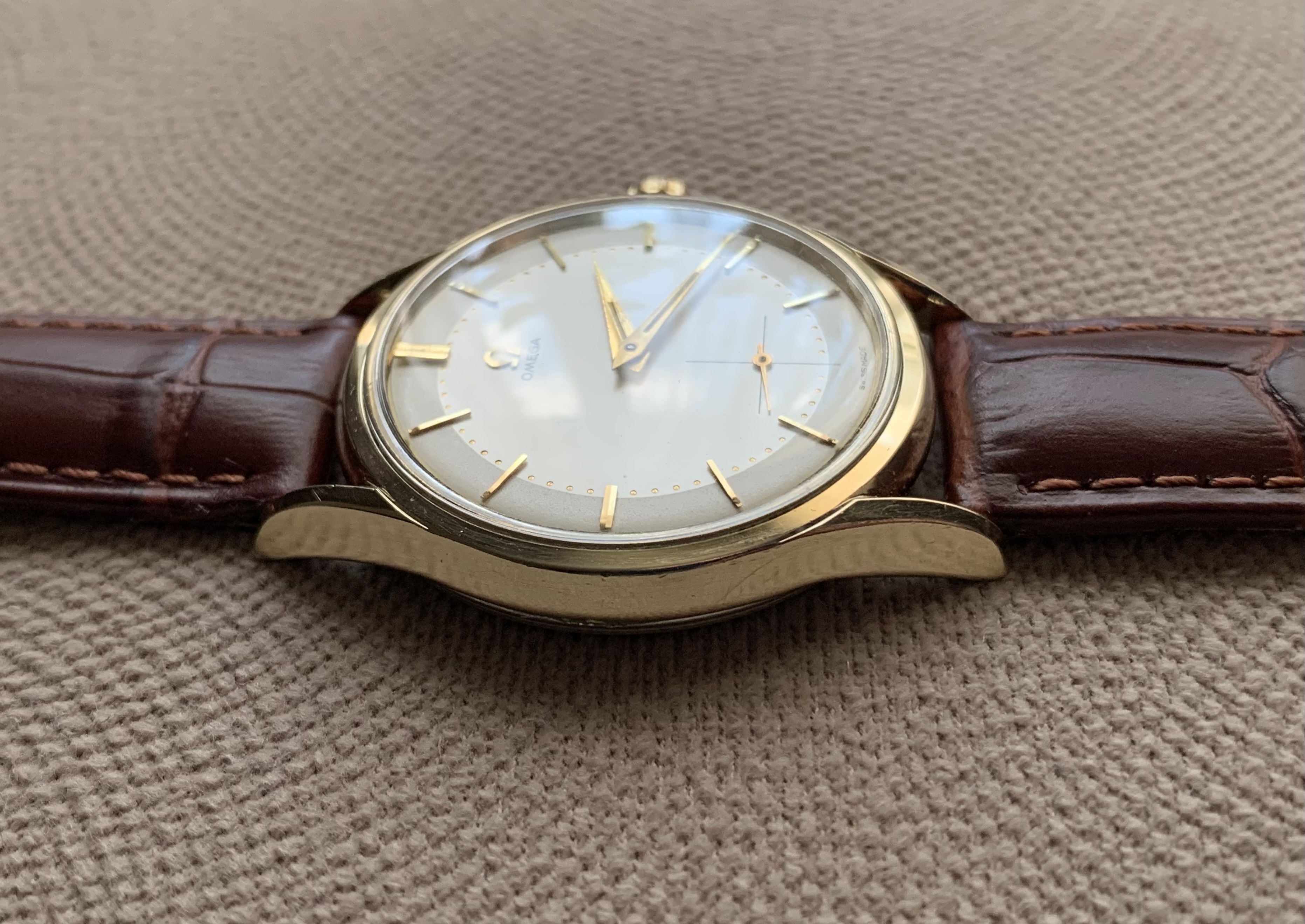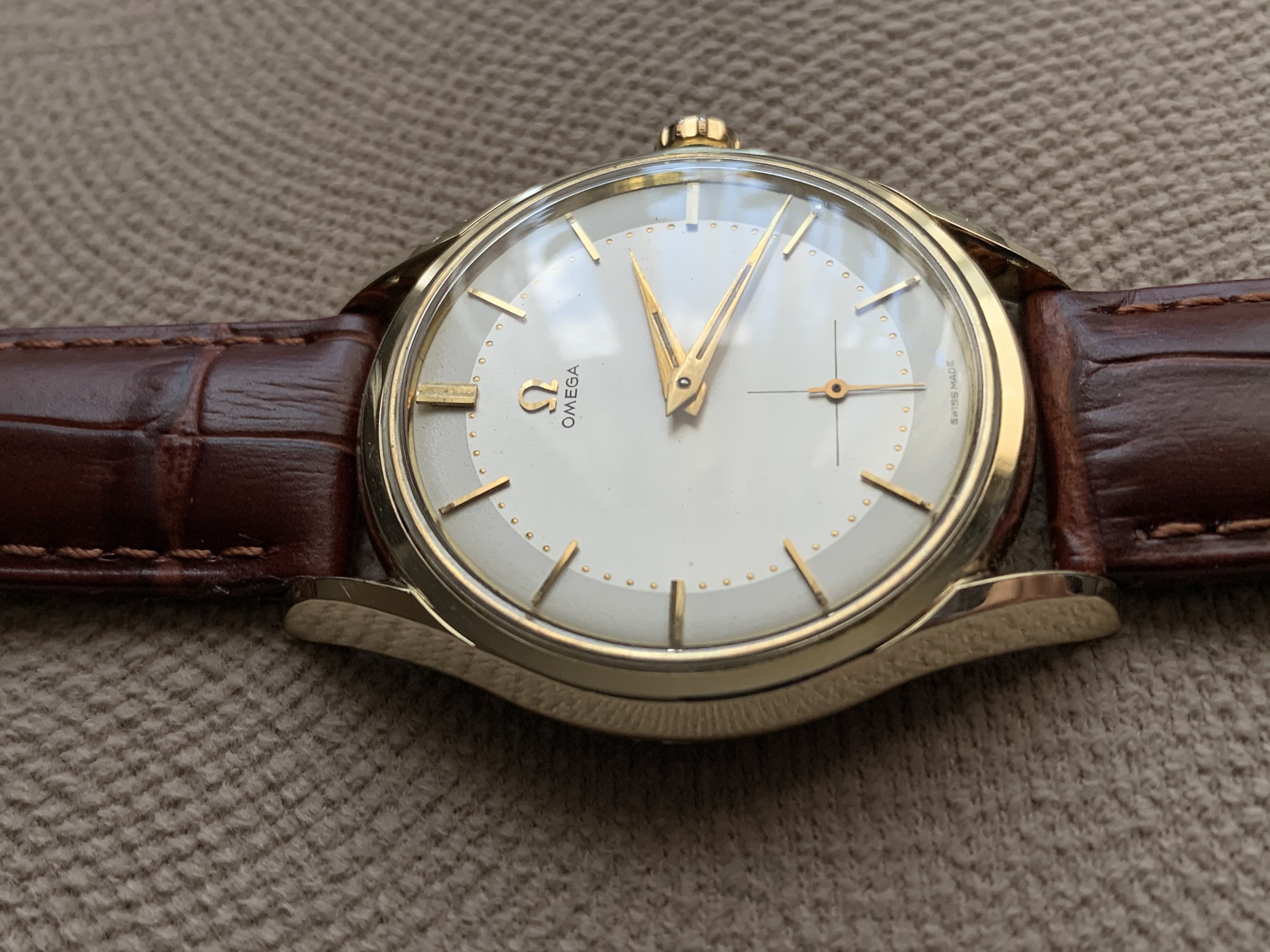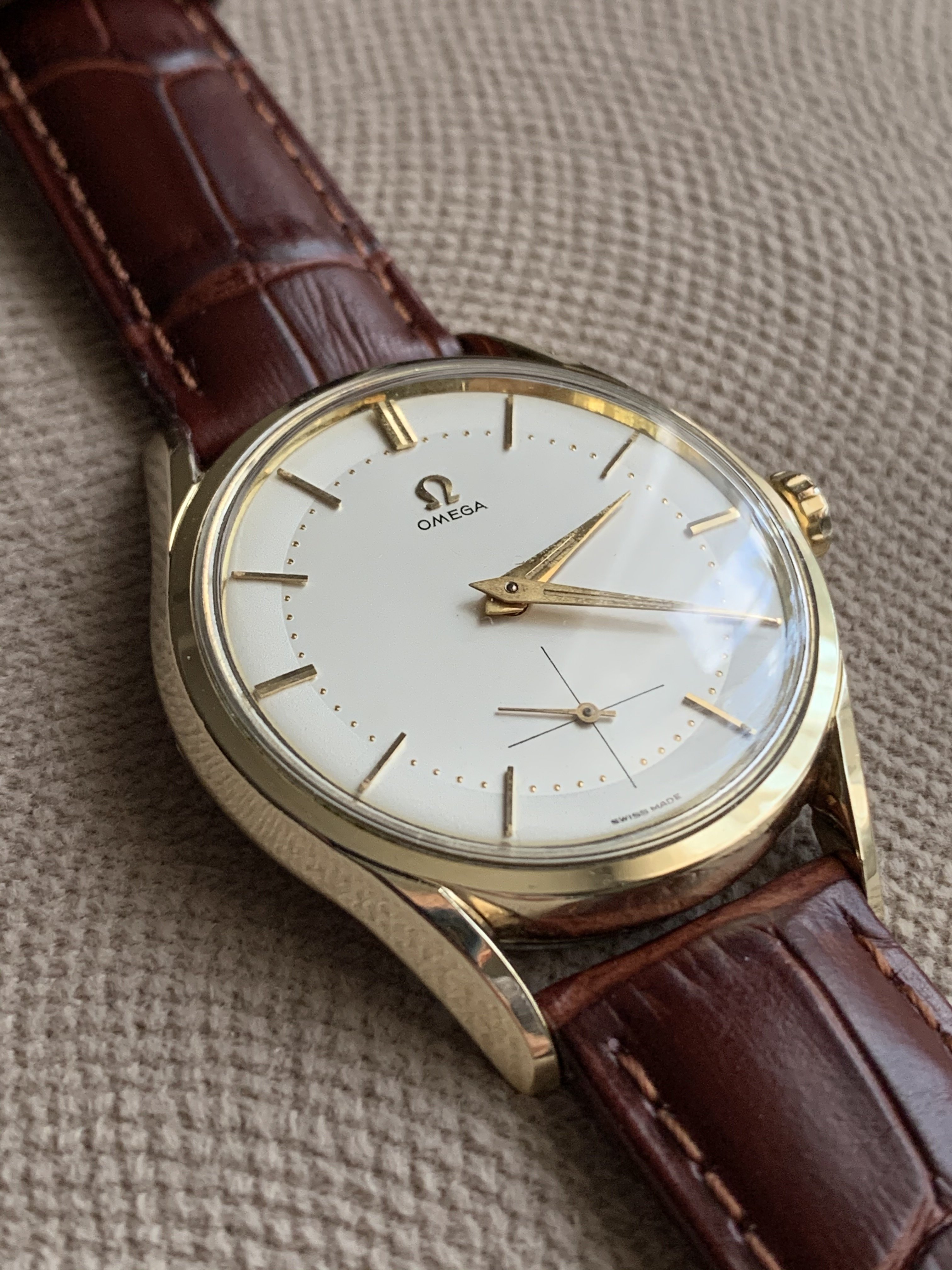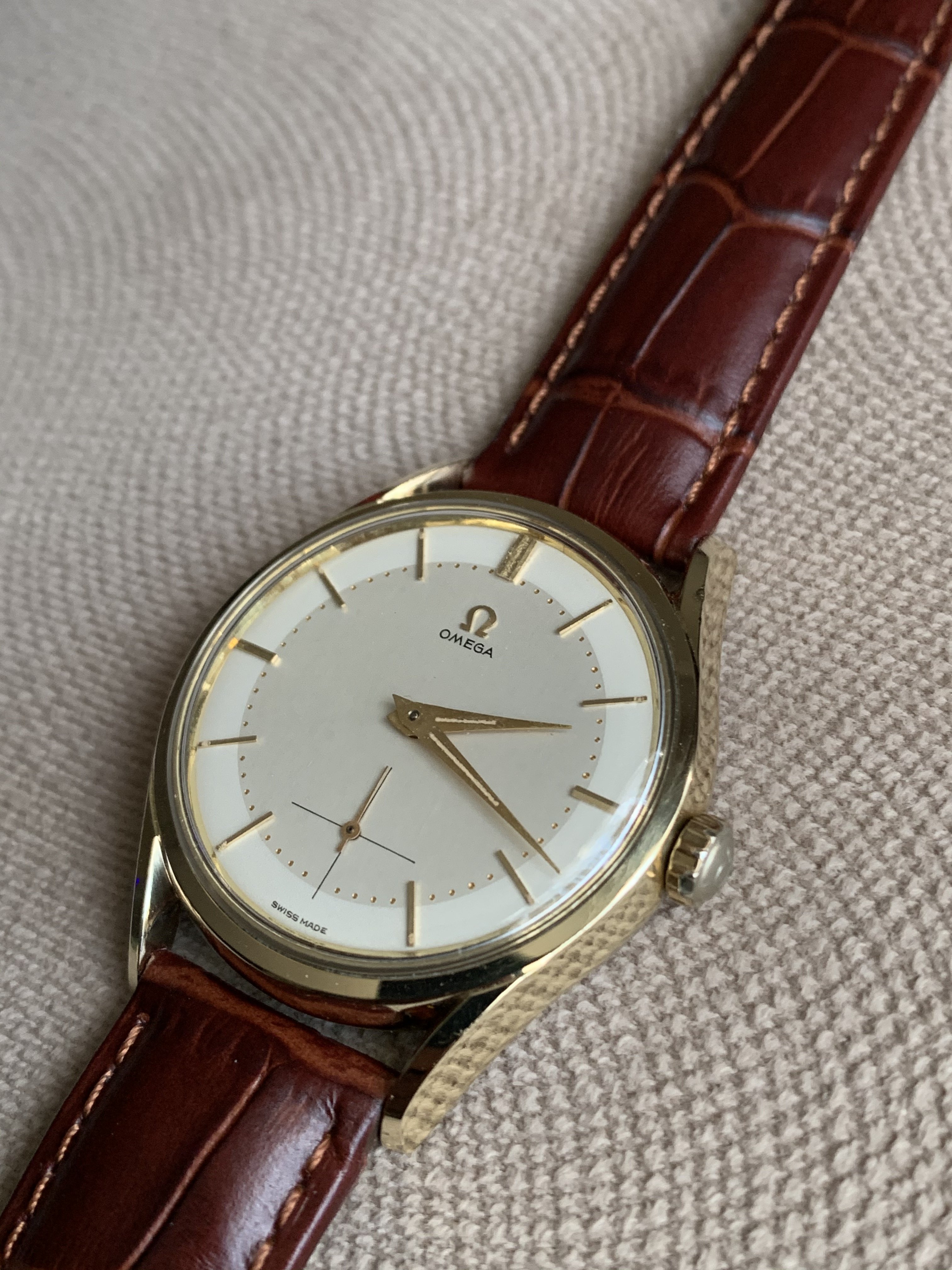Movement is manual wind Omega caliber 266, has serial number 14329404 which means that the watch was made in 1954. Movement is recently serviced, cleaned and oiled up, runs decent.