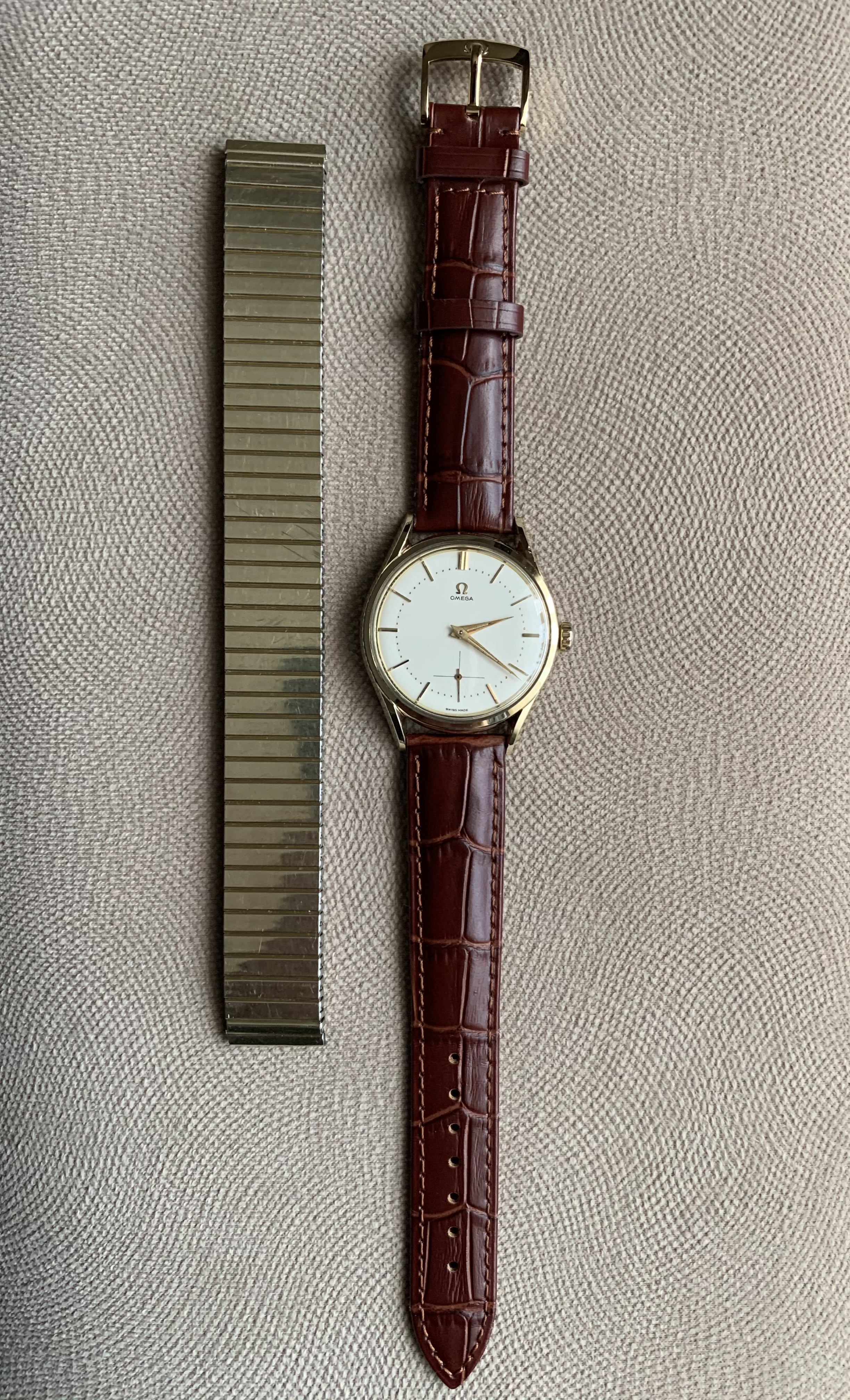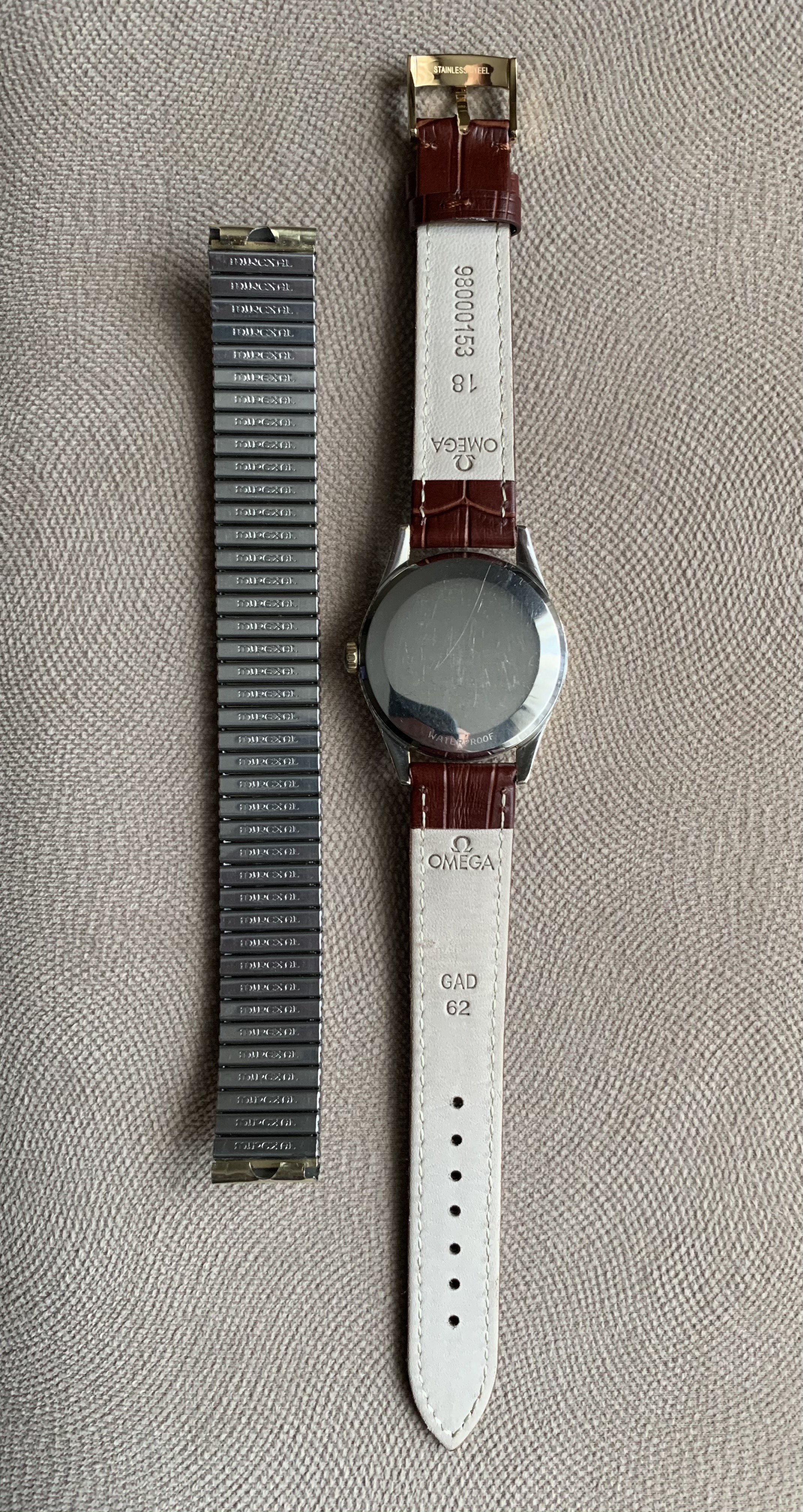 First strap is a stretch goldtone stainless steel which is in great condition and gives the watch a vintage look. Second one is a brand new Omega brown leather strap with gold toned buckle.