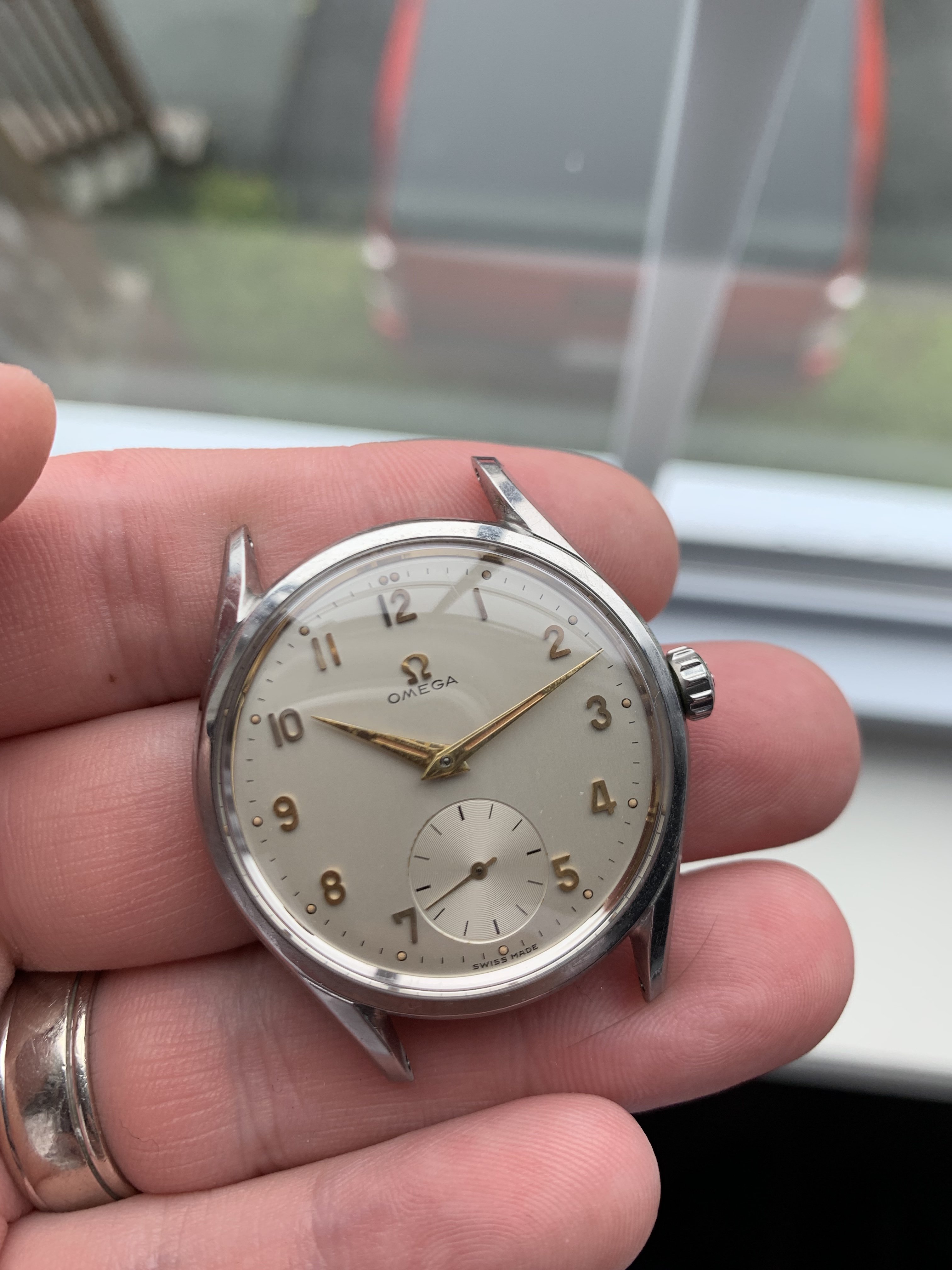 Dial is original and spotless. Few raised numbers have discoloured a little. Hands have some corrosion on them. Radium lume.