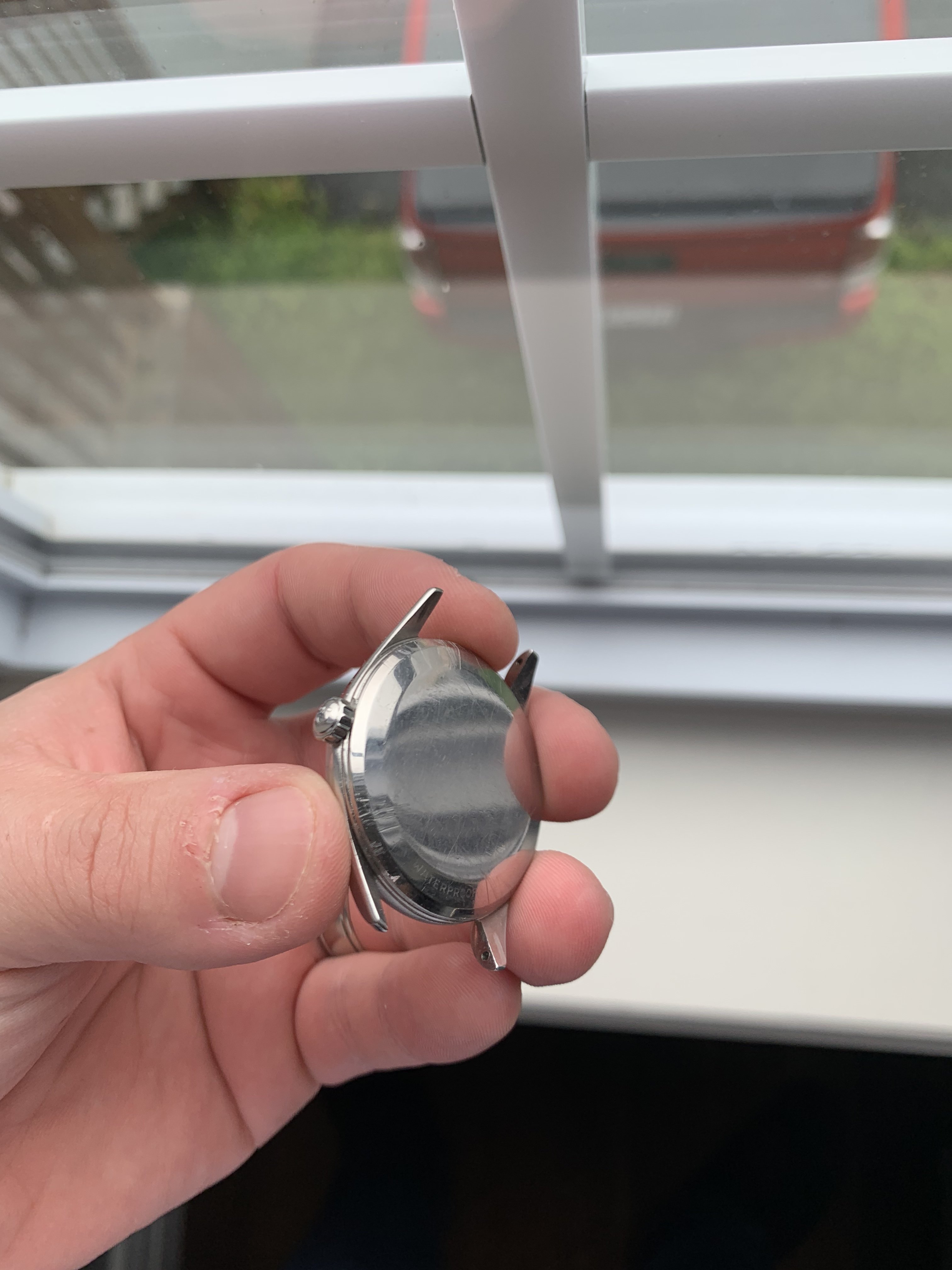 36mm case unpolished and 18mm lug. Caseback has scratches to do incorrect use of caseback knife. Please see photos.