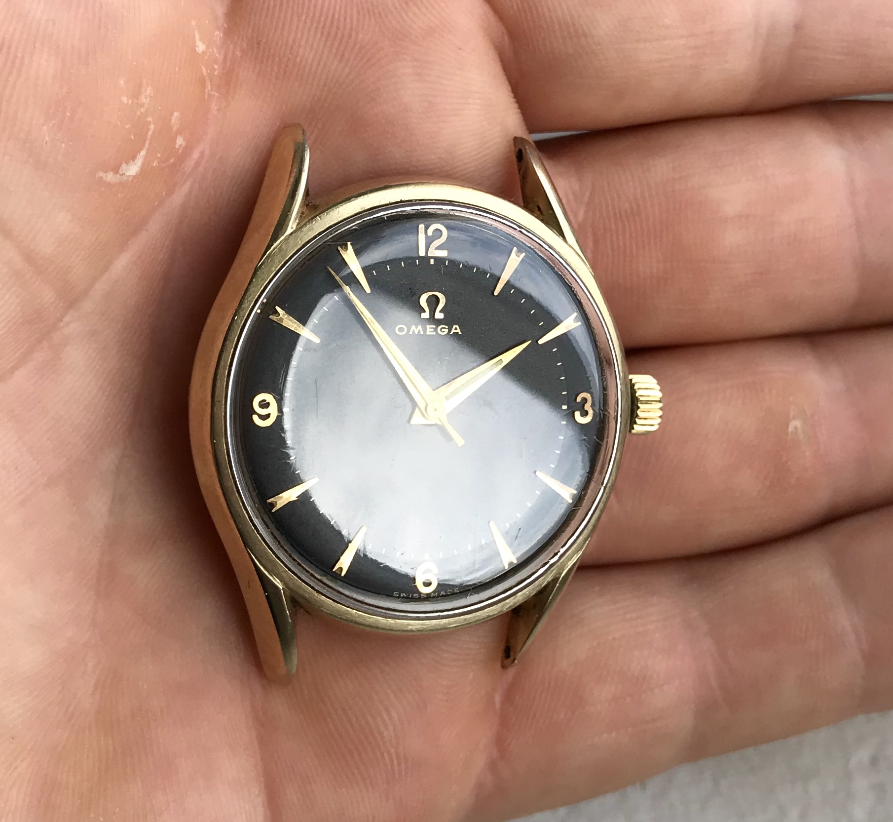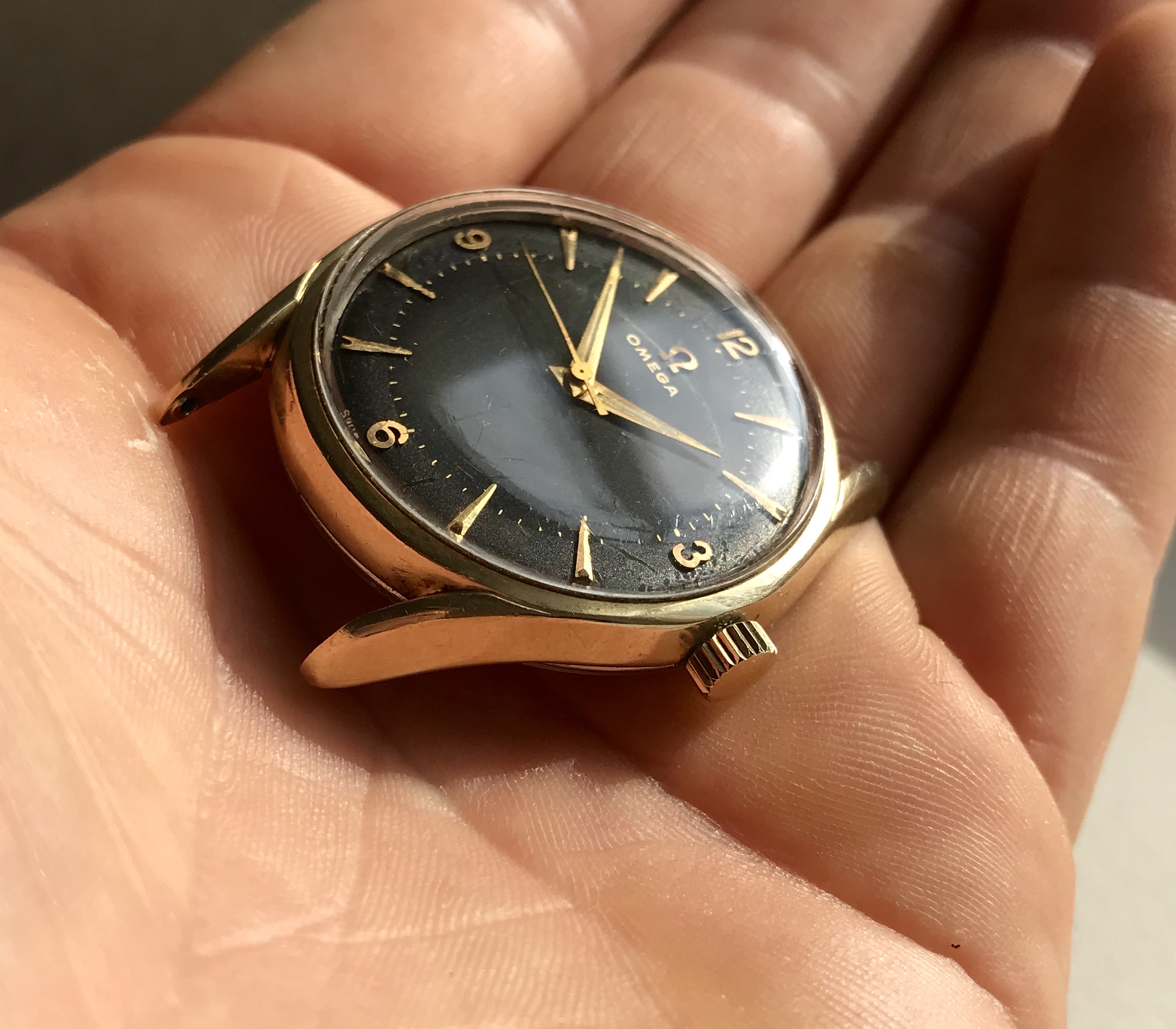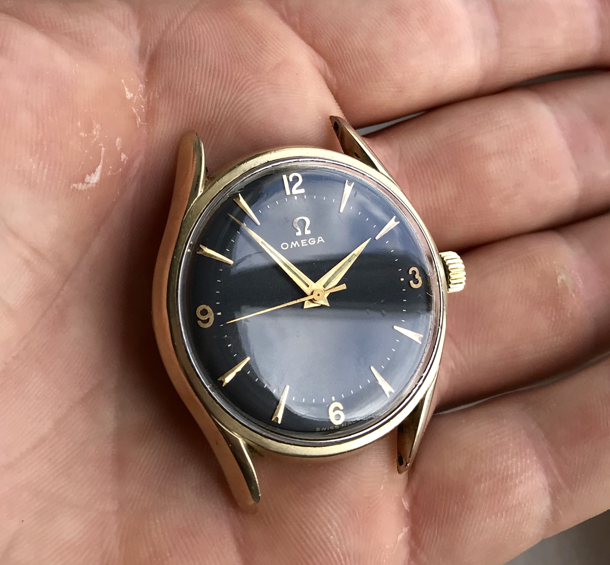 ·Omega 2792-4 from 1957, gold capped with stunning black two-tone gilt dial.