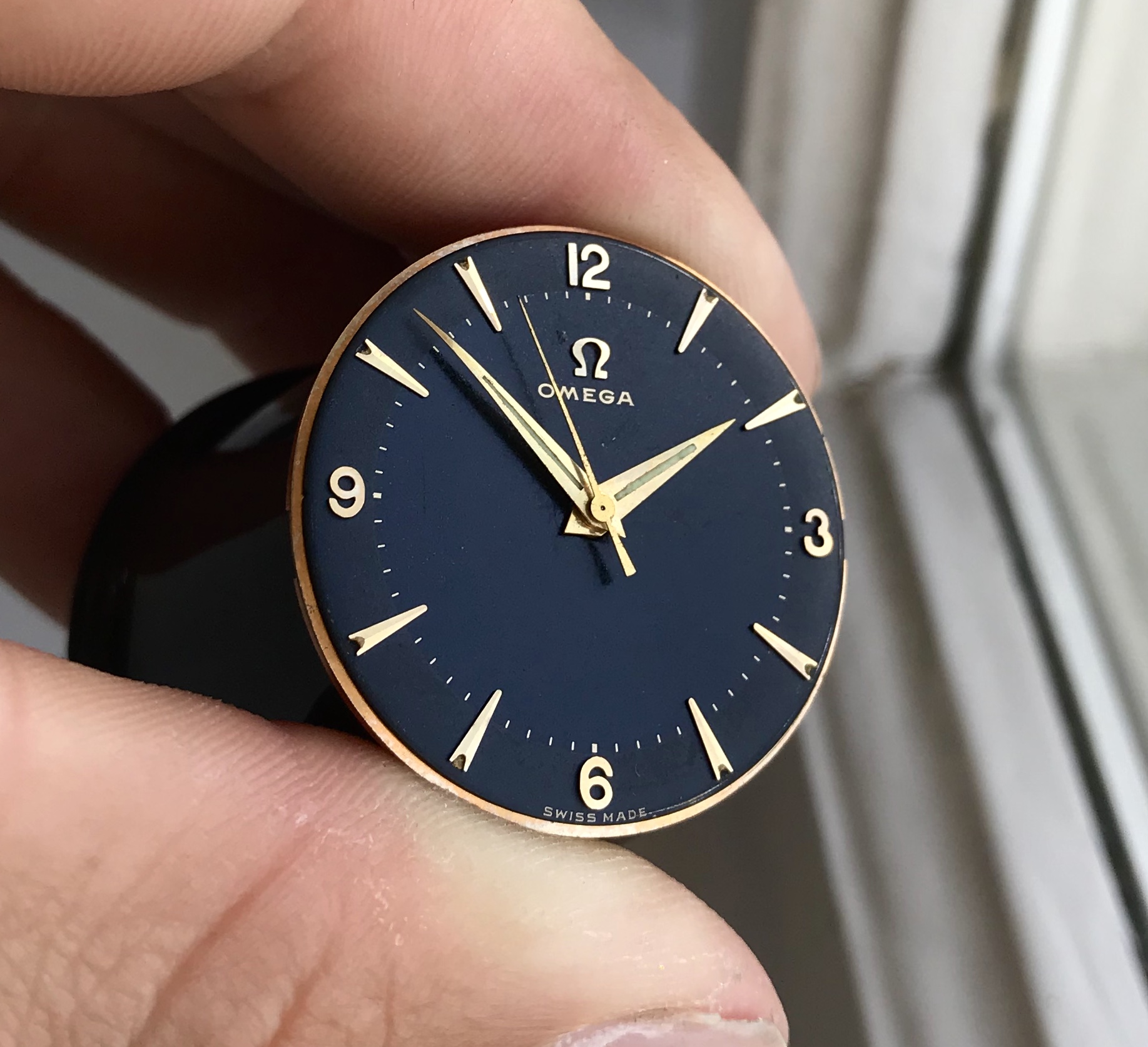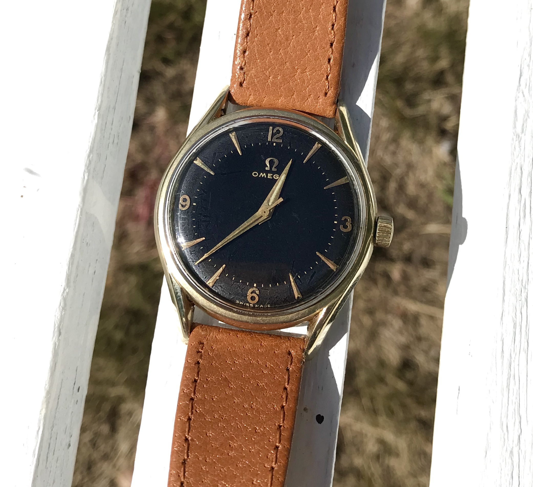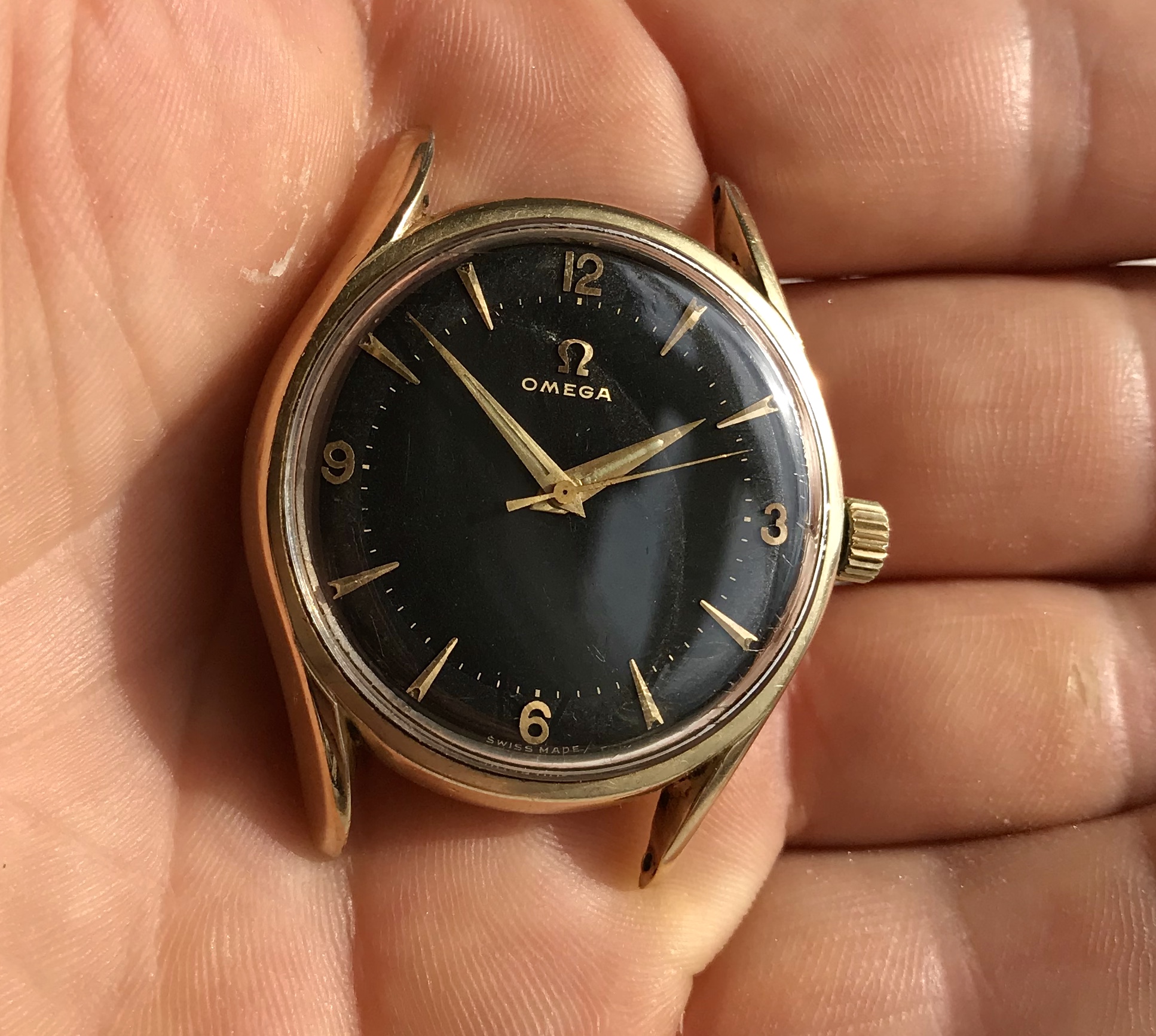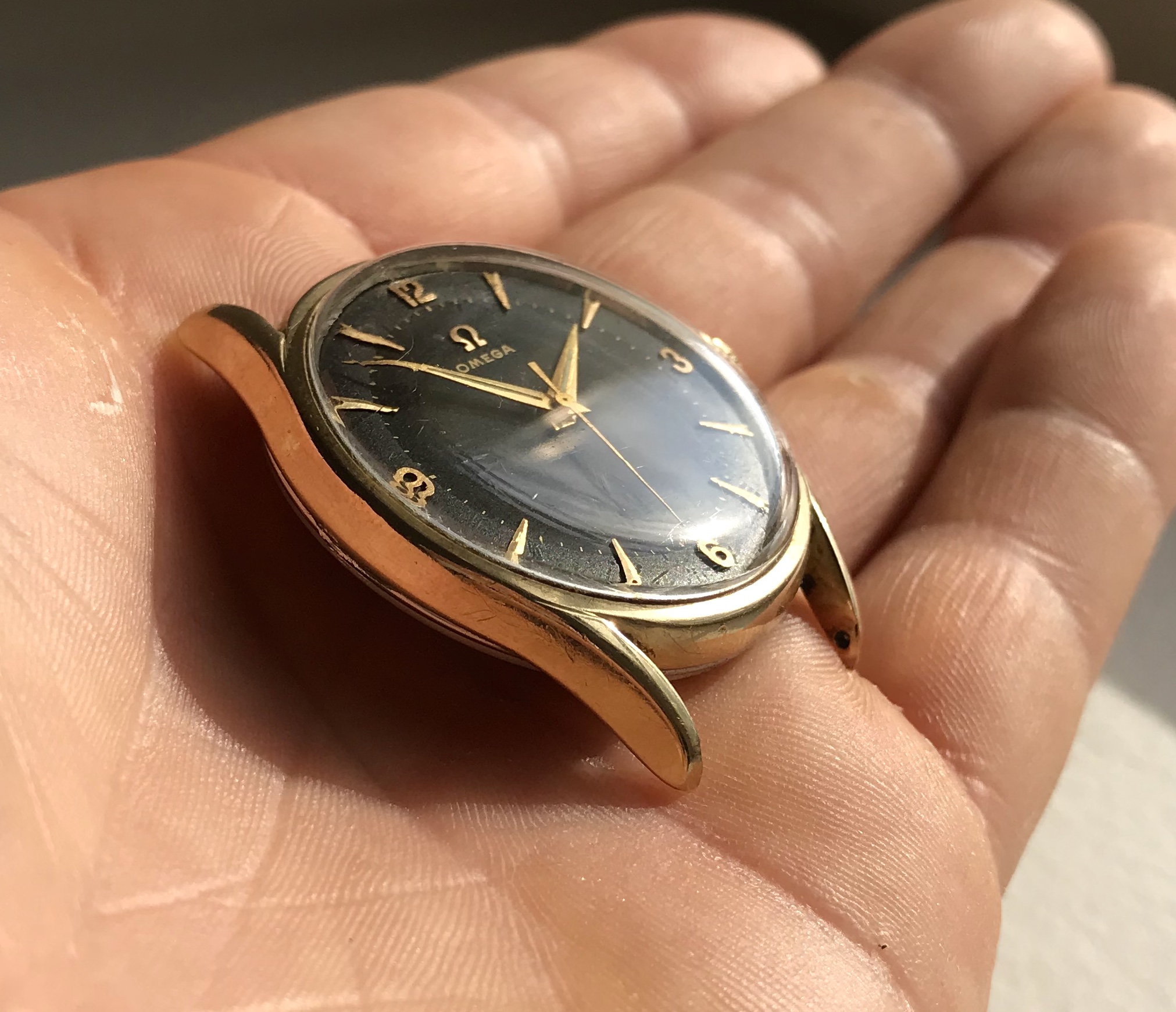 ·Omega 2792-4 from 1957, gold capped with stunning black two-tone gilt dial.