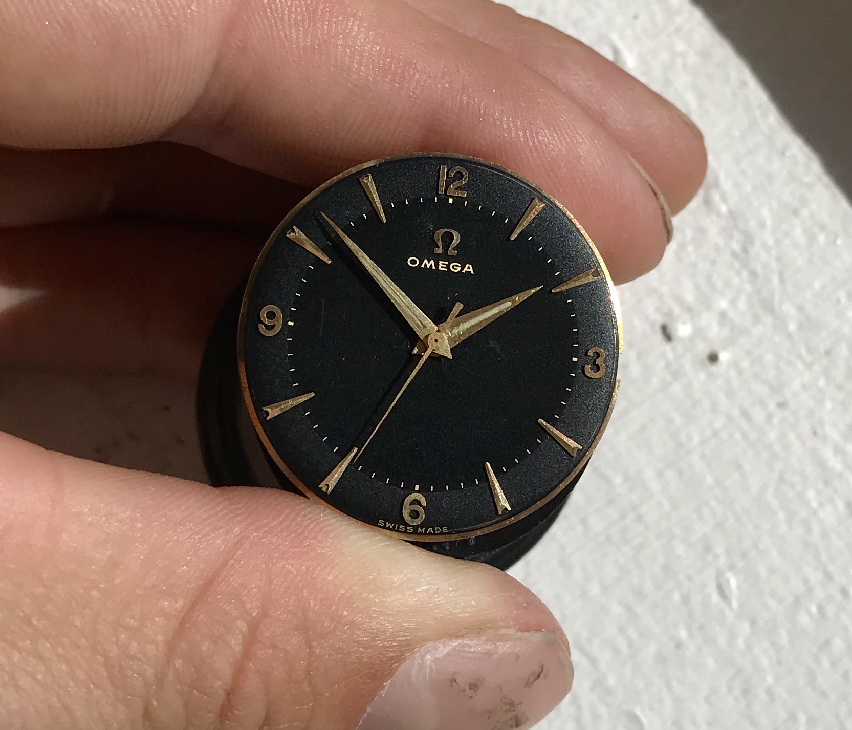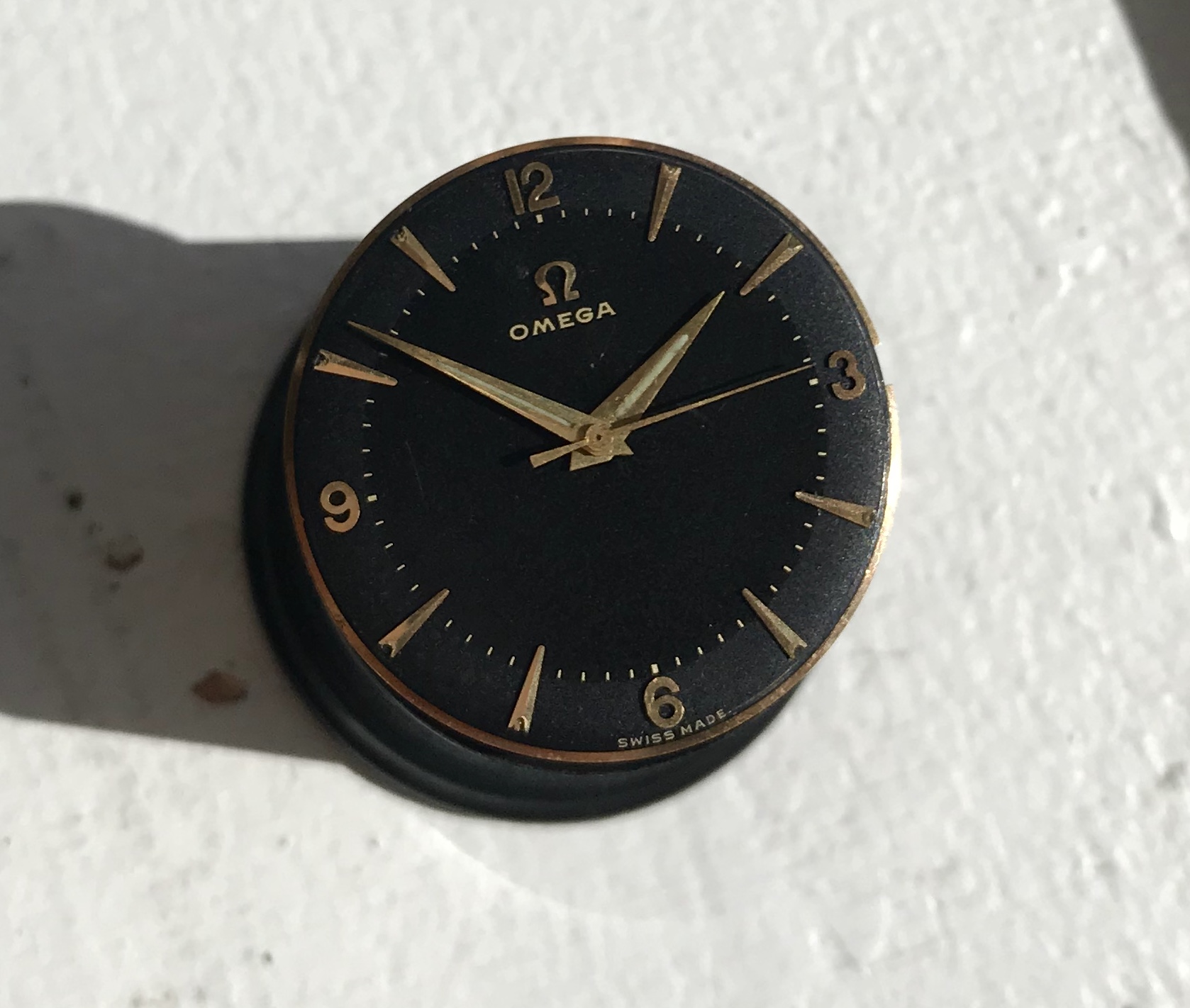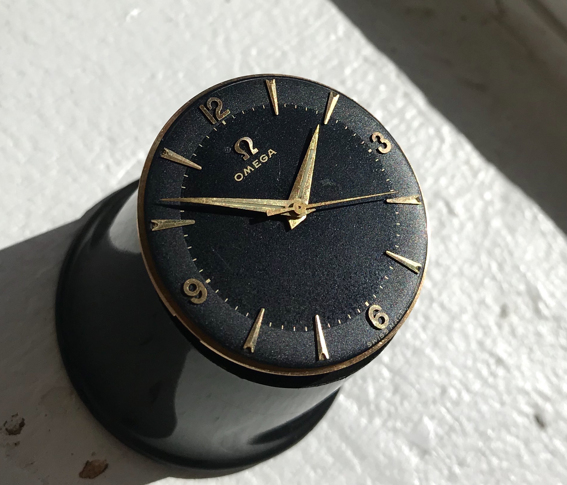 Black two-tone gilt dial in excellent condition, only flaws I found is a scratch at 9 o'clock, a mark right from the center and a small bubble left of the applied logo.