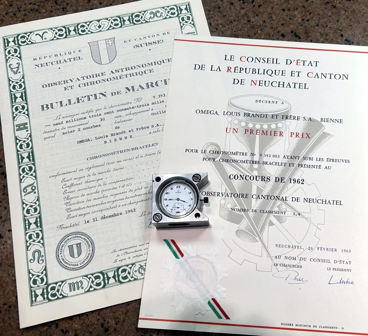 This chronometer is renowned for its exceptional precision and as such, keeps excellent time. As an absolute rarity with only a limited number ever produced, it comes with an official Bulletin de Marche and a competition certificate from Neuchatel 1962, where it proudly secured the first prize, making it a highly sought-after collector’s piece and greatly enhancing its value and significance.