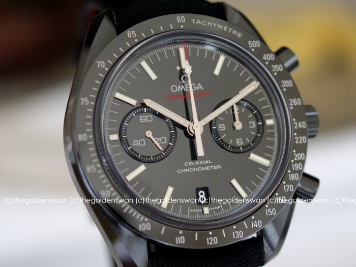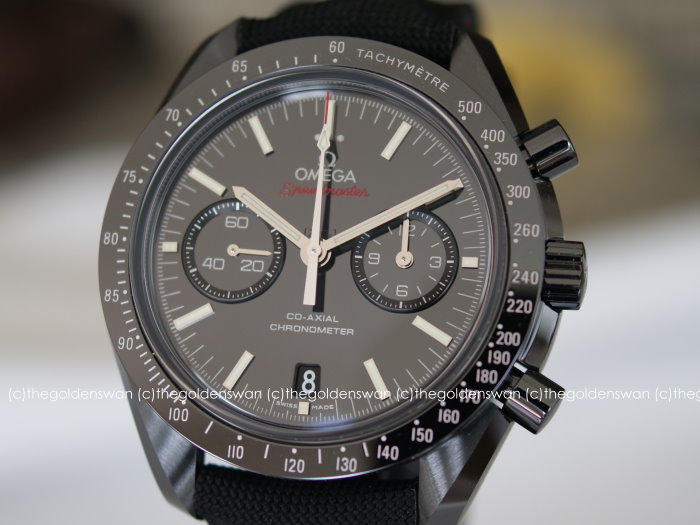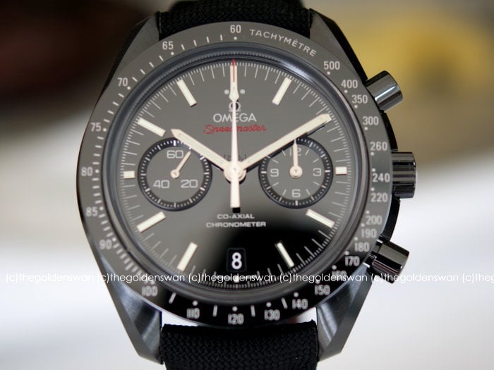 ·Omega 311.92.44.51.01.003 Dark Side of the Moon, 31192445101003, black ceramic case with a fabric strap and tang buckle, automatic Omega caliber 9300 co axial chronometer, 60 hour power reserve, black dial with super luminescent hands and hour markers, chromium nitride tachymeter scale, sapphire crystal, display back, water resistant, size 44mm, thickness 13.25mm, Unworn, New with Box and Papers