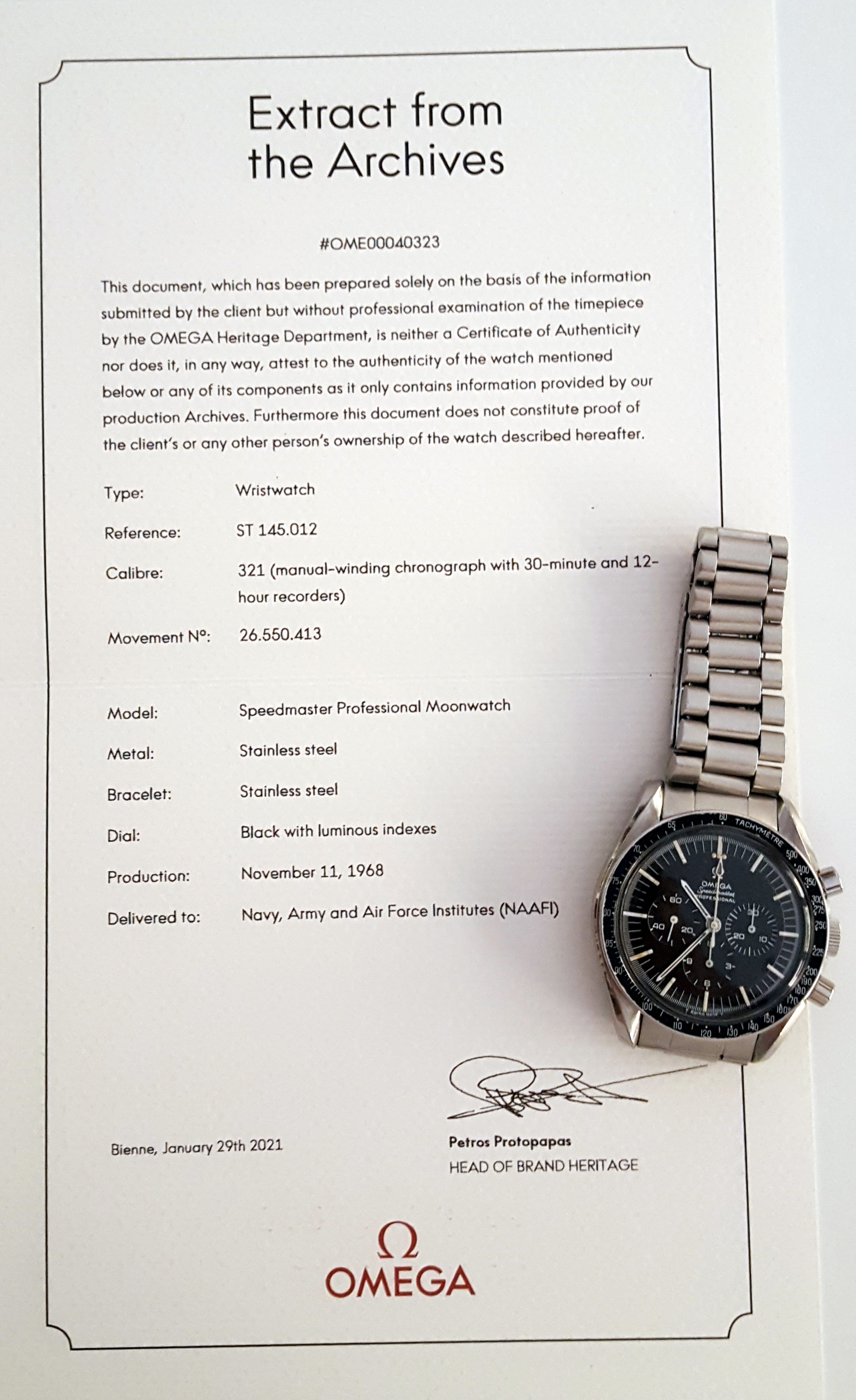 ·A rare and very special collector’s watch - the last of the Speedmasters that went to the moon, the last of the famous calibre 321 ‘pillar-wheel’ versions. This version as worn on the wrists of astronauts Michael Collins (Apollo 11), Alan Shepard (Apollo 14) and Tom Stafford (Apollo-Soyuz).