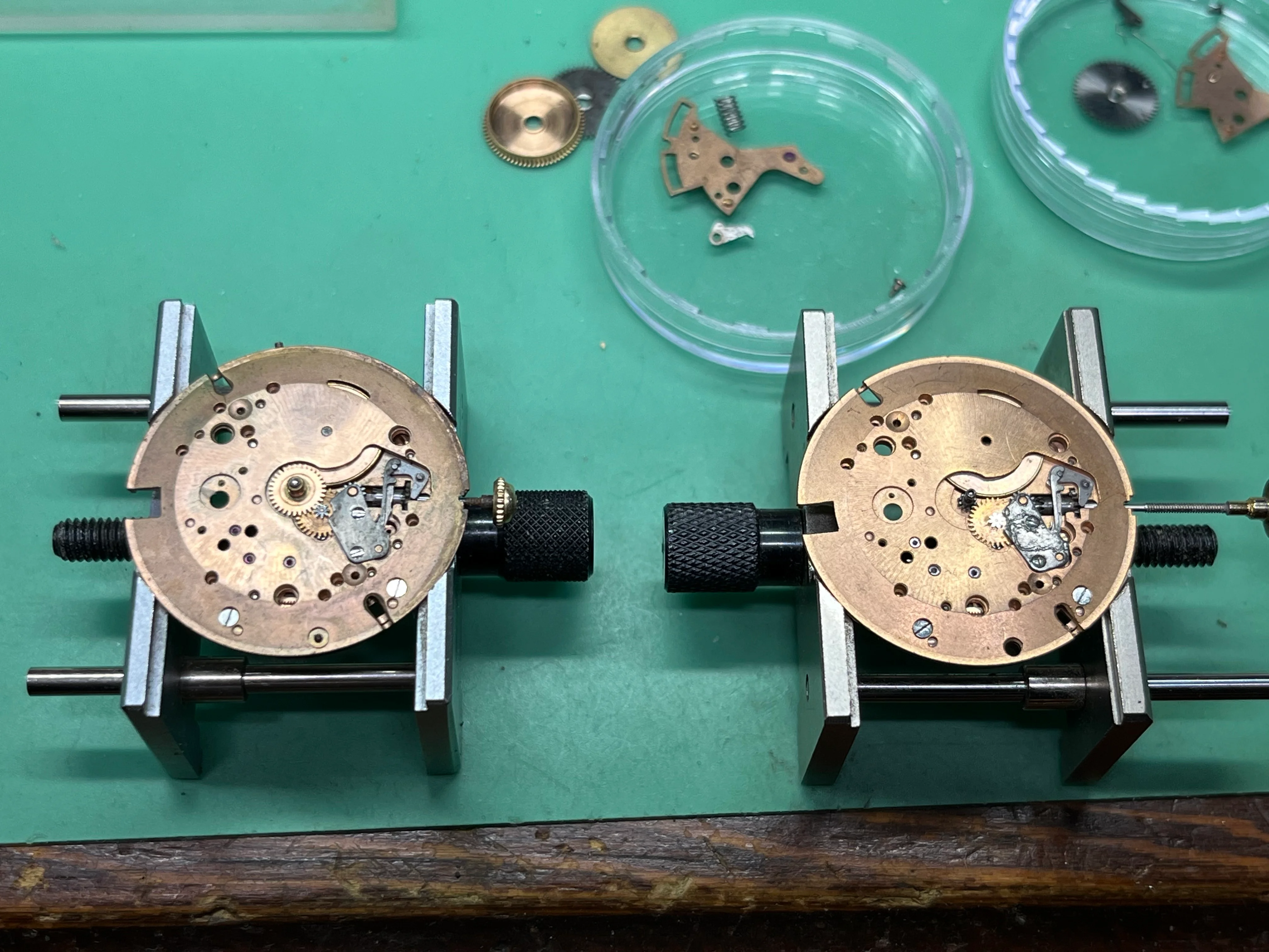 The project also started with one movement and has expanded into a dozen or more movements. Over the last few years these got mixed together. Parts swapped in hopes of coming up with some wearable watches.