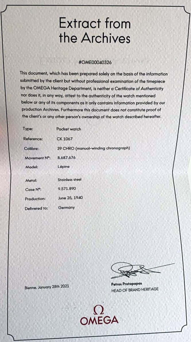 路A beautiful and rare Omega reference CK1067, 39 CHRO pocket chronograph, delivered to Germany in June 1940 (immediately before the Battle of Britain!).