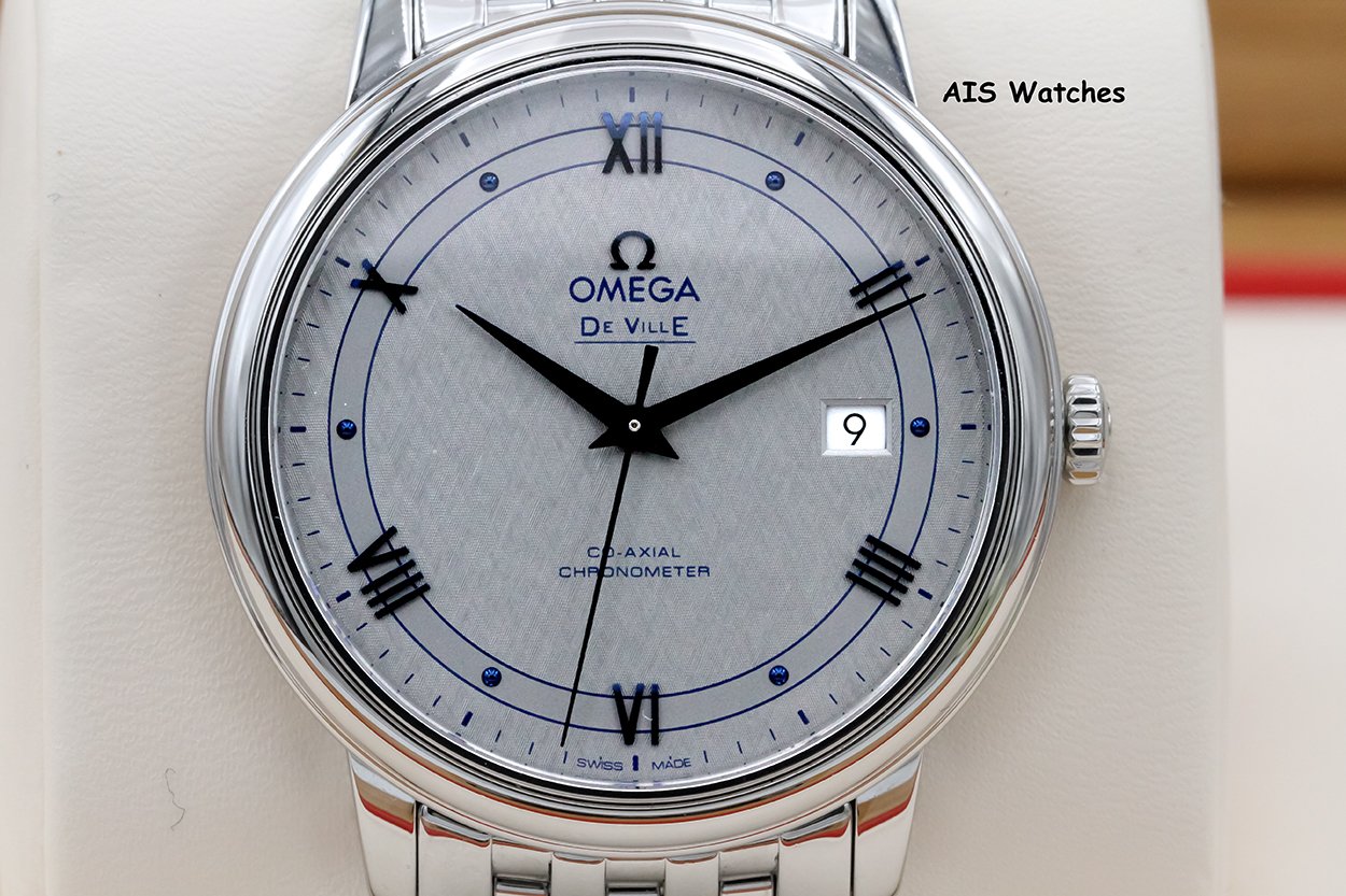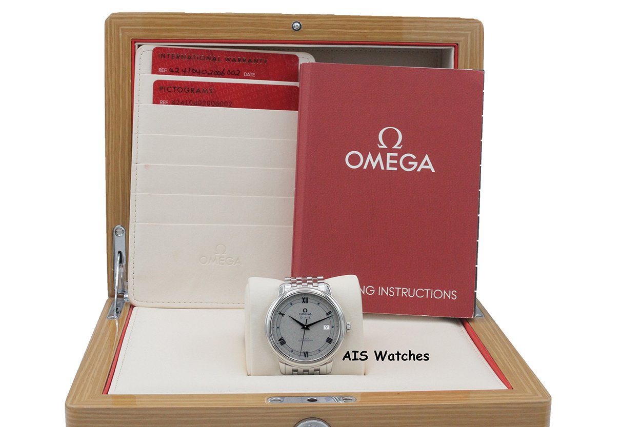 Up for sale is an Omega 424.10.40.20.02.001 De Ville Prestige Co-Axial 39.5MM Vintage Silver Dial Box & Papers. The timepiece is in excellent condition.