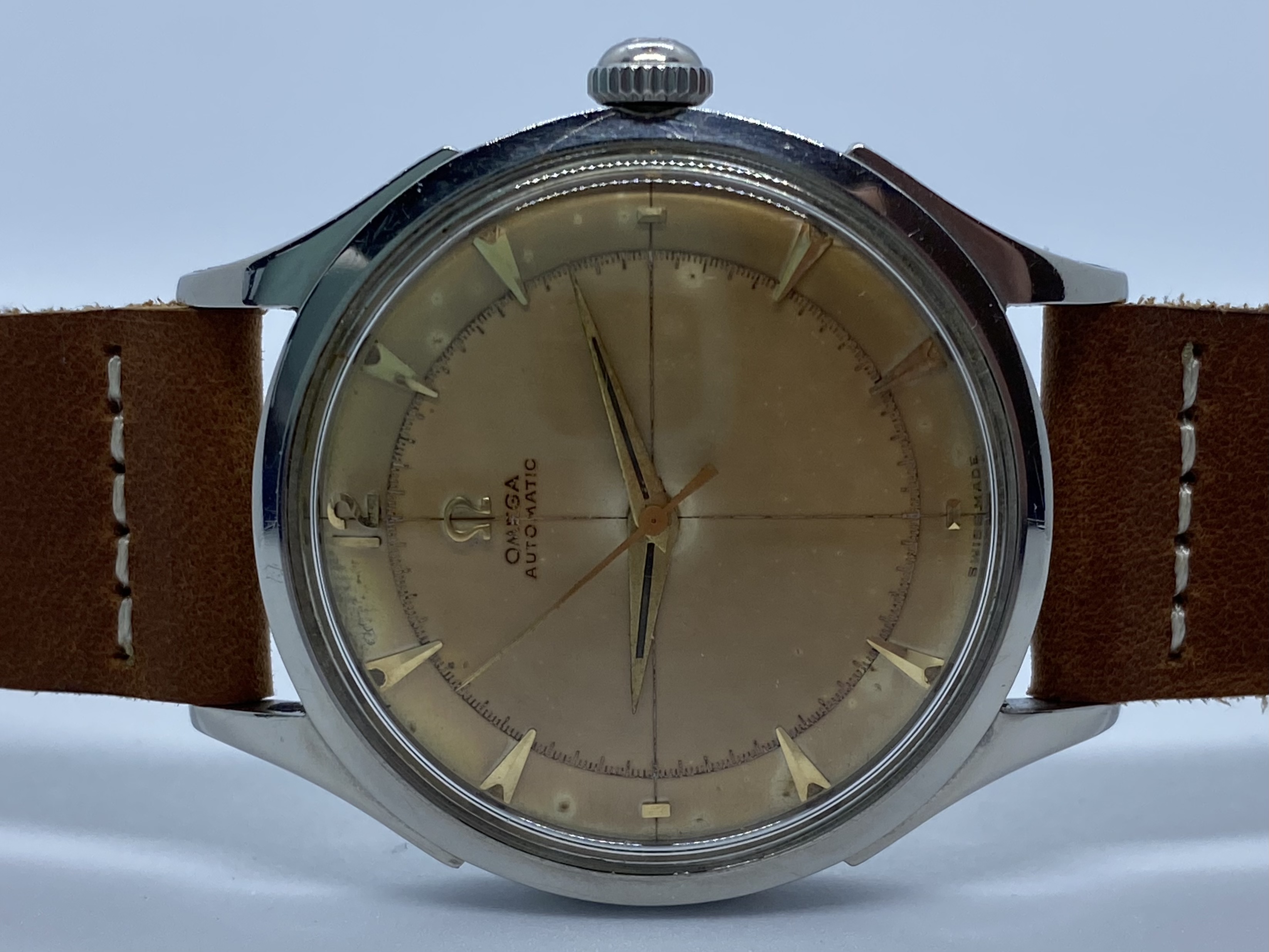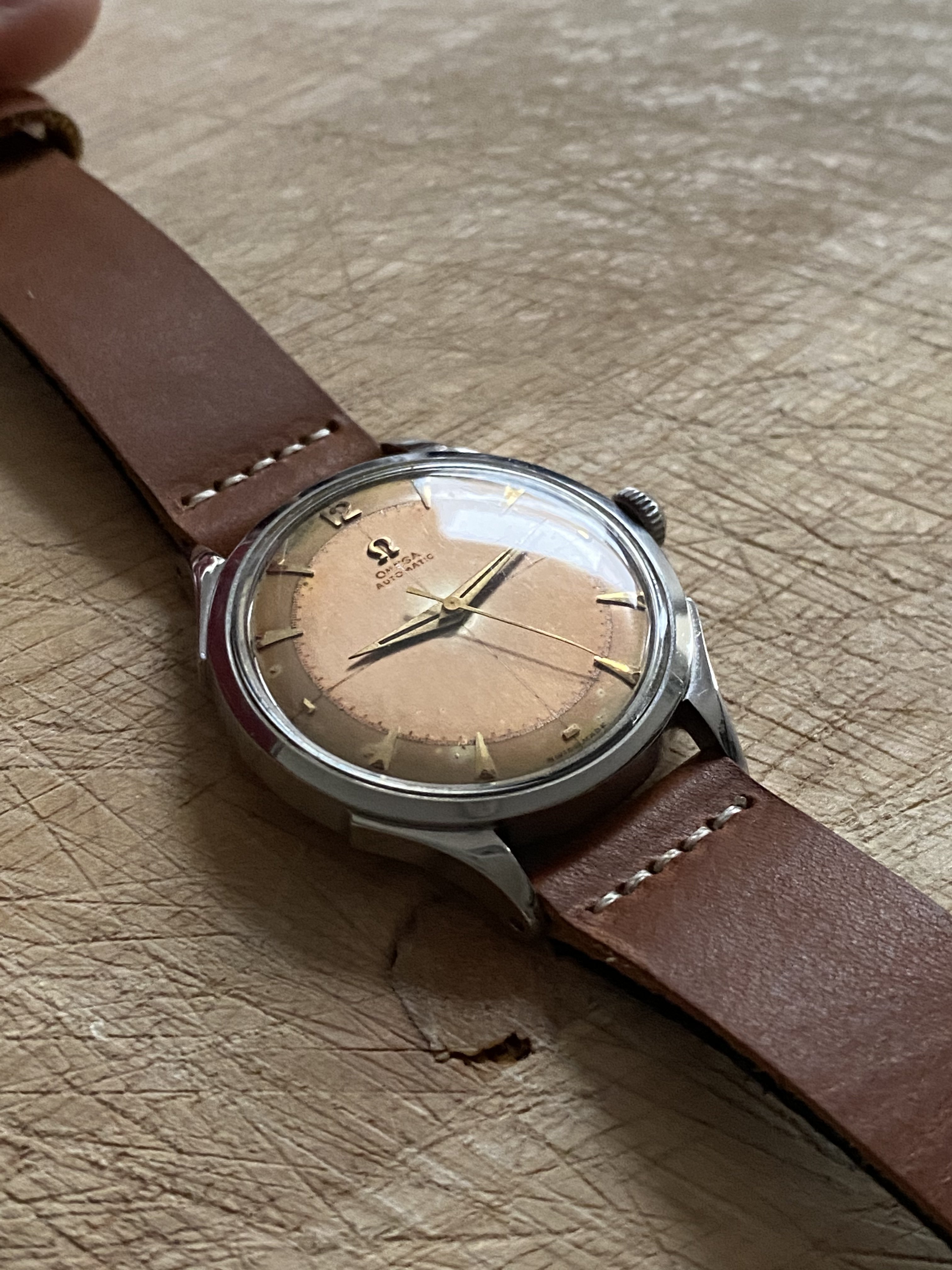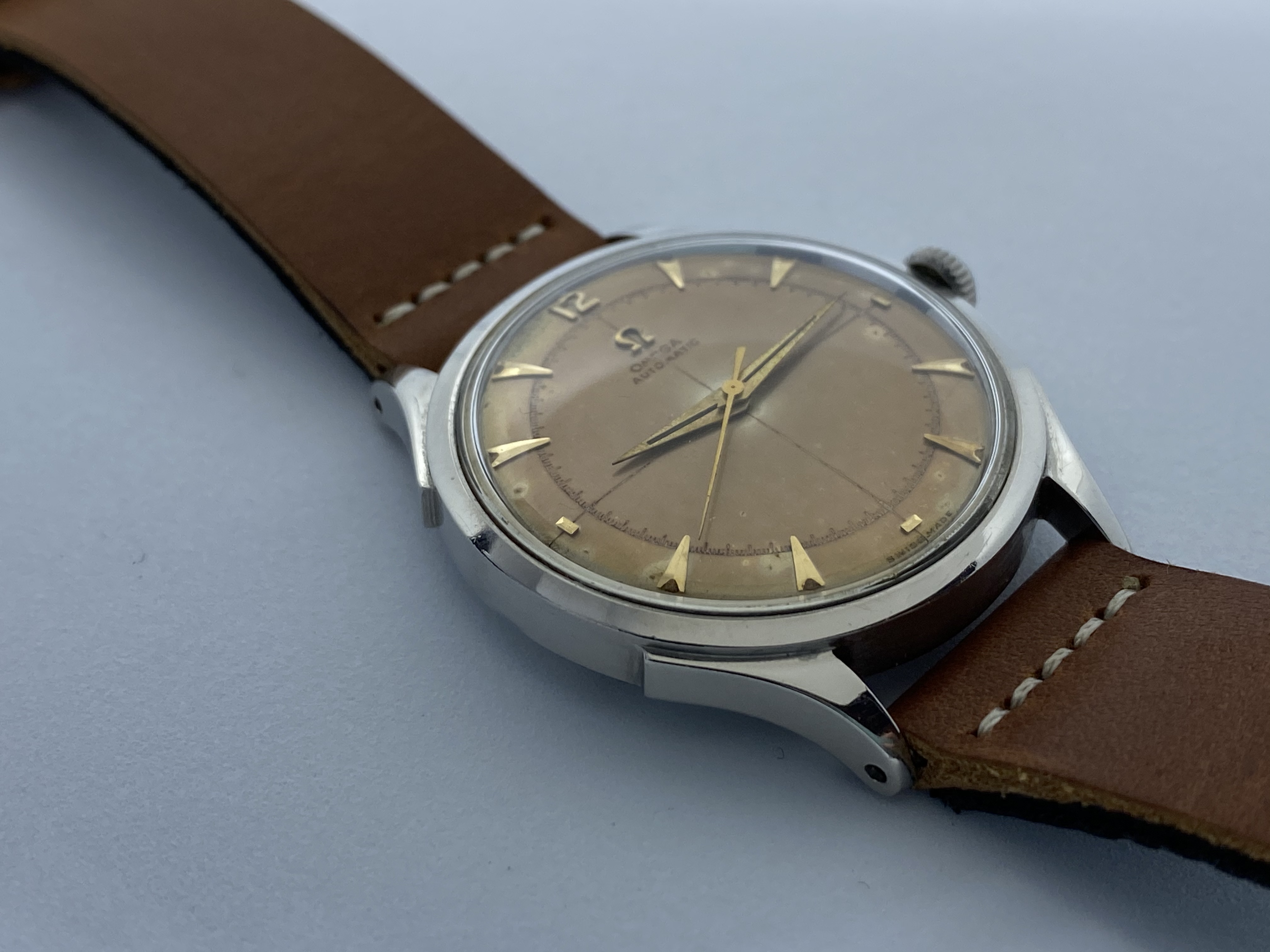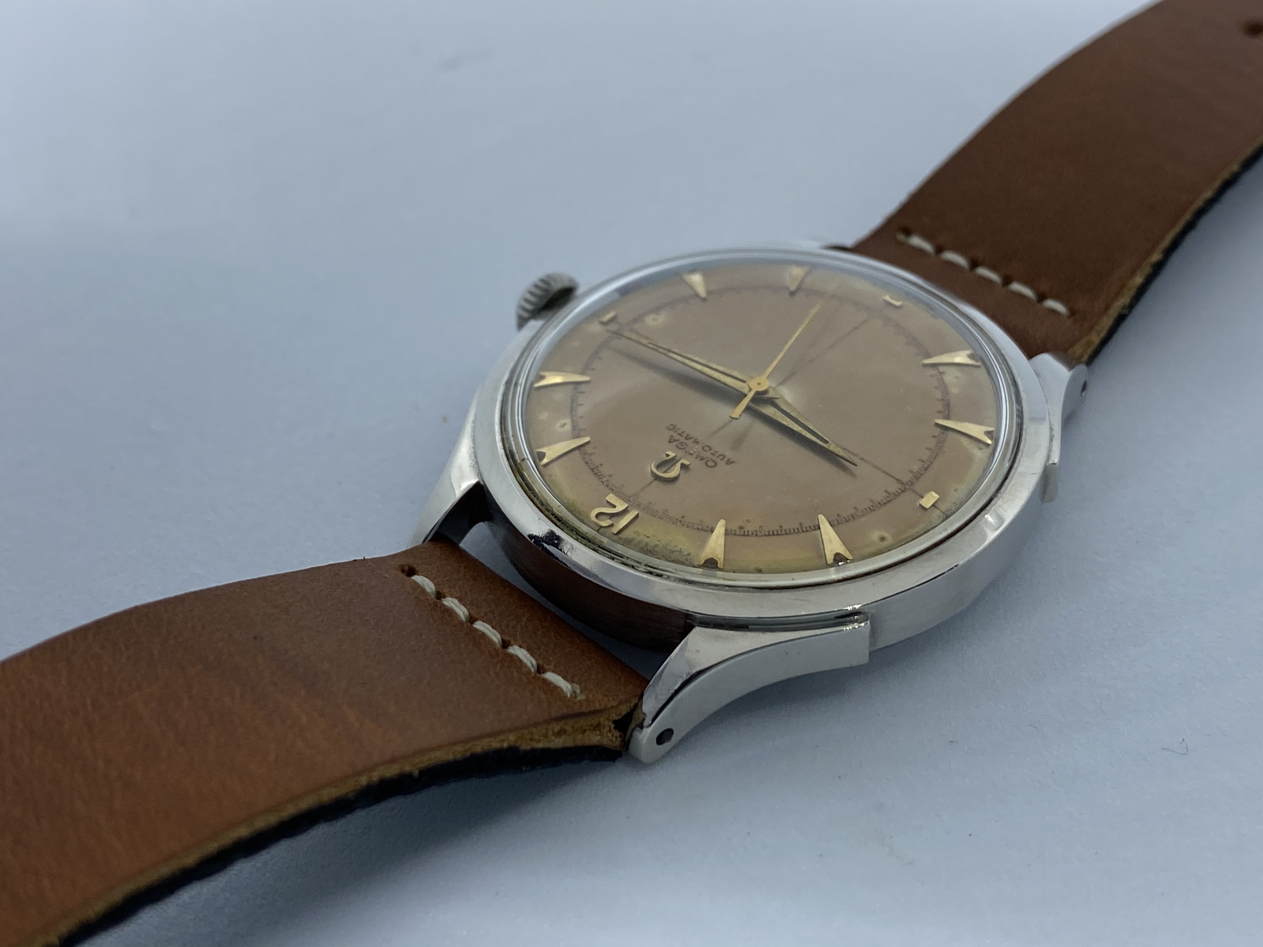 For sale here is an early 1950s two-tone dial Omega bumper automatic 2637, the larger 35mm variant of this case style with a spectacular copper-colored patina, steel case and gold furniture.