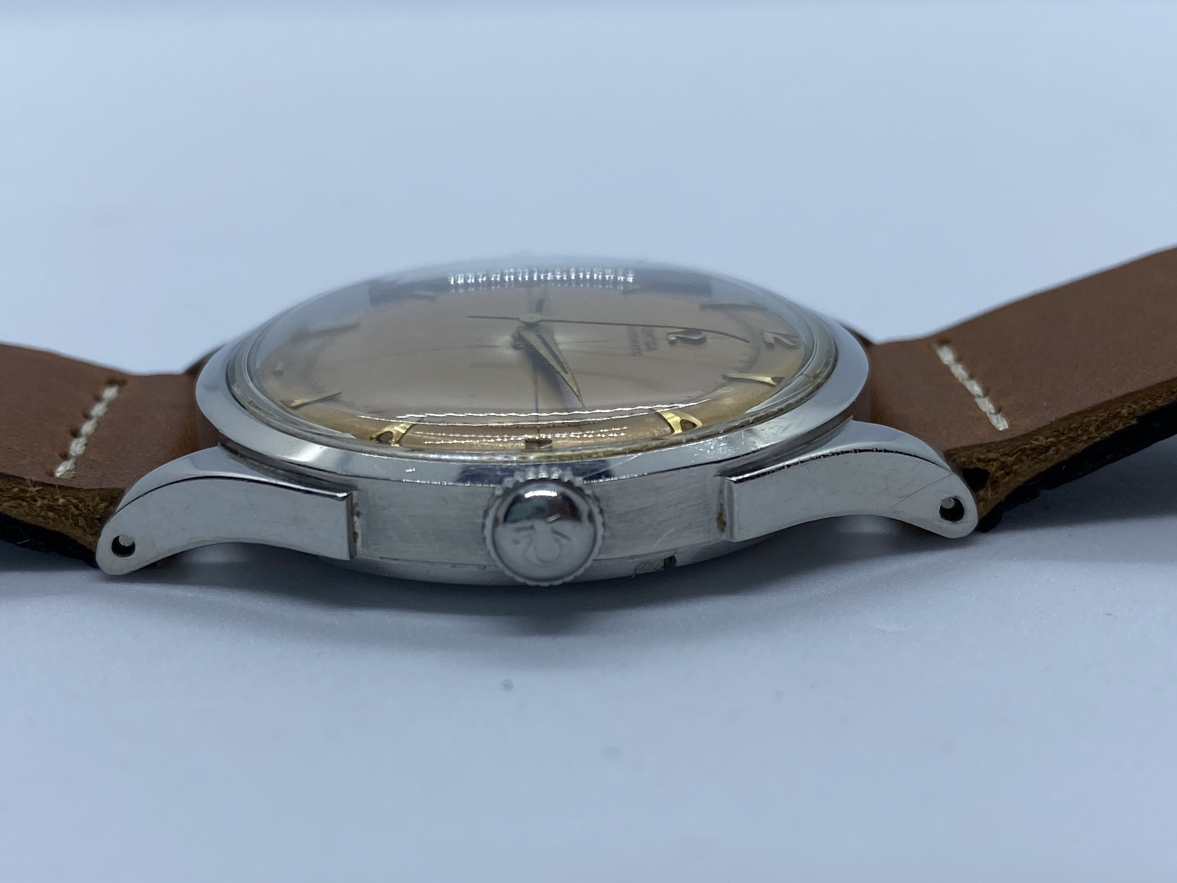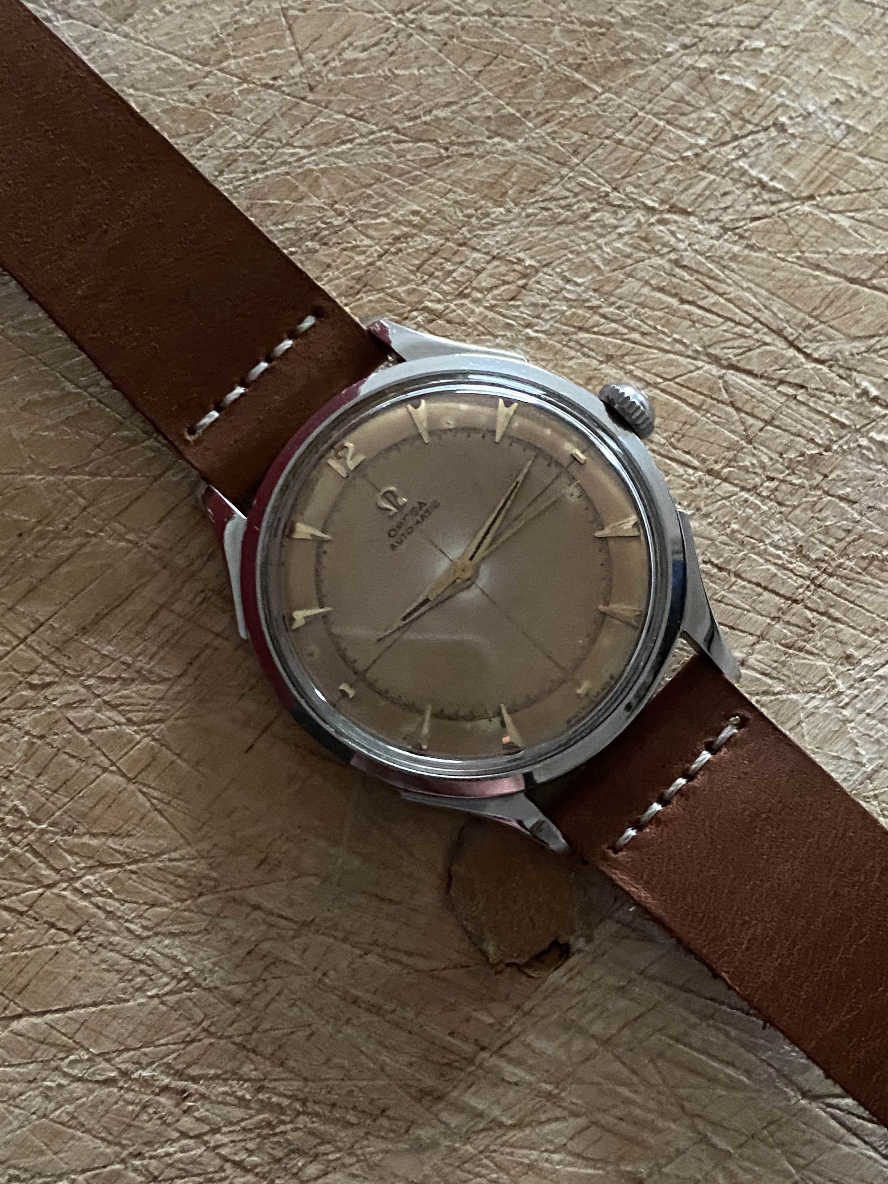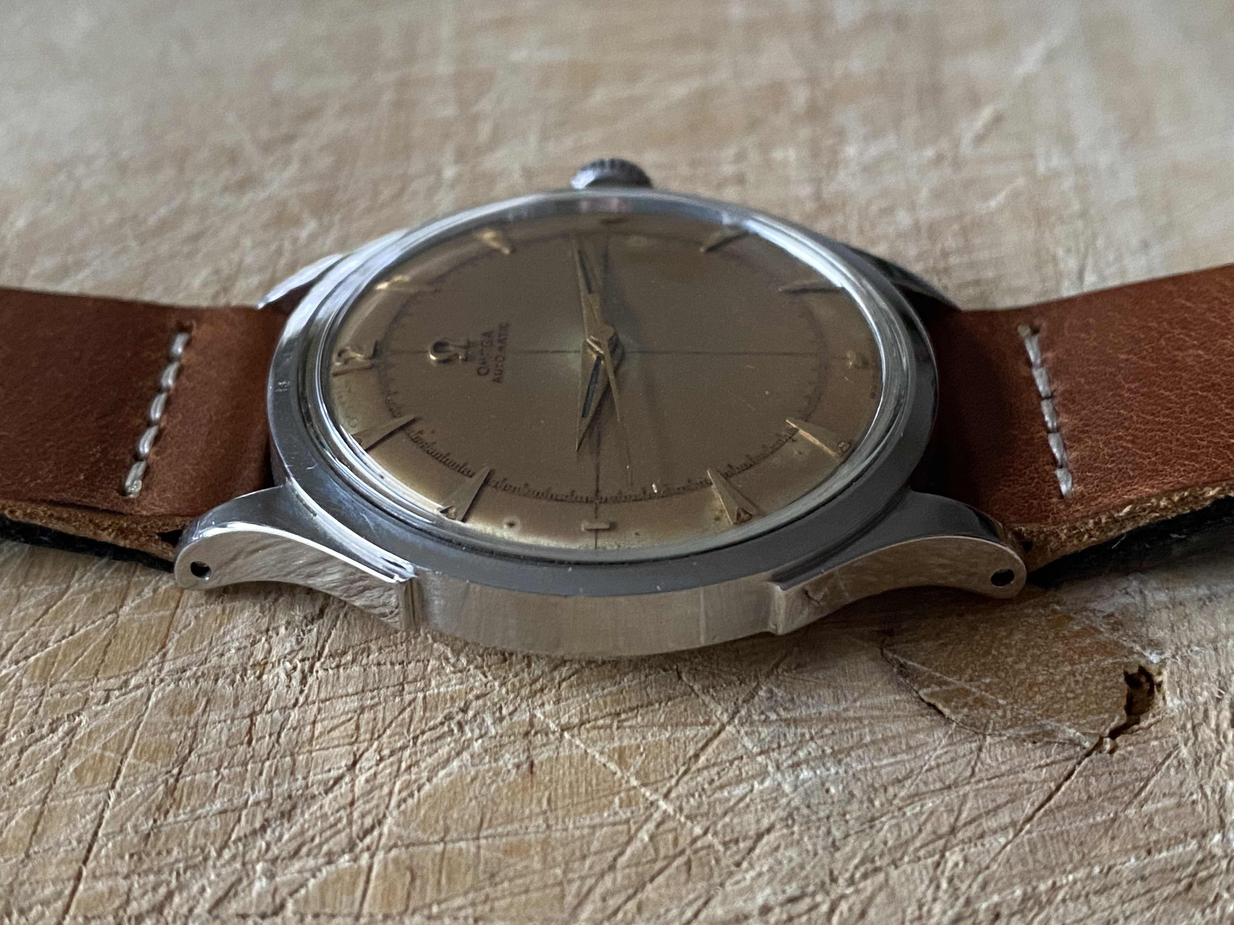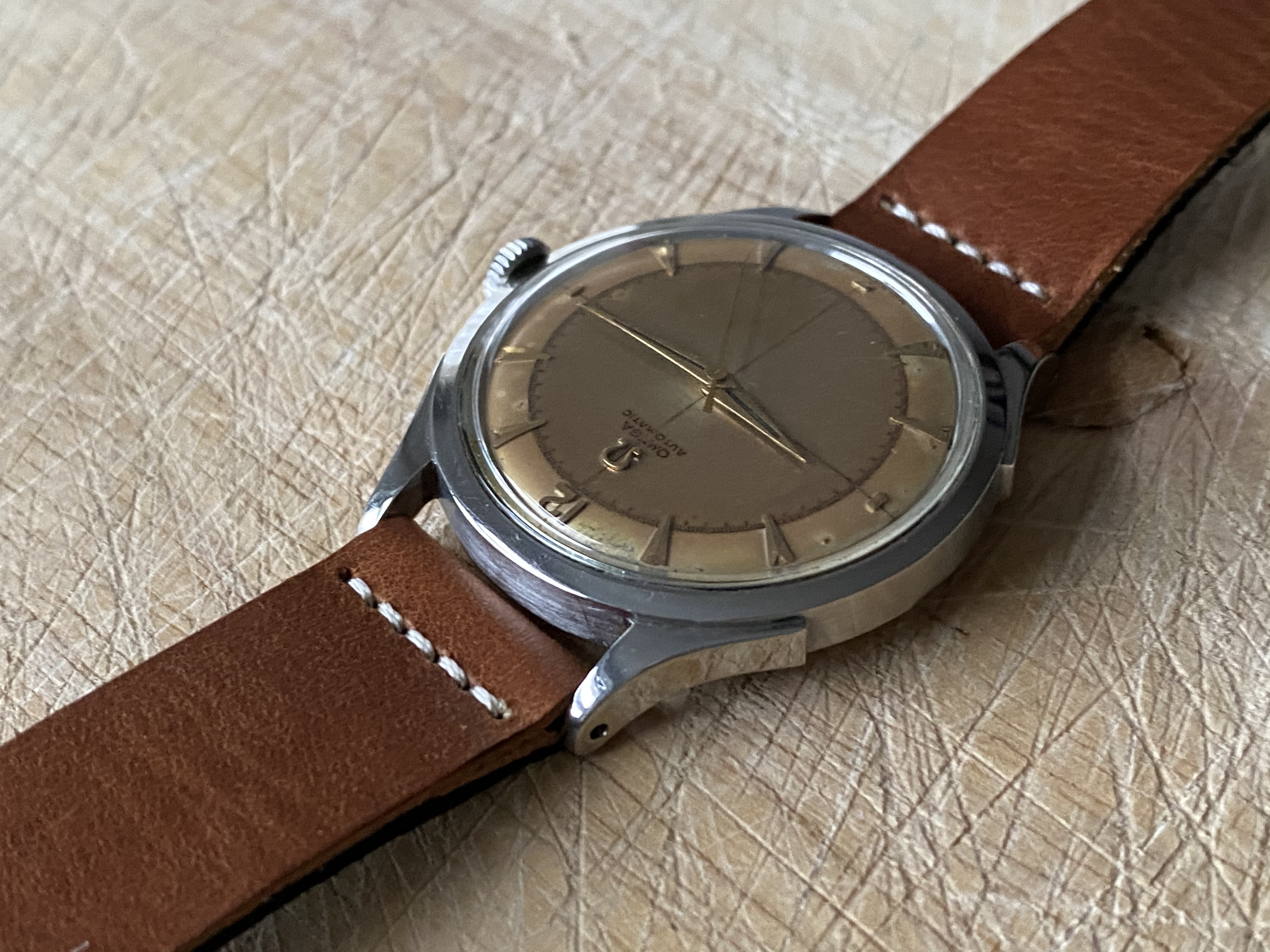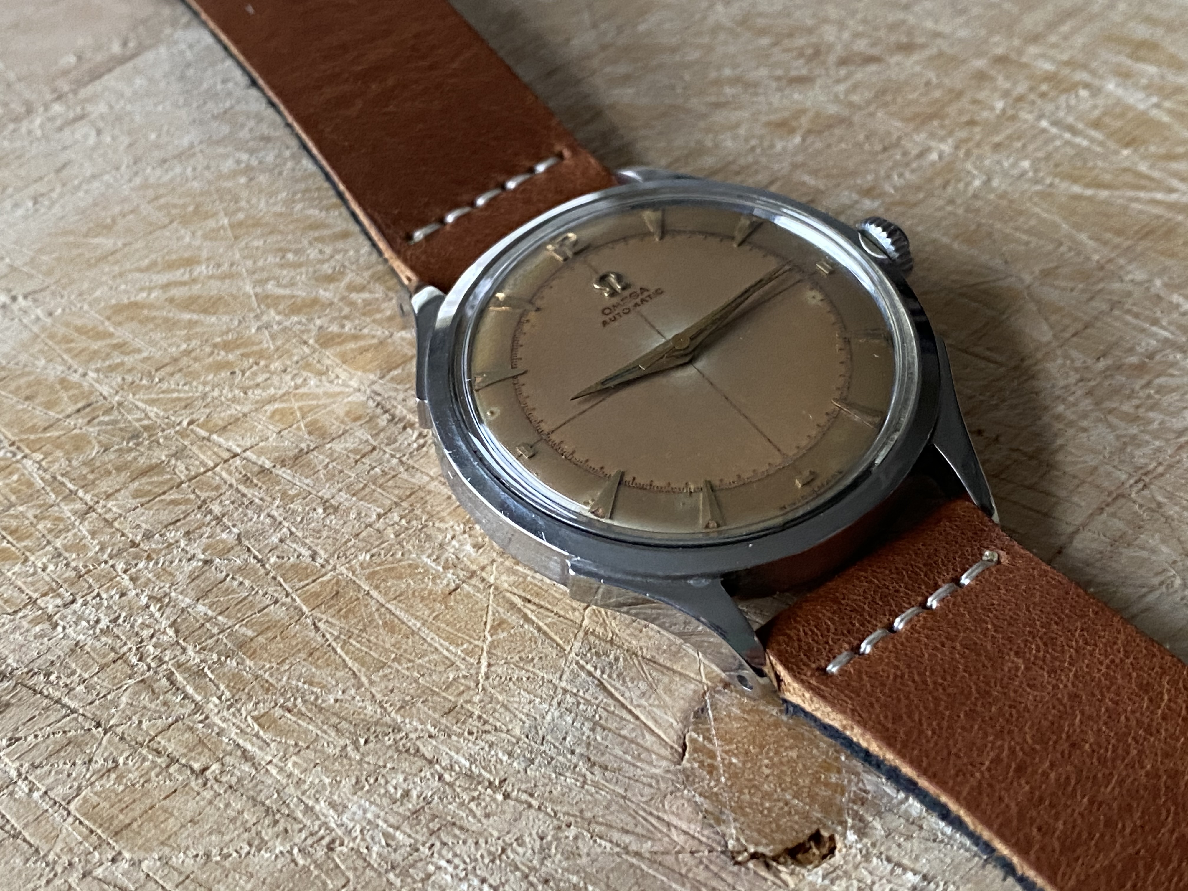For sale here is an early 1950s two-tone dial Omega bumper automatic 2637, the larger 35mm variant of this case style with a spectacular copper-colored patina, steel case and gold furniture.