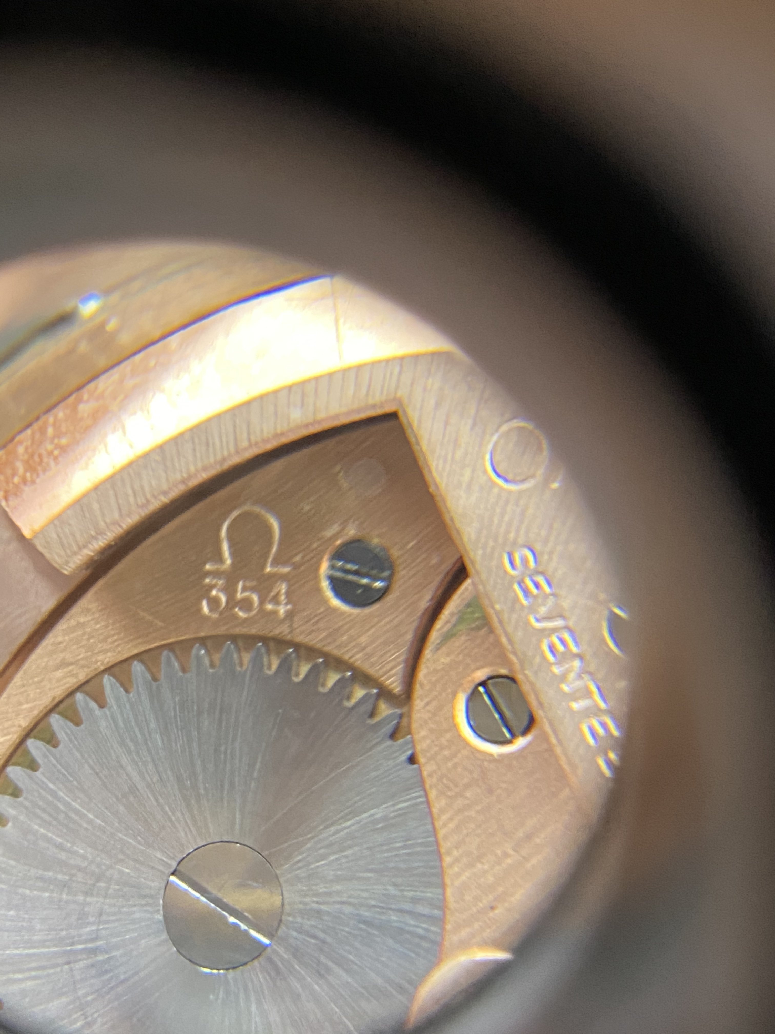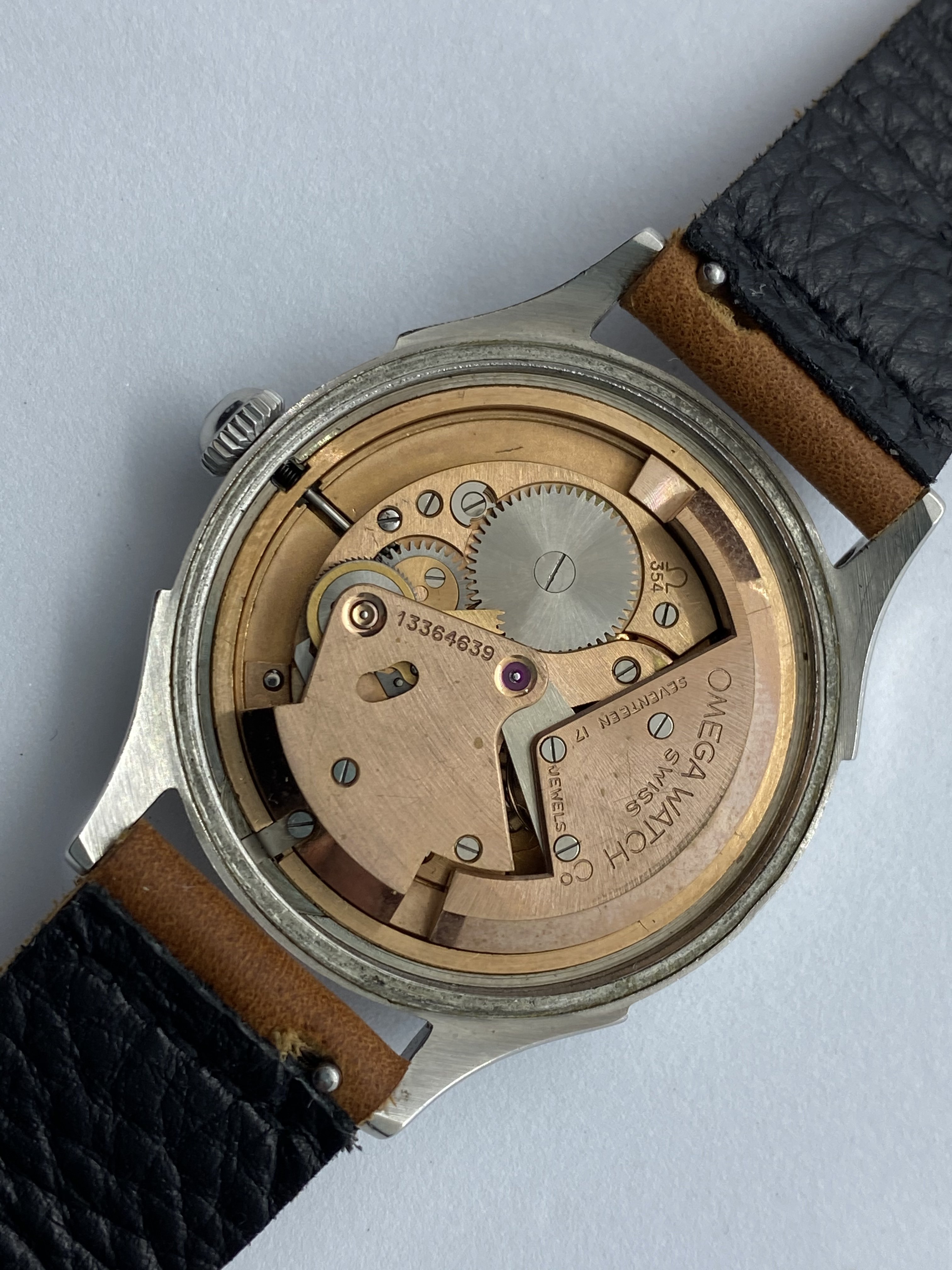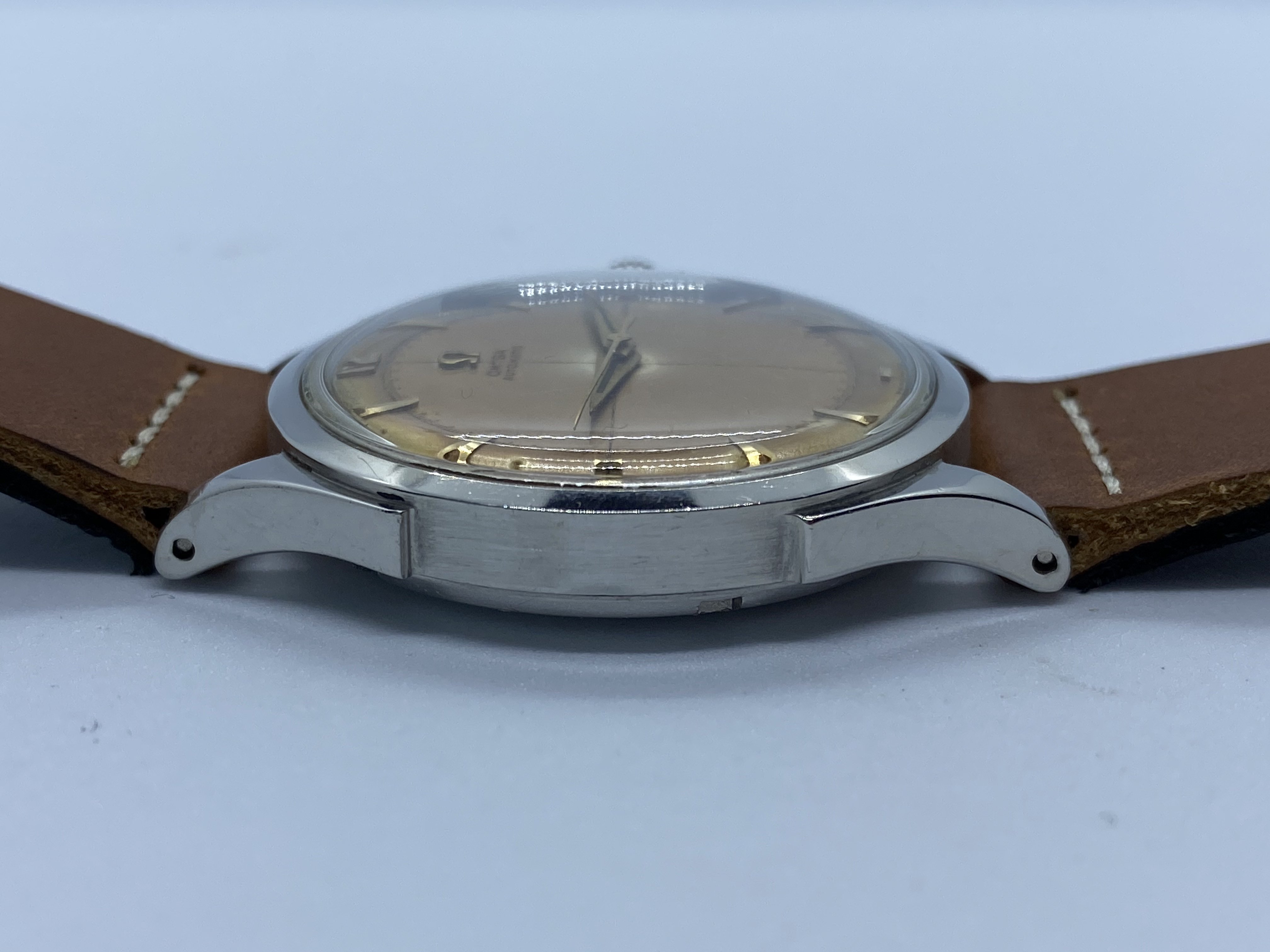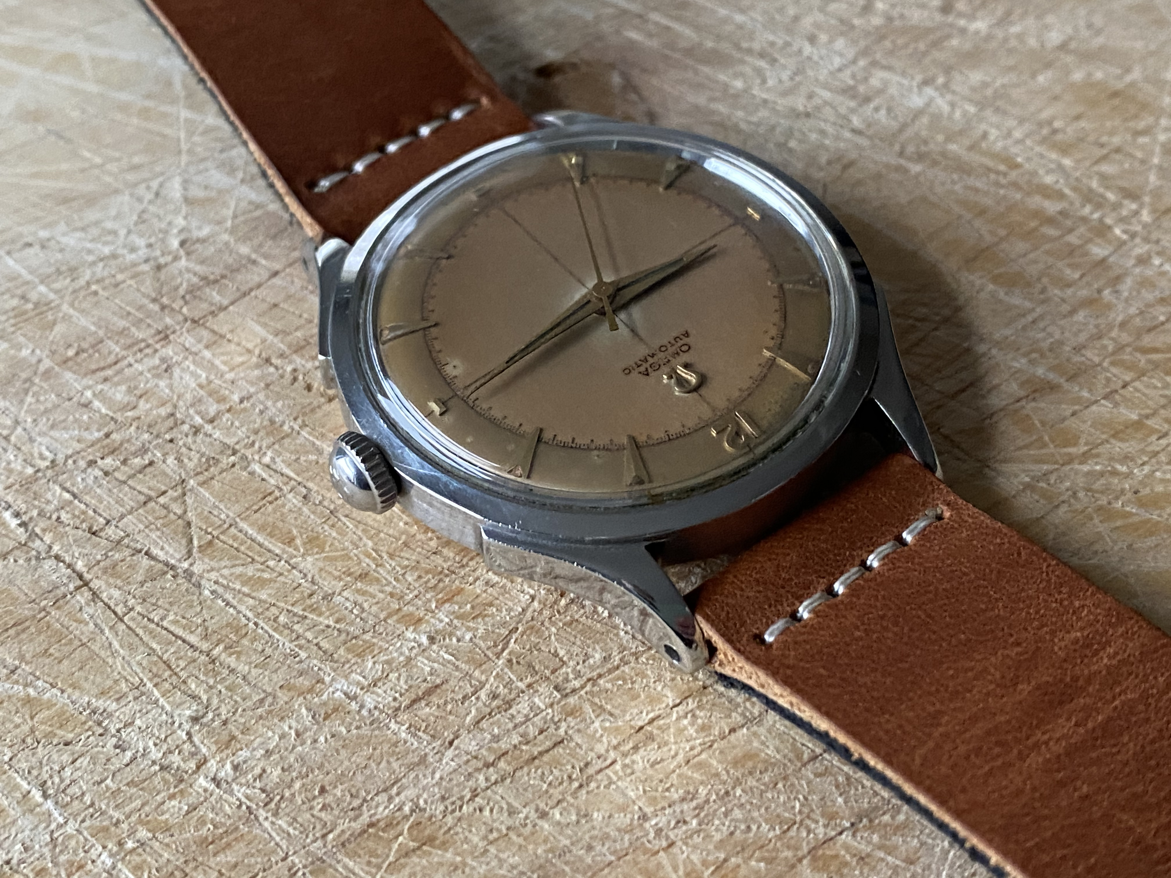 For sale here is an early 1950s two-tone dial Omega bumper automatic 2637, the larger 35mm variant of this case style with a spectacular copper-colored patina, steel case and gold furniture.