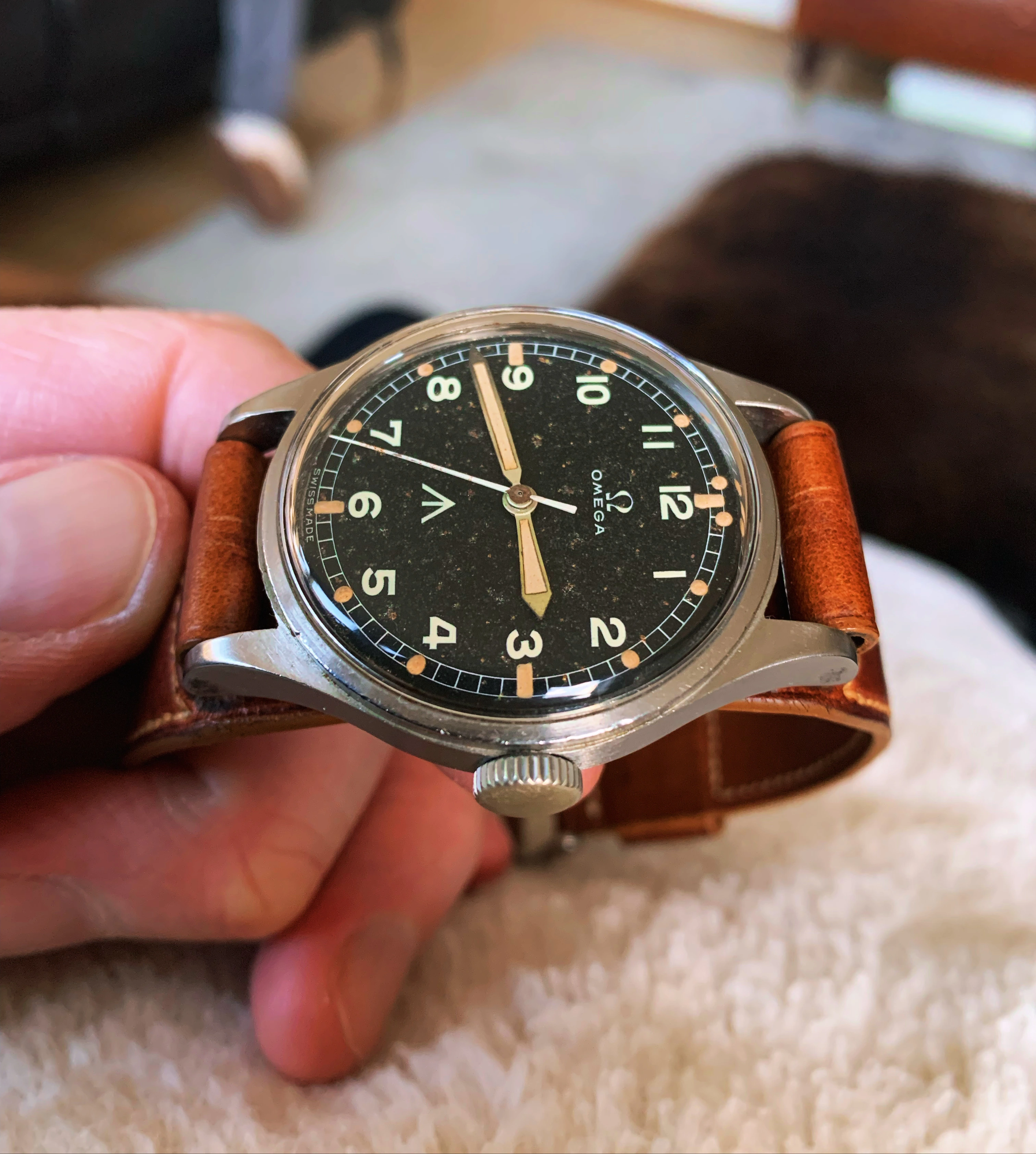 路Perfect amount of patina on this Omega 53 thin arrow all original radium dial, these were all re called to the mod to replace the radium with tritium in 1962 but a small amount maybe a couple of hundred escaped for various reasons, this particular one was found in 1973 by a raf mechanic in the running gear of an raf baggage loader and was then sat in a drawer and wound from time to time for 50 years before I got my hands on it 馃槉