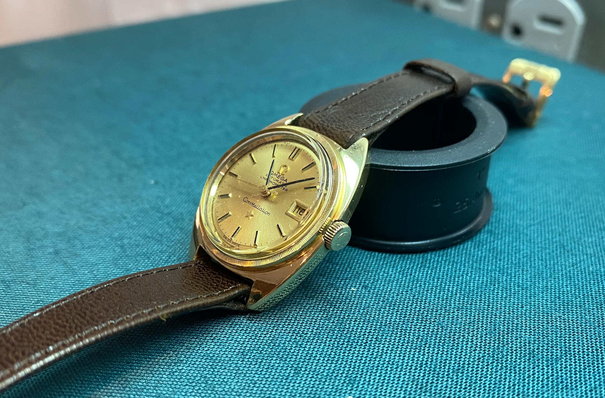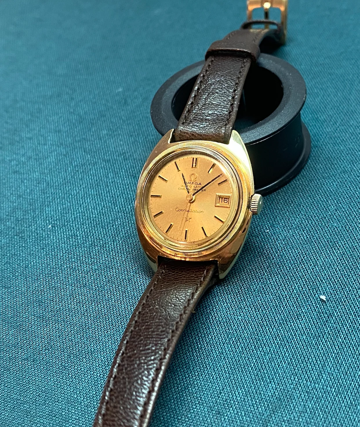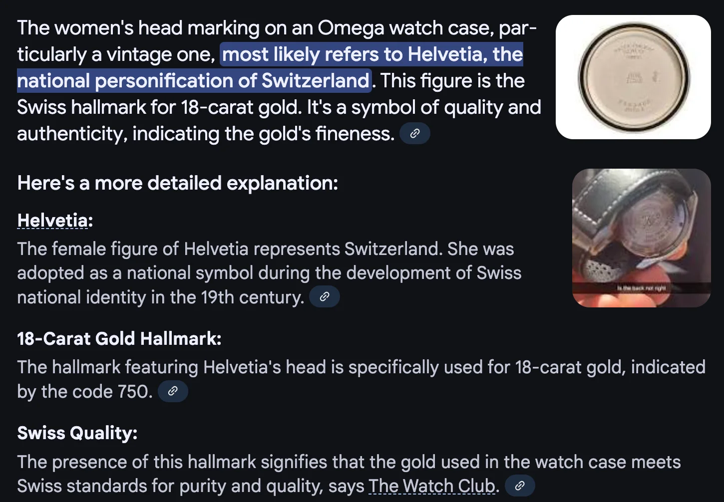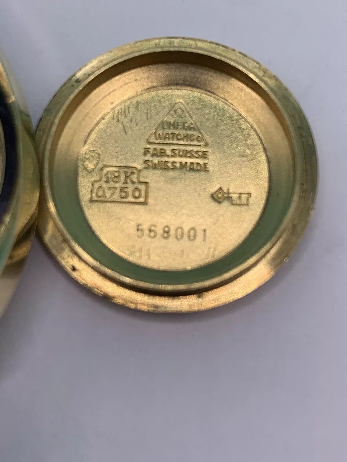 I have read through numerous articles and can not find any references of an Omega case having any sort of hallmarks on the outside. The first photo in this posting is a tiny hallmark of what looks to be a womans head with headband and "G" marking beneath the head. Incredibly small hallmark I have it magnified bigtime. In my research I found that the Swiss hallmark for 18k gold was a ladies head [the head of Helvetia] but i cannot find any references where the outside of an Omega in hallmarked in that way. I could live with an after market case if its solid 18k, but if its not solid then I am still within the window to return the watch. Any insight is appreciated!