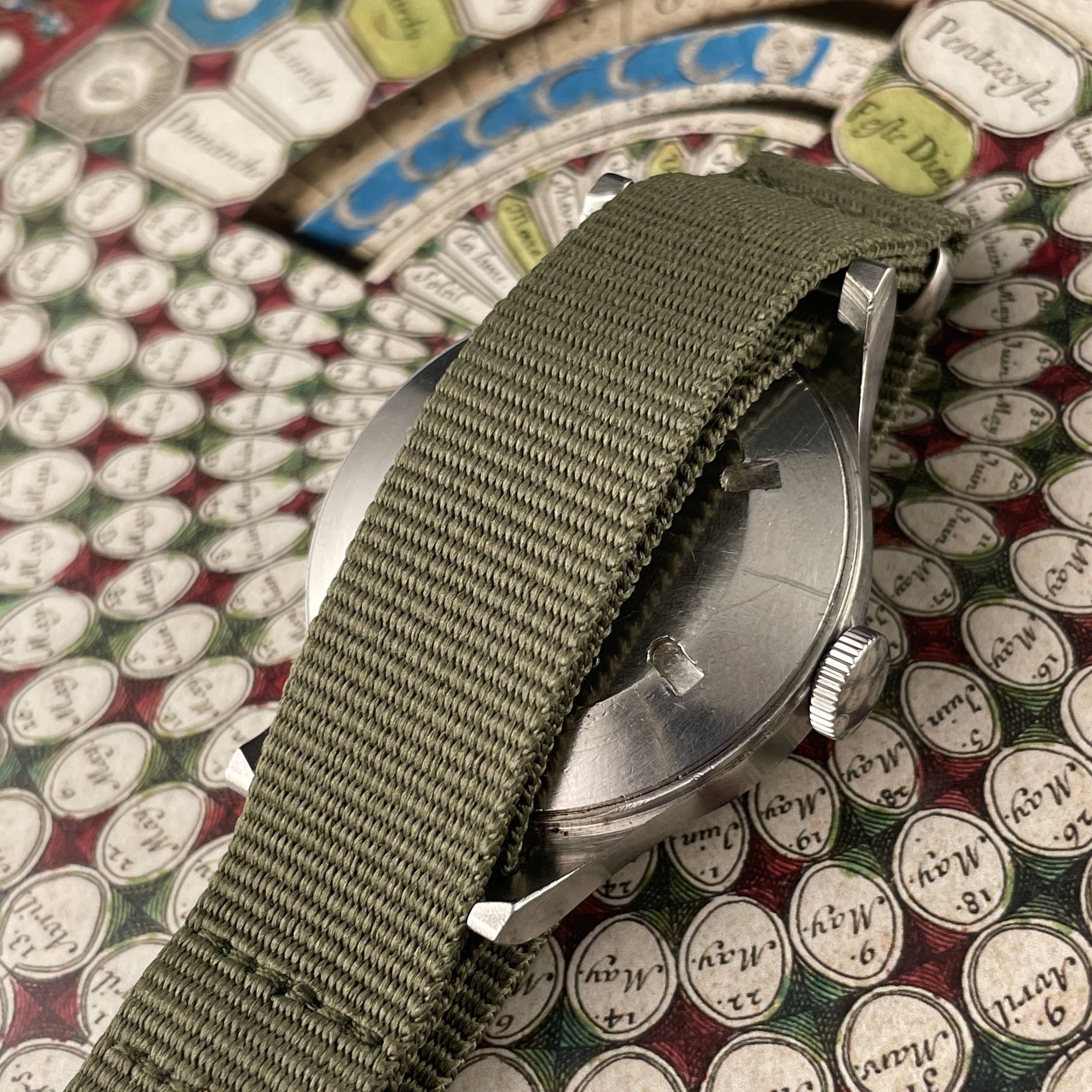 Case: 36mm stainless steel case is in good condition, with thick lugs and sharp lines and edges. 100 % unpolished. Case and screw down caseback have some scratches and signs of wear and opening.