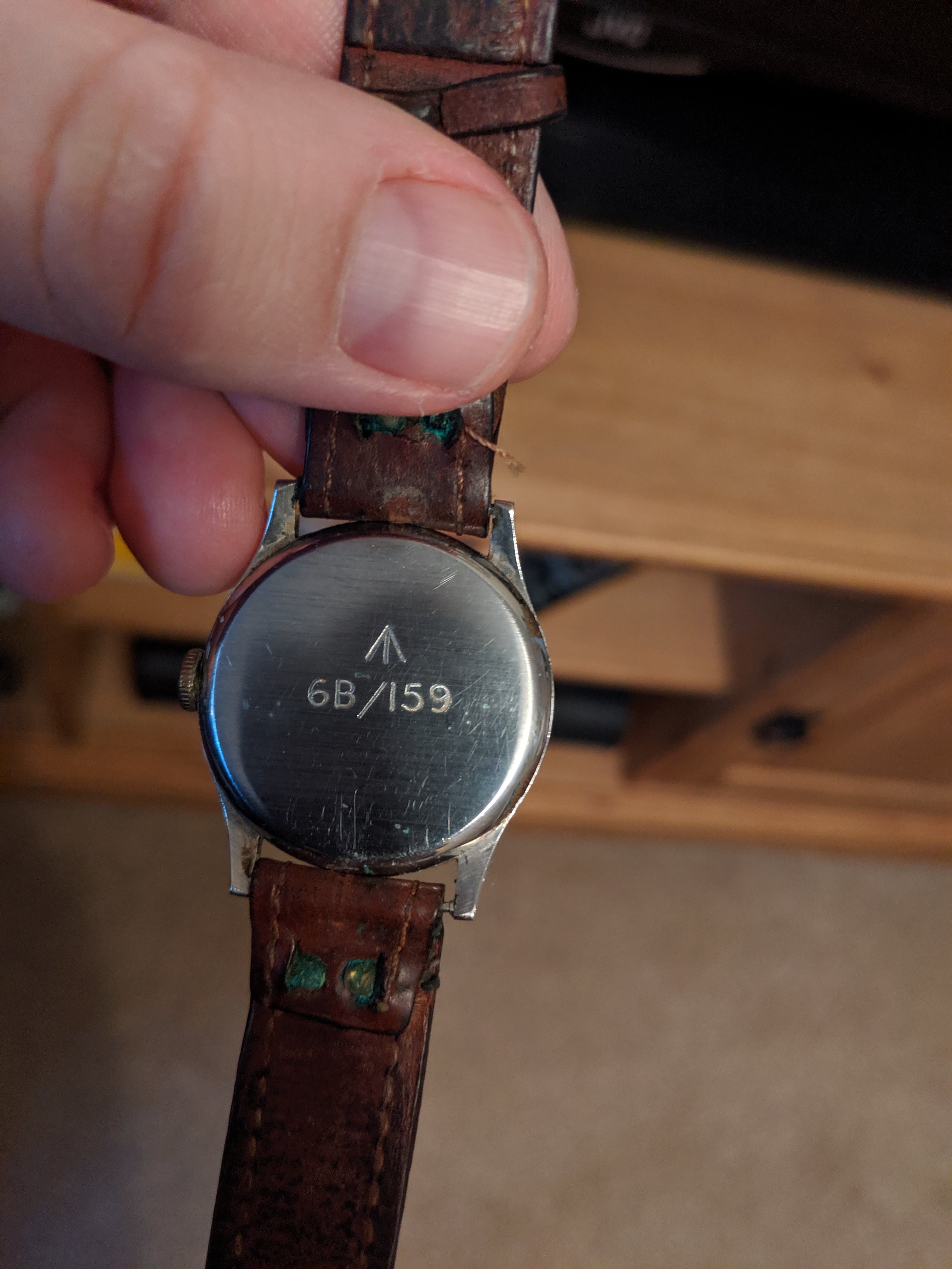 From a bit of googling of the numbers on the back (6B/159) it looks like these were RAF issued watches in the 40's or 50's. He was in the RAF in WWII so this adds up but is long dead (RIP) and we know nothing about it other than the fact he was "very proud of it". We don't know what he did in the RAF but wasn't a pilot.