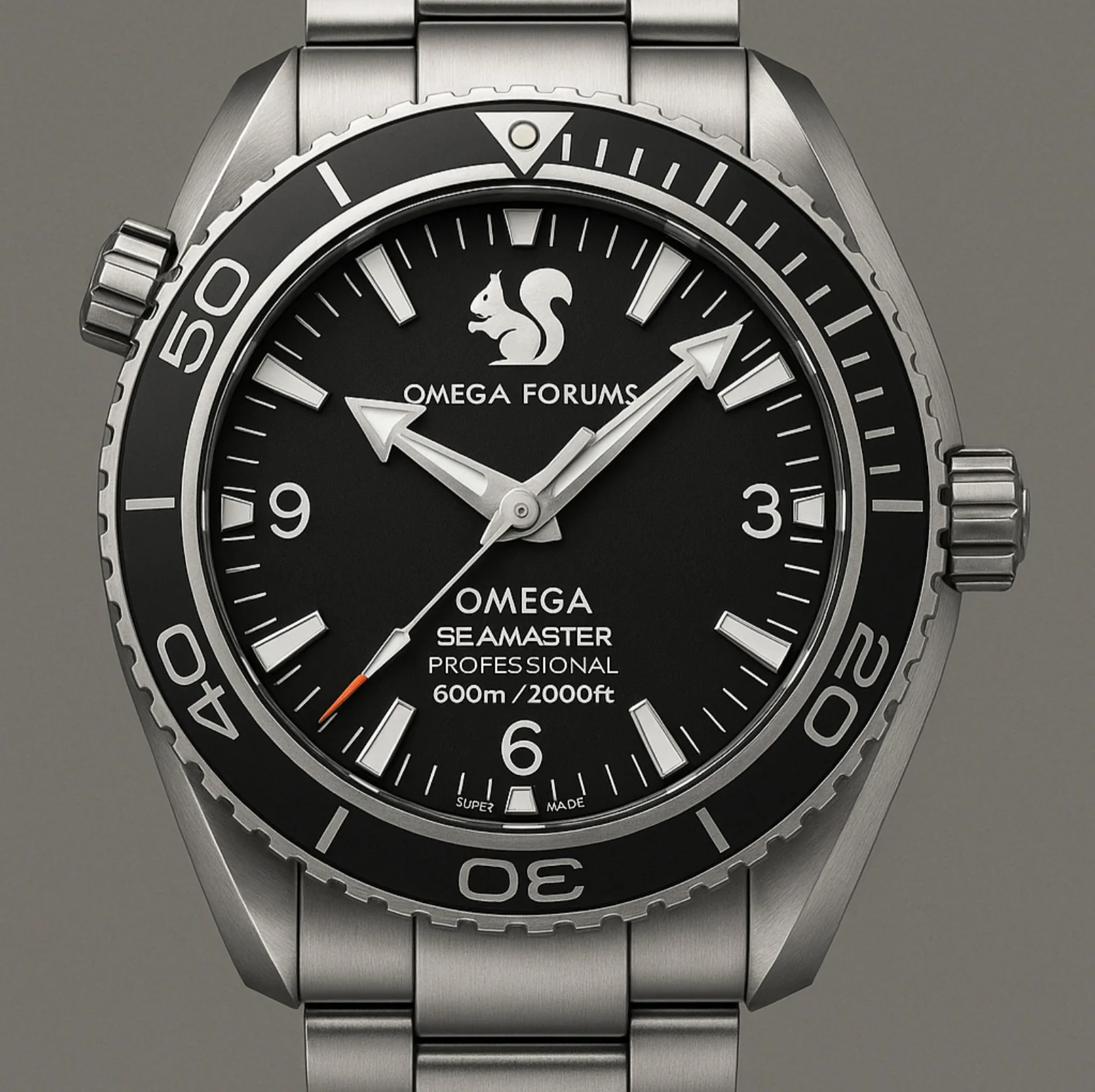 Can you draw a special edition wristwatch for the members of Omega Forums. A three hand divers watch rated to 600 metres with a countdown bezel and a squirrel logo below the 12 o'clock marker.