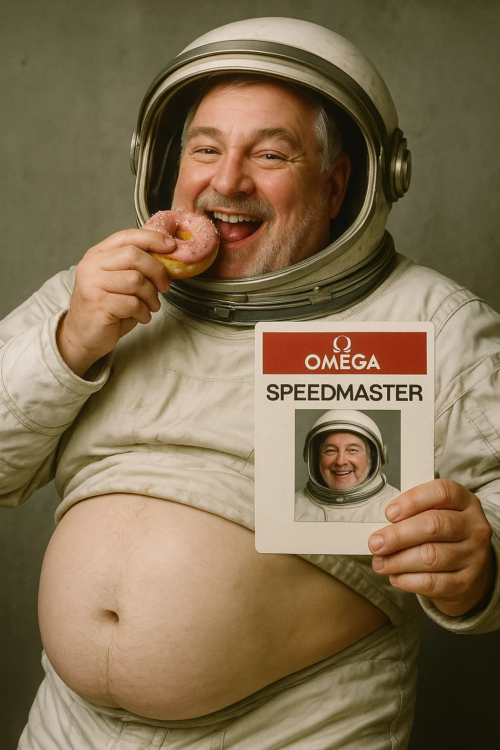 "Donut eating desk diving wannabe astronaut fat dude" and added the "Speedmaster card carryin' " that he couldn't fit.