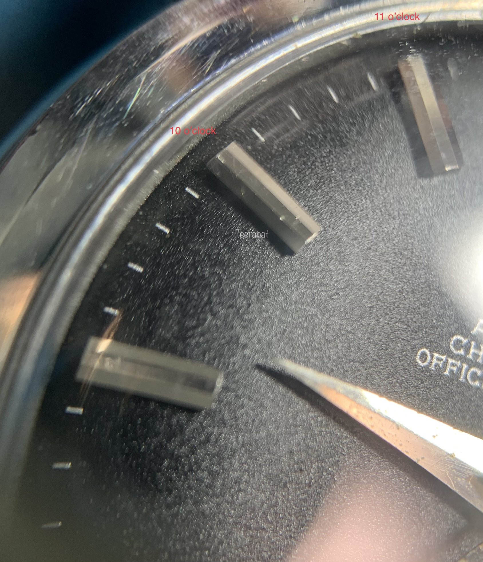 The black dial surface has a slight patina, plus unusually heavily serifed font. Please note the white spots are well spreading around the dial, as same as on the printed fonts. I assumed that it was the same production age.