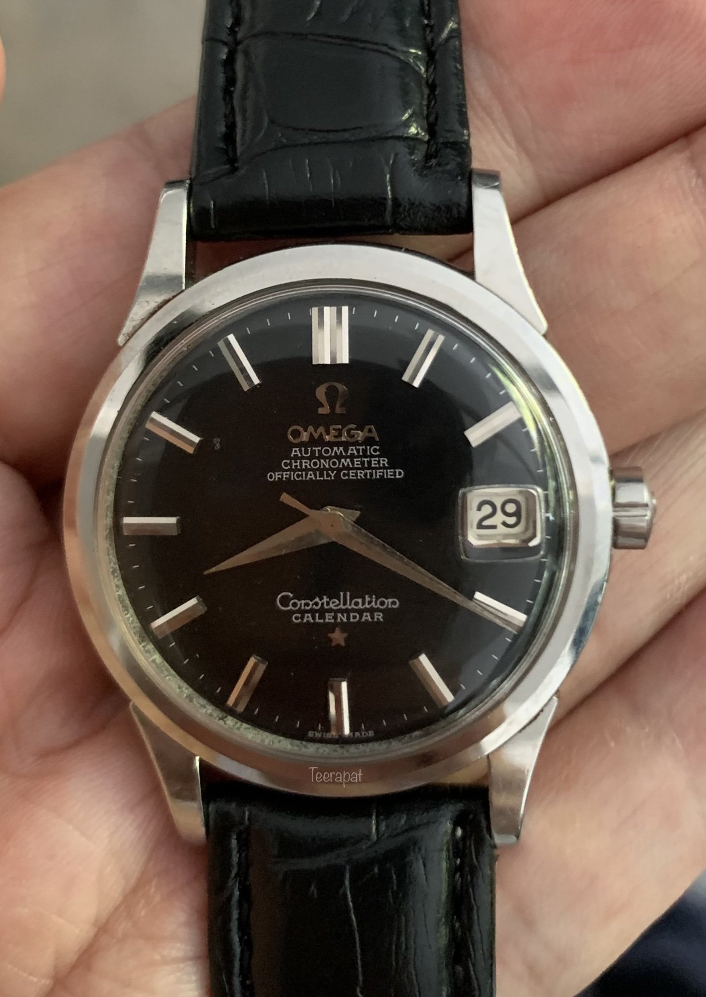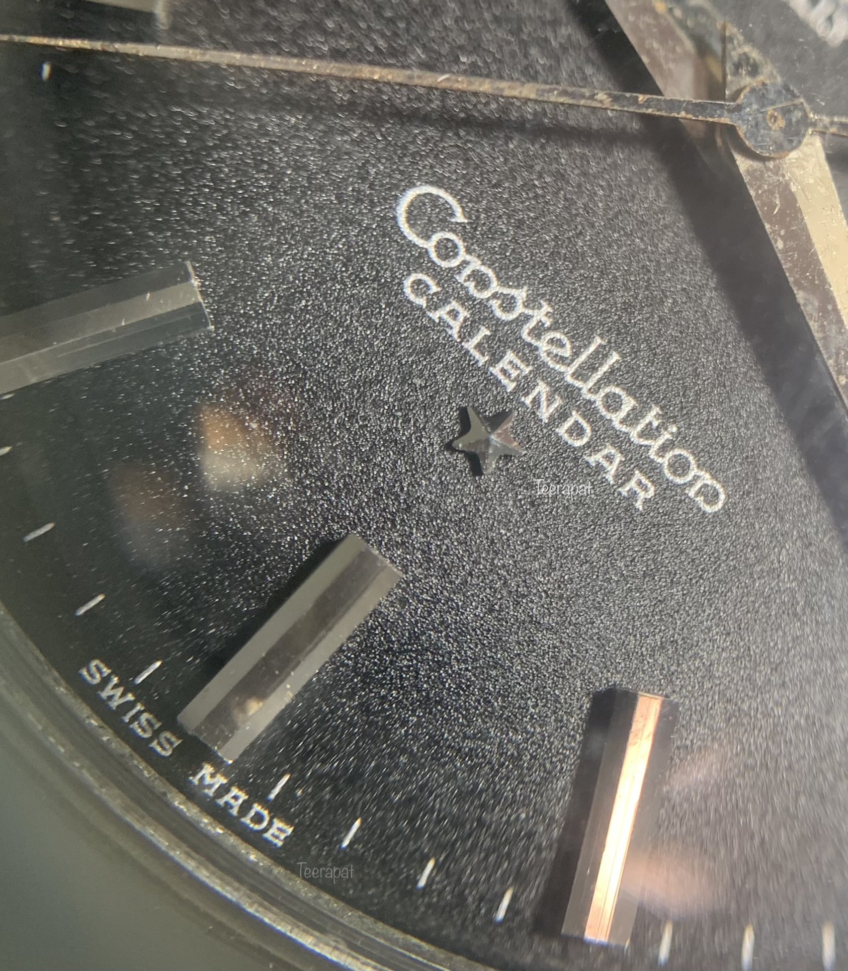 Next, I found this black dial in a steel case with yellow gold hardware (plus the crosshair and Meister). This one came with thicker fonts than usual, also too many serifs. These fonts were suspected to be redialed by many experts. https://omegaforums.net/threads/constellation-calendar-2943-with-crosshair-and-meister.110360/