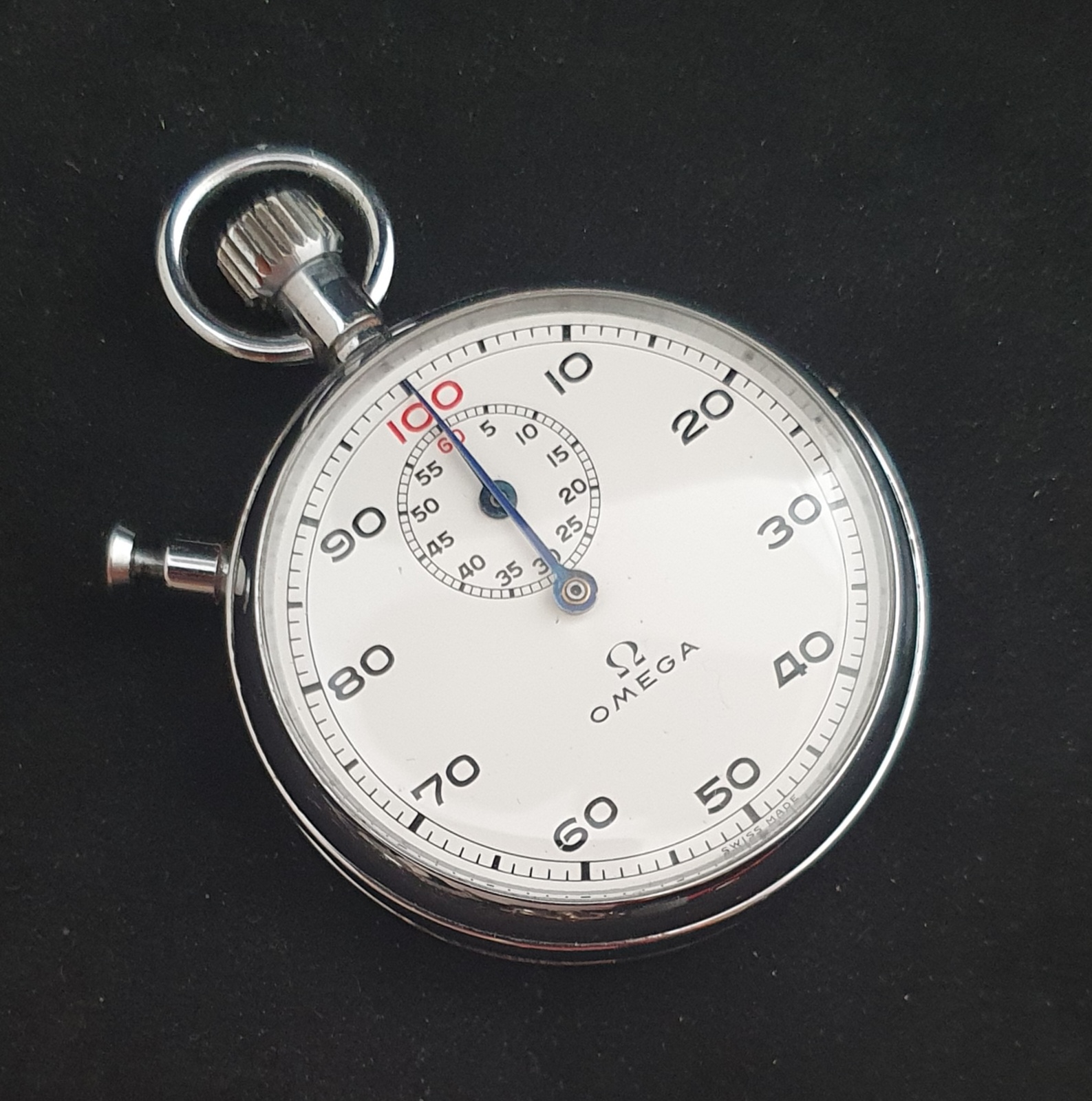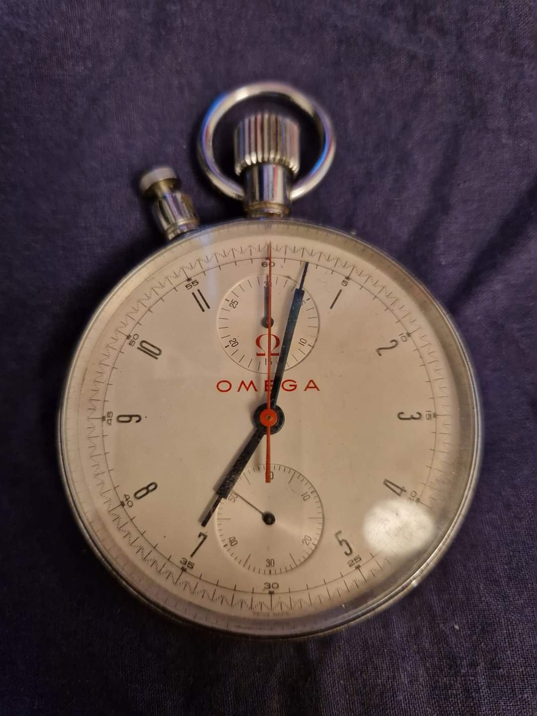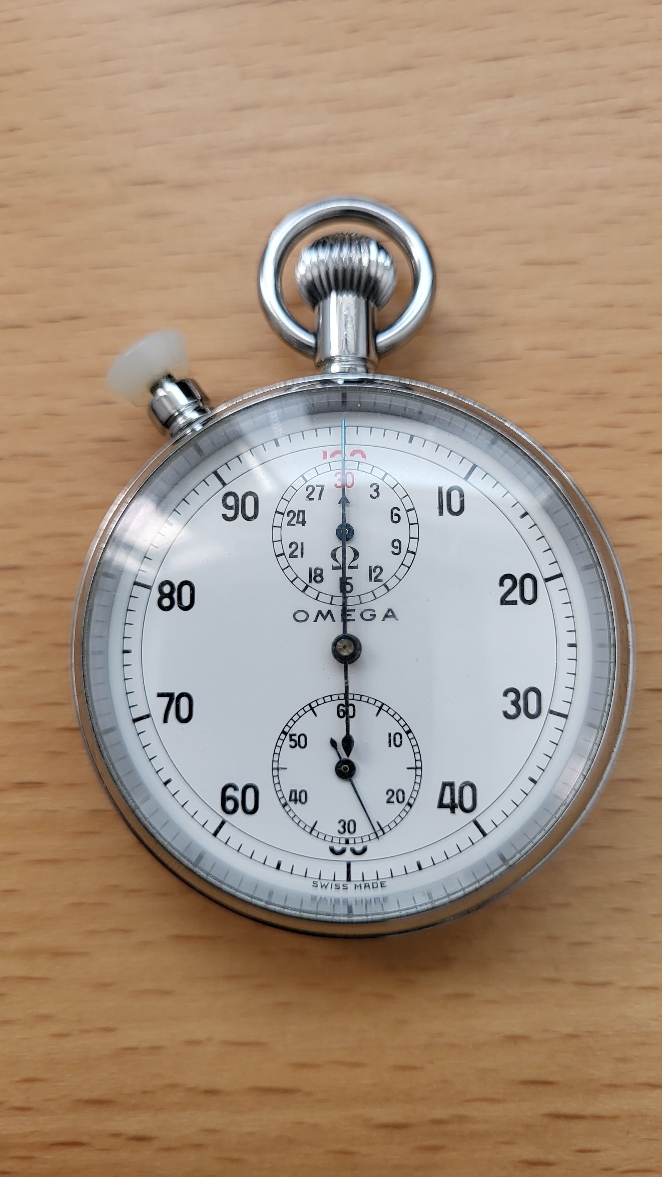 My father gave me this Omega Stopwatch many years ago. Had totally forgotten I even had this one. Does anyone have any information what model etc. this one might be? Haven't opened it yet as I do not want to damage the casing by prying it with a screwdriver etc... It ticks just fine after rewinding, but only dial that is moving is the lower smaller dial.. ticking one revolution every 1 minute.