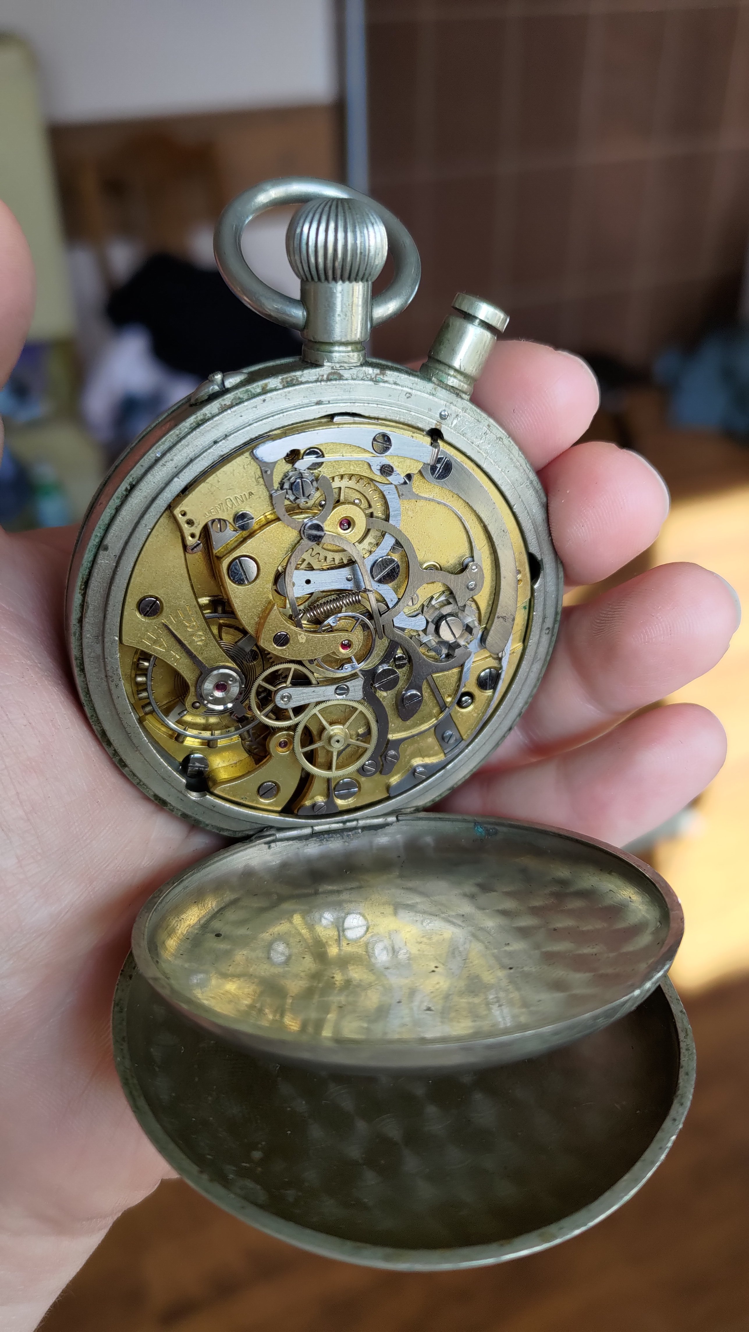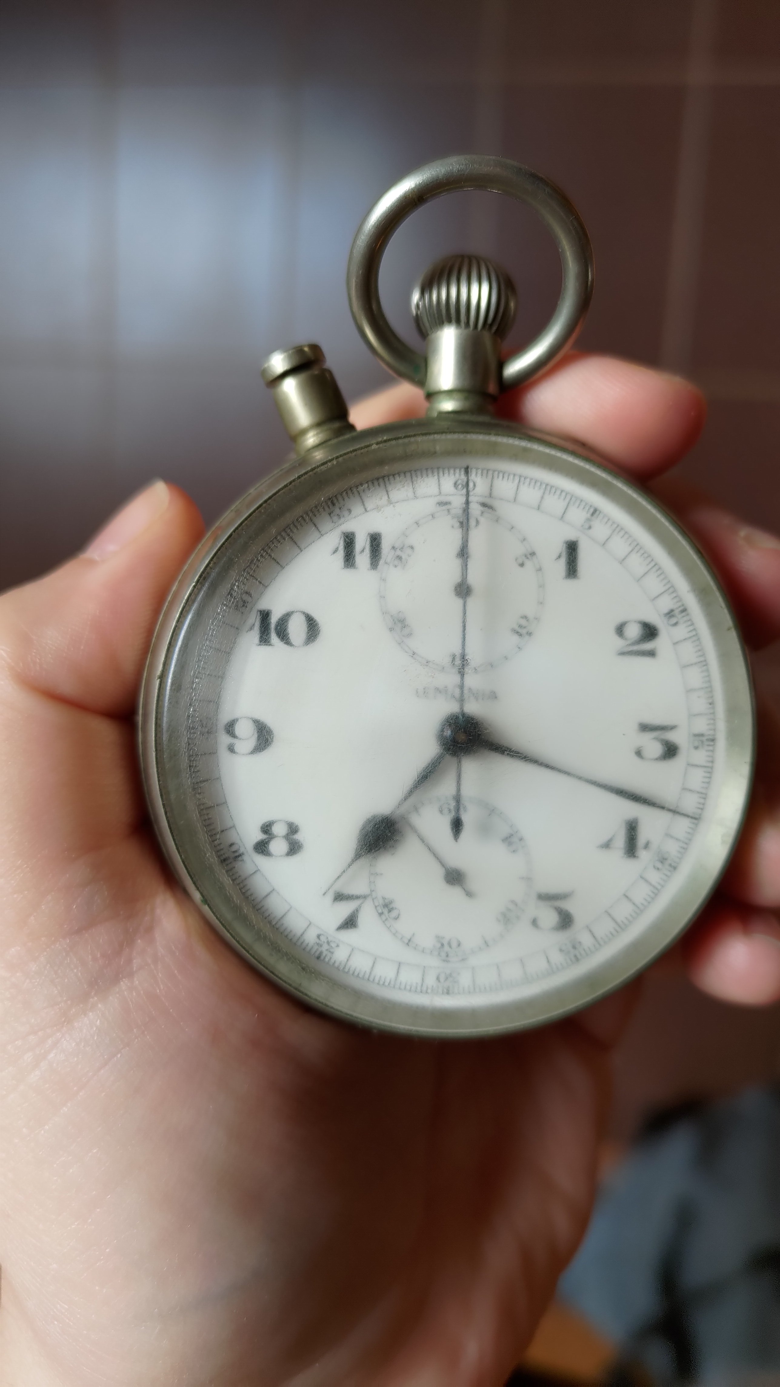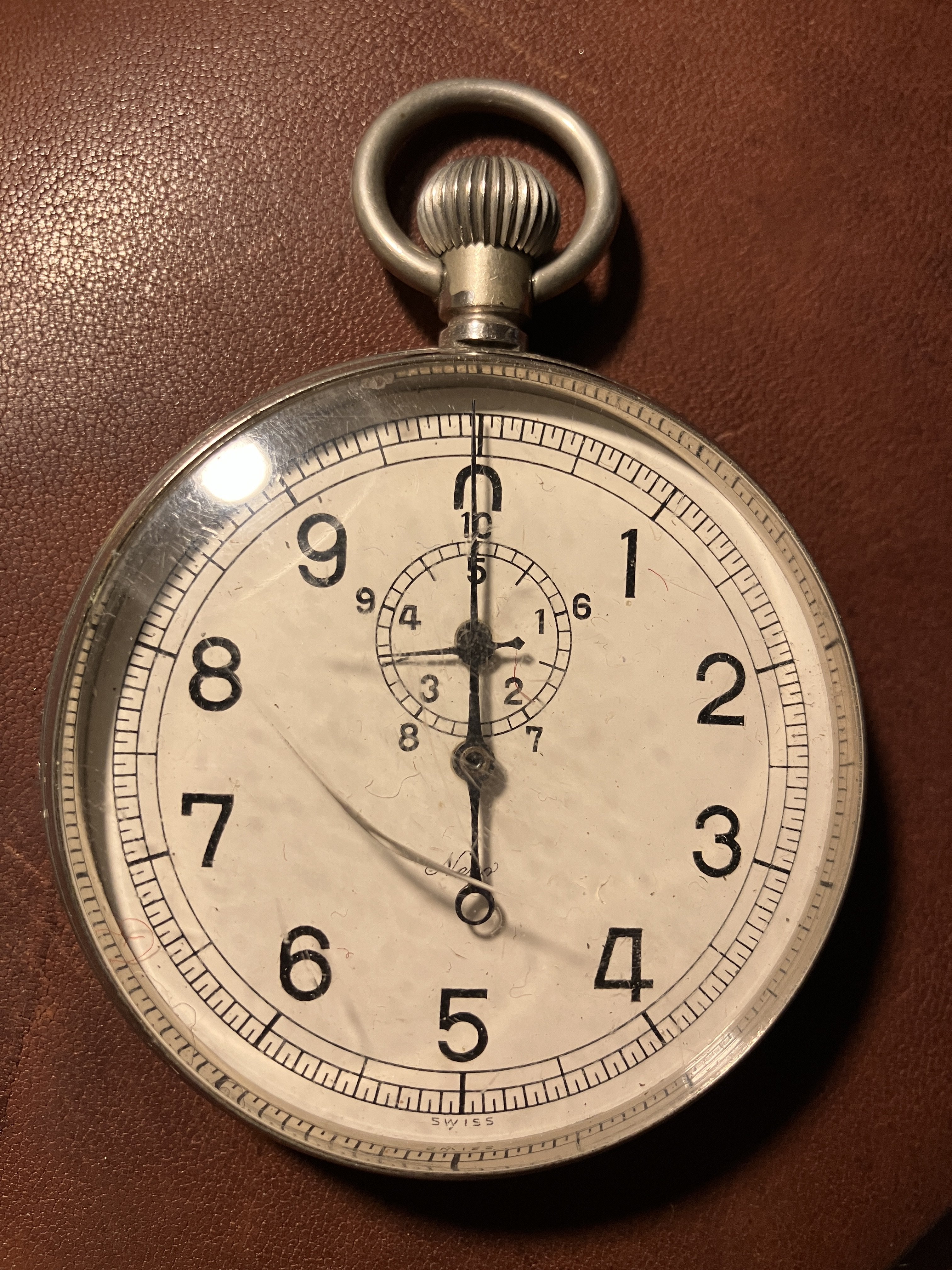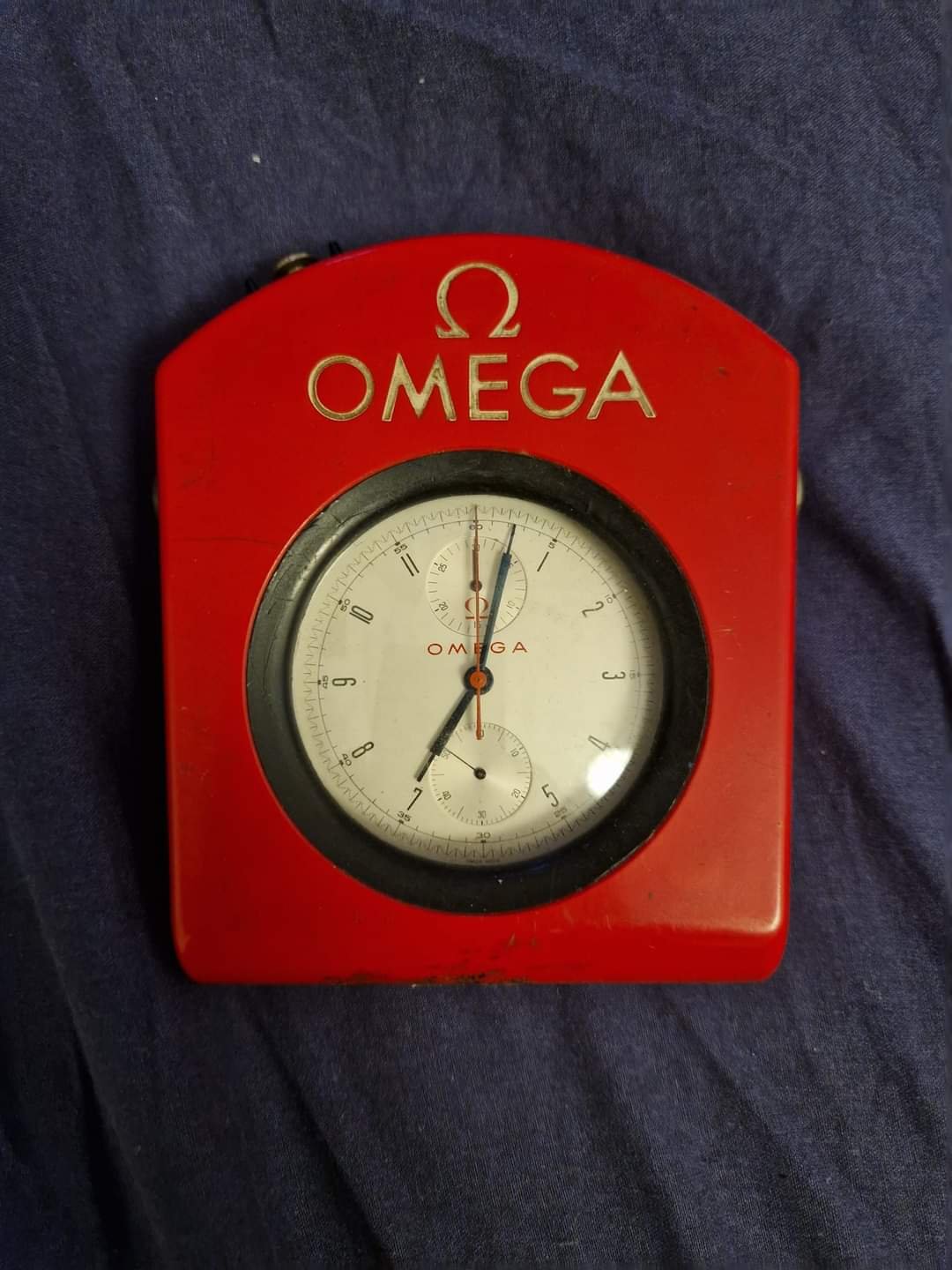 My father gave me this Omega Stopwatch many years ago. Had totally forgotten I even had this one. Does anyone have any information what model etc. this one might be? Haven't opened it yet as I do not want to damage the casing by prying it with a screwdriver etc... It ticks just fine after rewinding, but only dial that is moving is the lower smaller dial.. ticking one revolution every 1 minute.