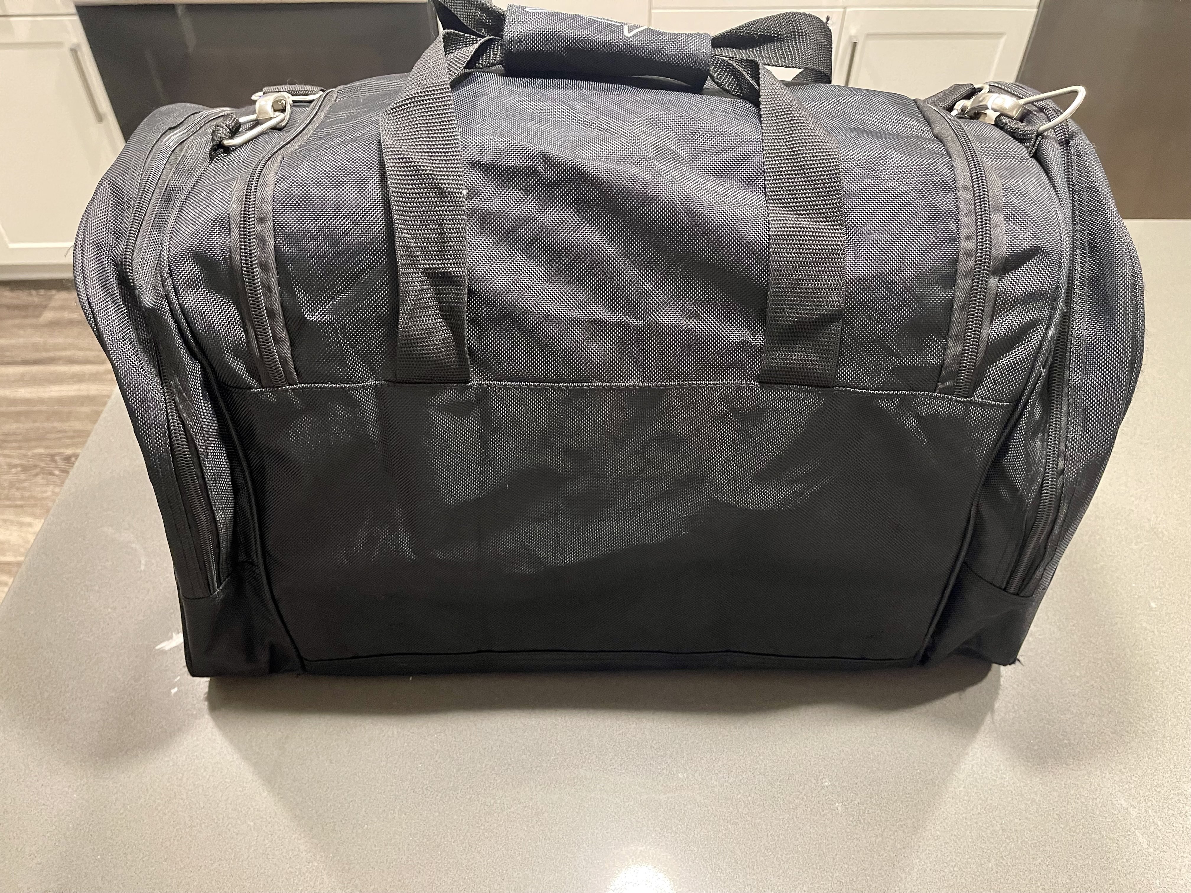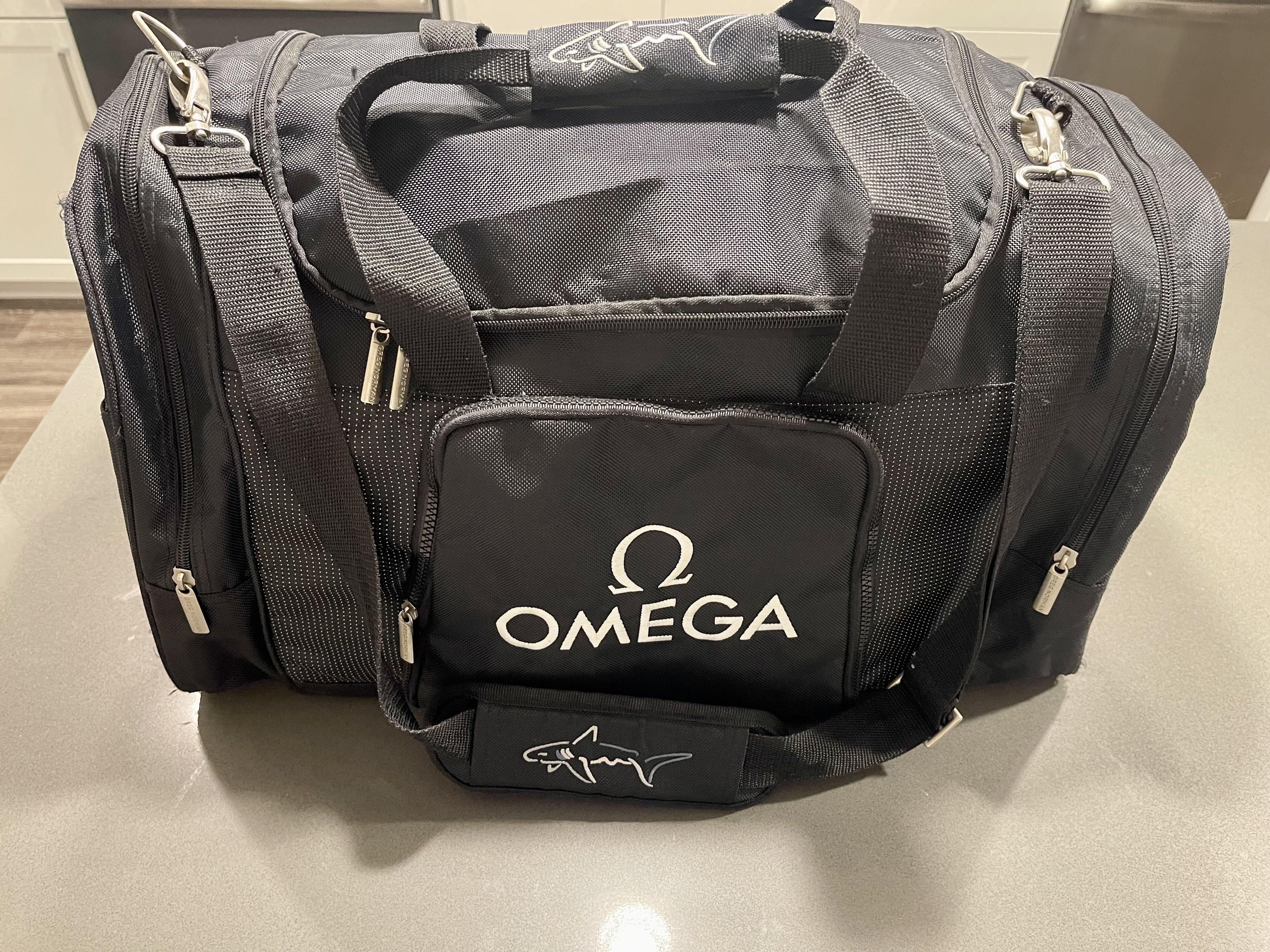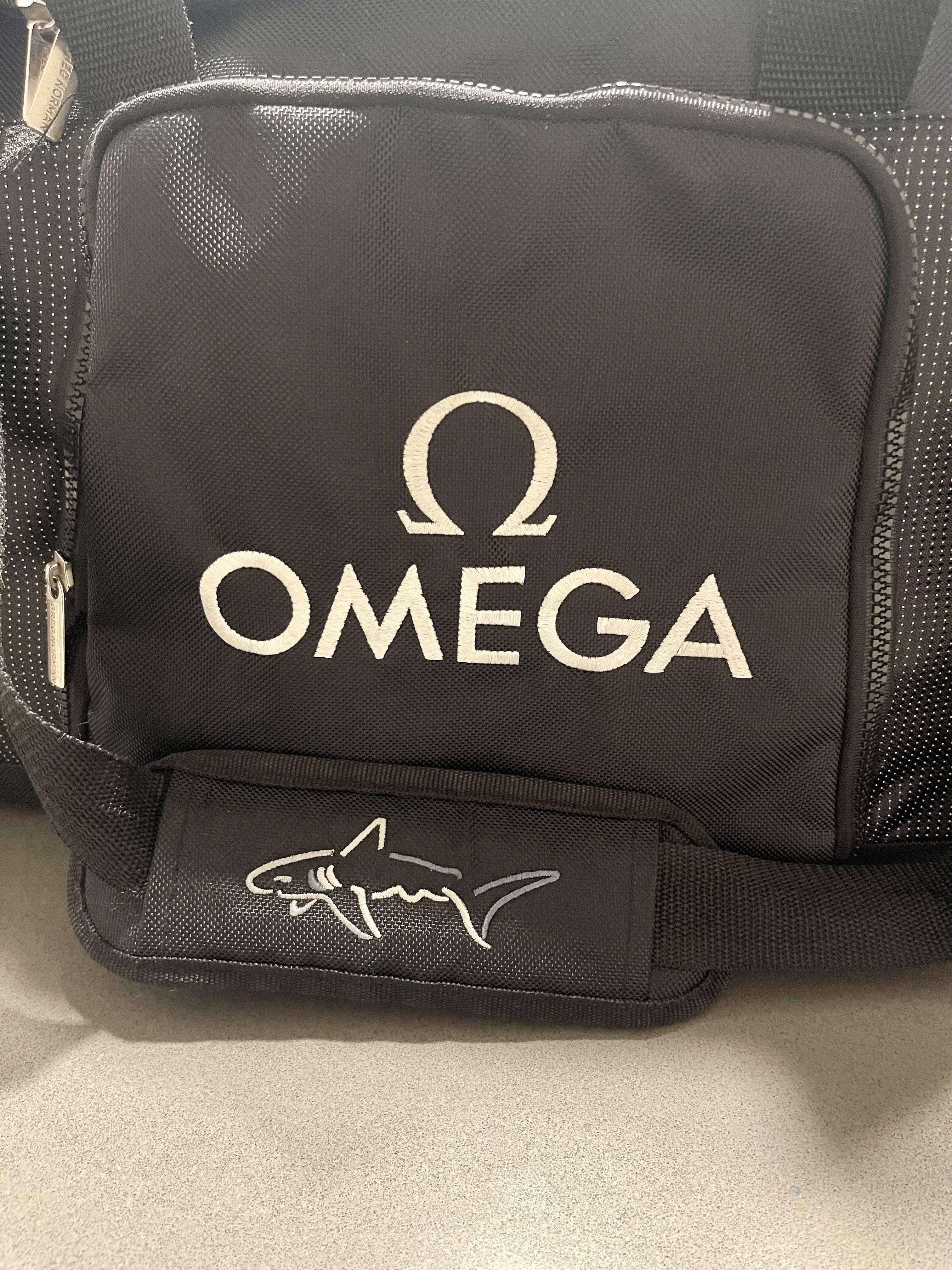 Omega / Greg Norman black duffel bag: