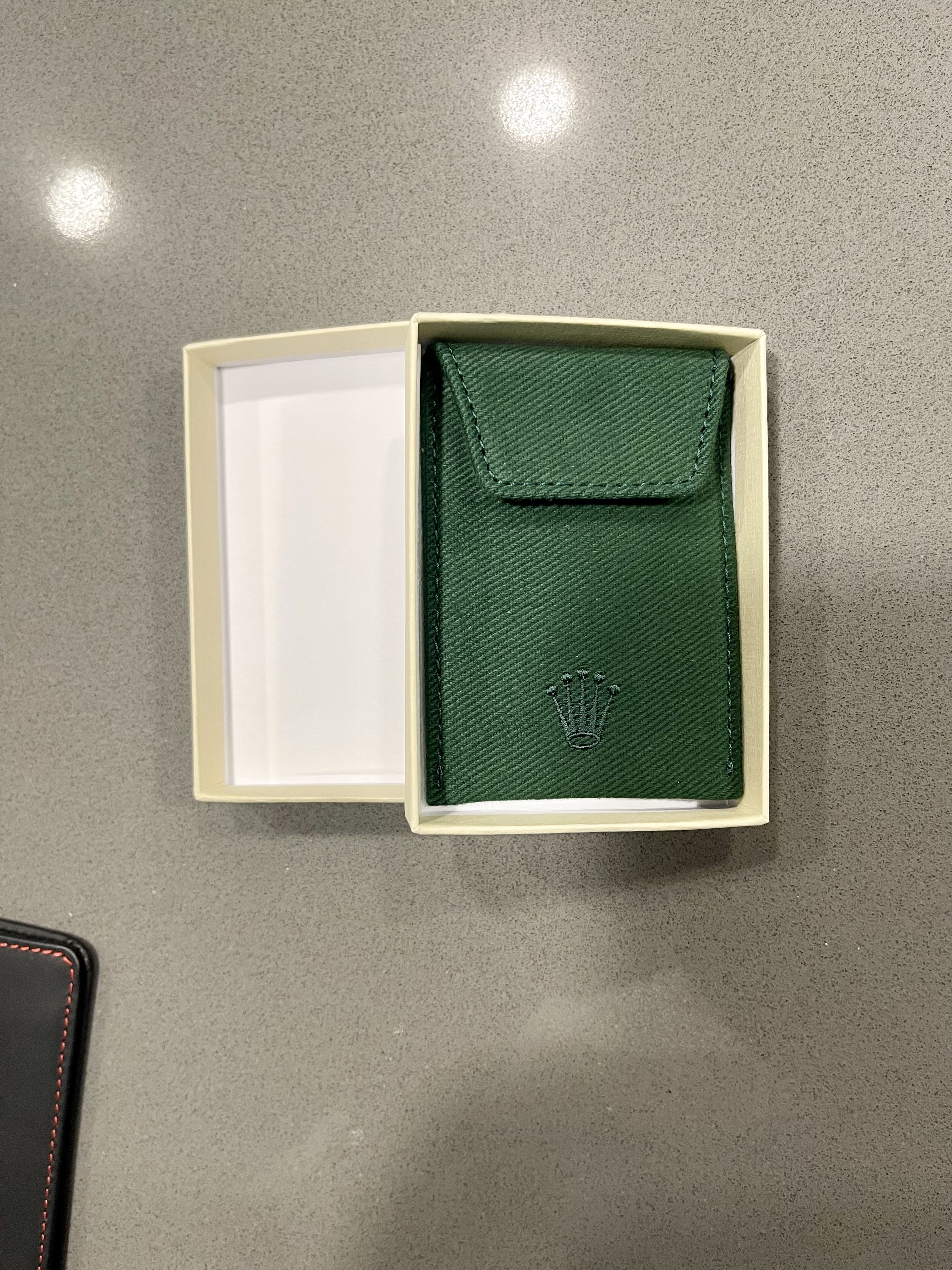 Brand new. Thick fabric with what looks like hand stitched(?) crown logo. Comes with small Rolex green pouch. $100.00.