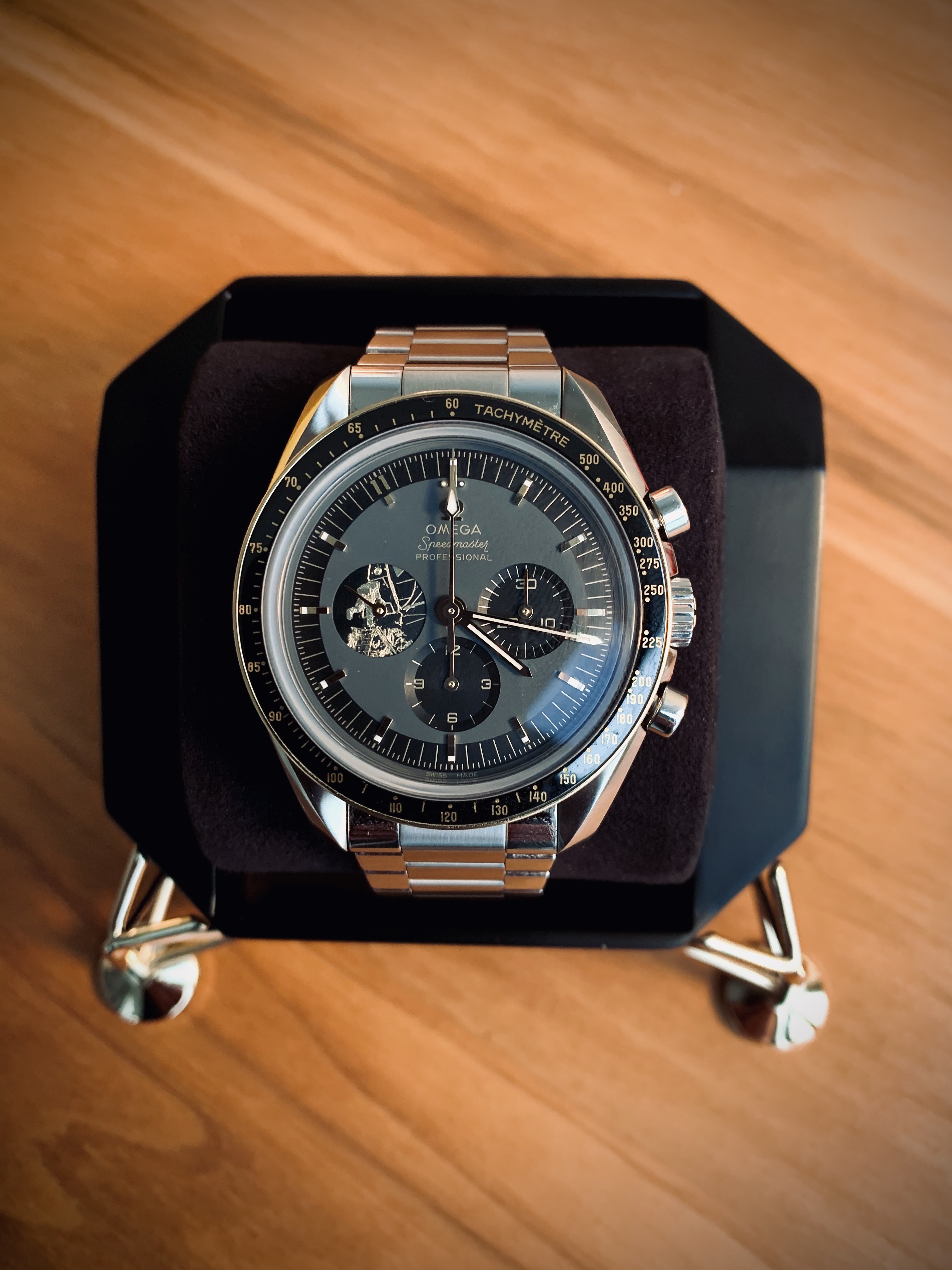 This past November my wife and I traveled to Tel Aviv. While sightseeing we stopped in a very nice shopping mall, and I noticed an Omega dealer. With no expectations I went in to ask about the Apollo 11 anniversary watch. The manager told me their entire allocation had been 20 watches and of course they had been sold out for months . . . but then told me she thought she heard one of their customers originally bought two watches but then cancelled one. So it was possible they had one unclaimed watch available. She then made several phone calls, all in Hebrew which I did not understand, and then told me yes, they still had that one last watch available. I could have it and they would ship it to me in the US when they received it from Omega. But I would have to pay for it in full right then . . . . and her price in US currency was just under $12,000. That seemed a bit high but she would not go lower.