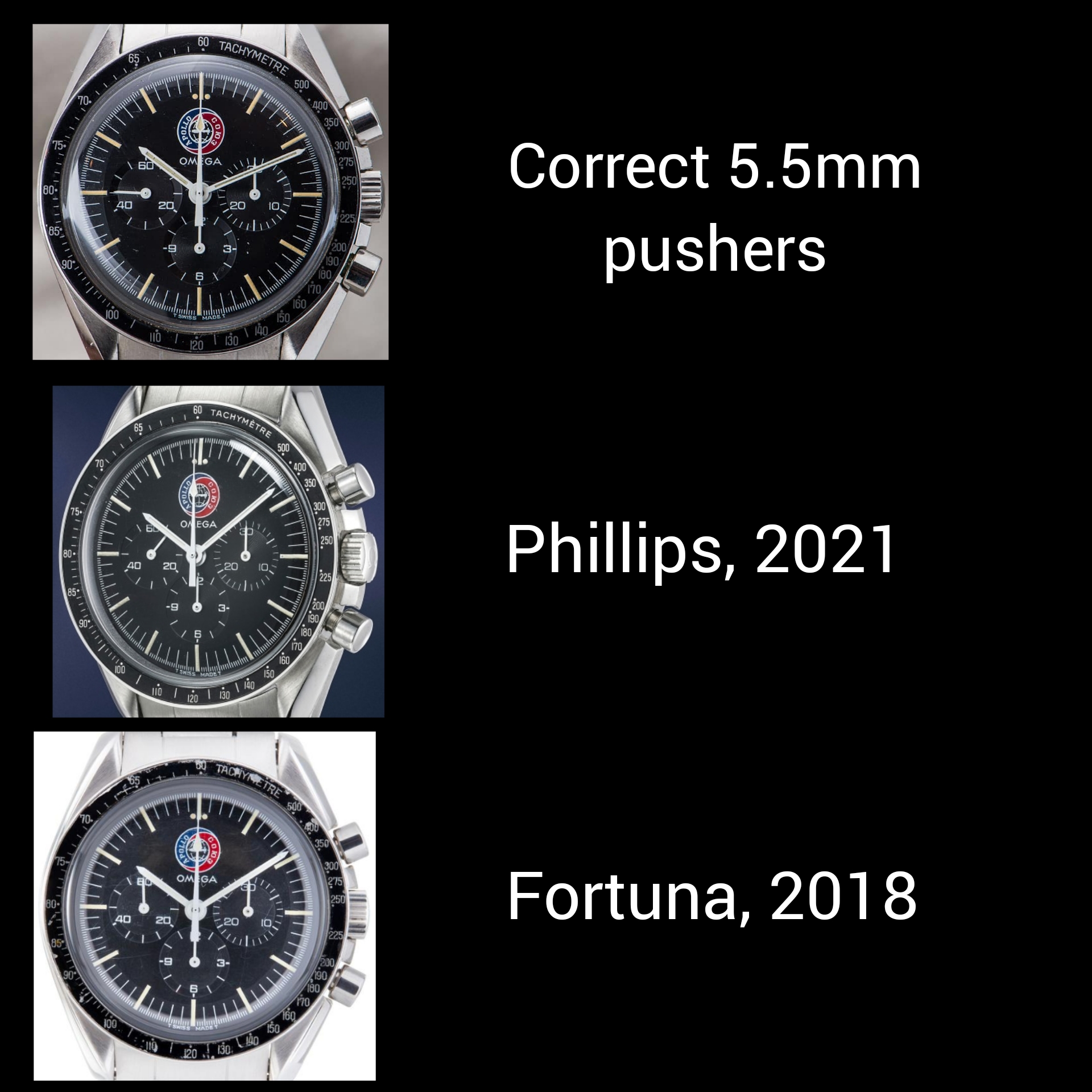 Note that it has the caseback that accepts 5.5mm pushers, even though it currently has 5mm pushers. According to the previous auction, it had service replacement pushers installed. It would be easier for a new buyer to replace those with 5.5mm (If they can be found) since it already has the correct case. That should impact the bids.