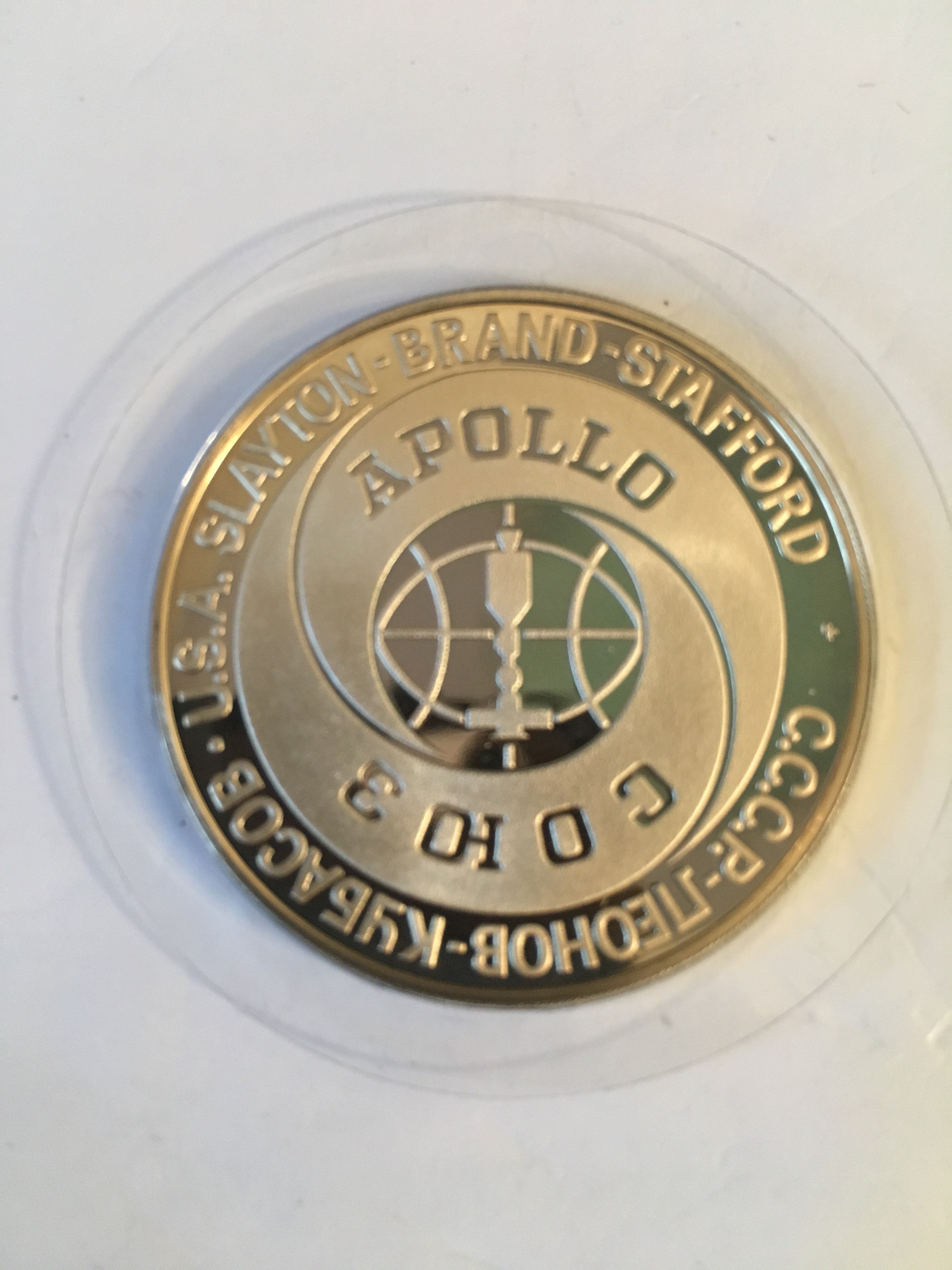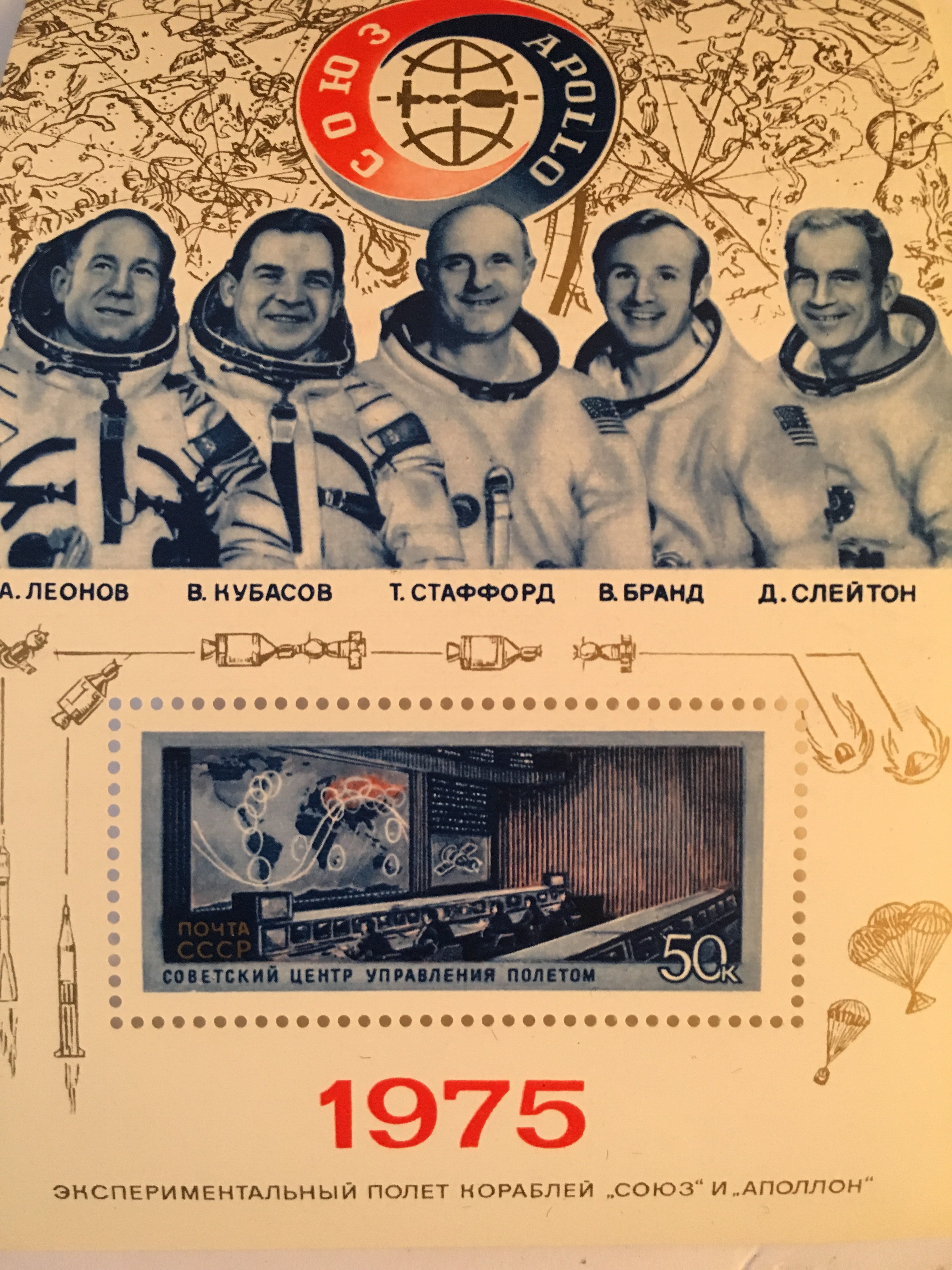 The ASTP project emblem, created by Russian artist Galina Balashova, was artfully designed to eliminate any bias by having APOLLO and СОЮЗ (SOYUZ) appear on opposite sides of the patch, which had no inherent up/down or left/right orientation. It was designed in 1973, and was widely used throughout the project both in America and the Soviet Union.