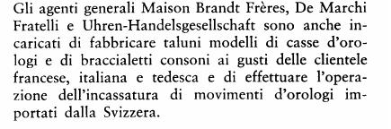 The general agents Demarchi and Uhren-Handelsgesellschaft are shown to manufacture bracelet watch models and to perform the OMEGA brand watch movements