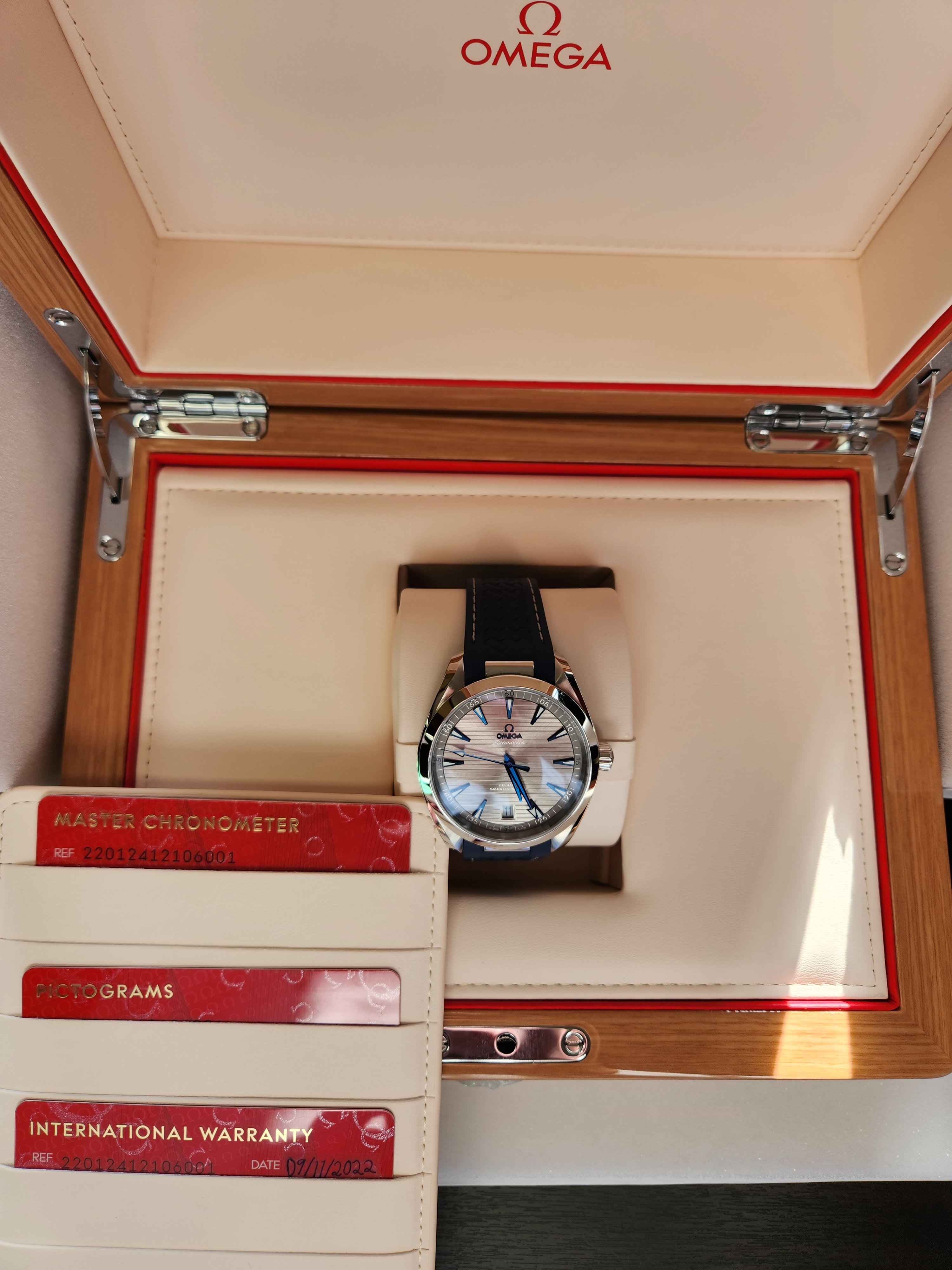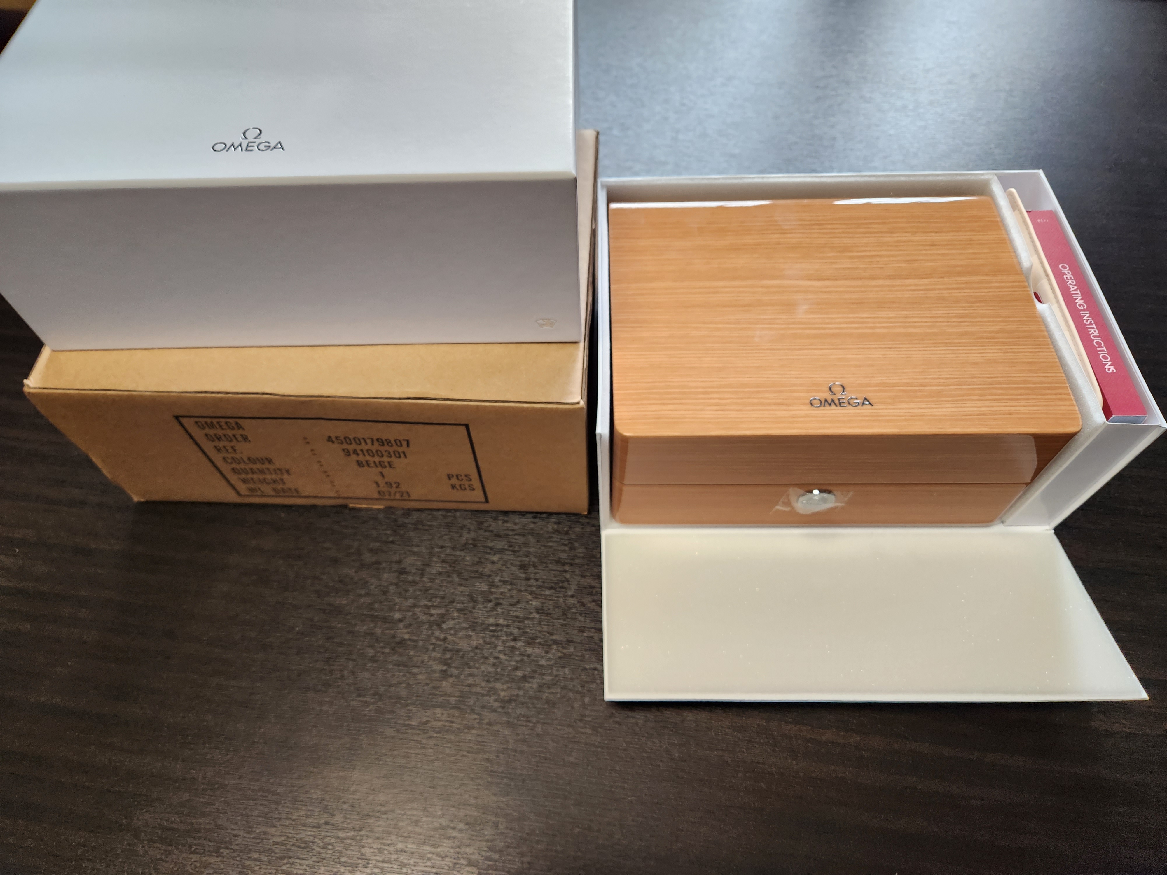 It's in pristine condition. It comes with both cardboard boxes, wooden presentation box, soft pouch, booklet, Master Chronometer card, pictogram card and warranty card.