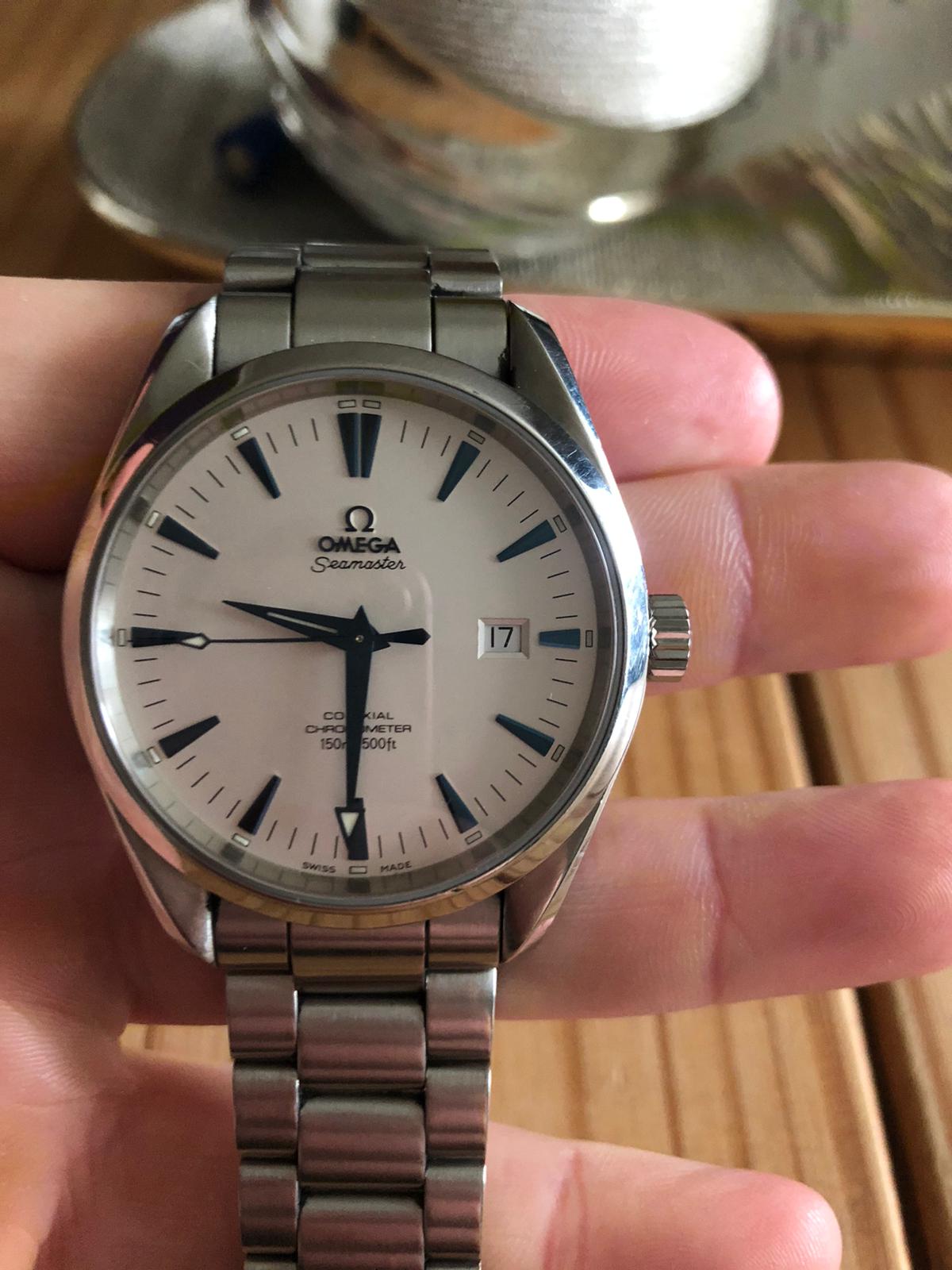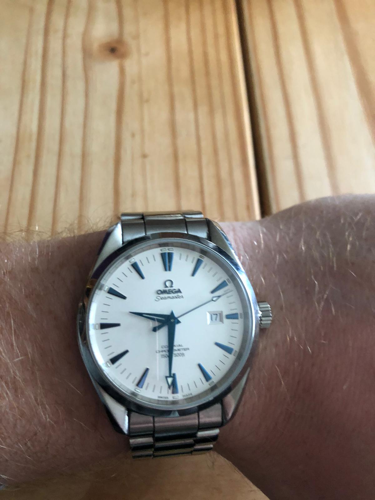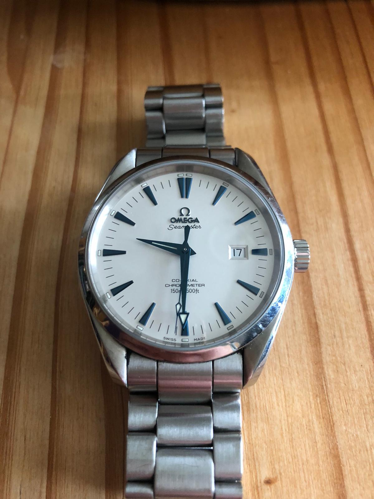 ·Omega Aqua Terra 2502.33 with a beautiful white dial and blue hands. Very large size ( 42mm ) and bracelet fits a 7.5 inch plus wrist. I took this as a part exchange and unfortunately no box or paperwork. This watch wears big on the wrist . Watch comes with an Omega service pouch but no box or paperwork. I am looking for 2000 euro for this beauty and I am open to trades for mark???? Speedmasters. Show me what you got. I am EU based and hopefully to avoid customs charges an EU deal would be preferable but I can ship anywhere if agreeable. The watch has not been serviced while I have owned it but it also has not been worn since I owned it. Payment by PayPal as a gift or add 4%. Bank transfer is acceptable . Shipping to be agreed. Many thanks to OF for the space and for looking.