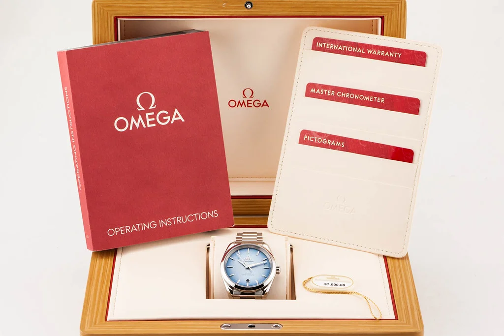 ·Up for sale is a brand new Omega Aqua Terra 8800 75th Anniversary 38mm Summer Blue Dial on Bracelet, reference # 220.10.38.20.03.004. It comes complete with all boxes, papers, booklets, hang tag and Omega Warranty Card dated August 2024.