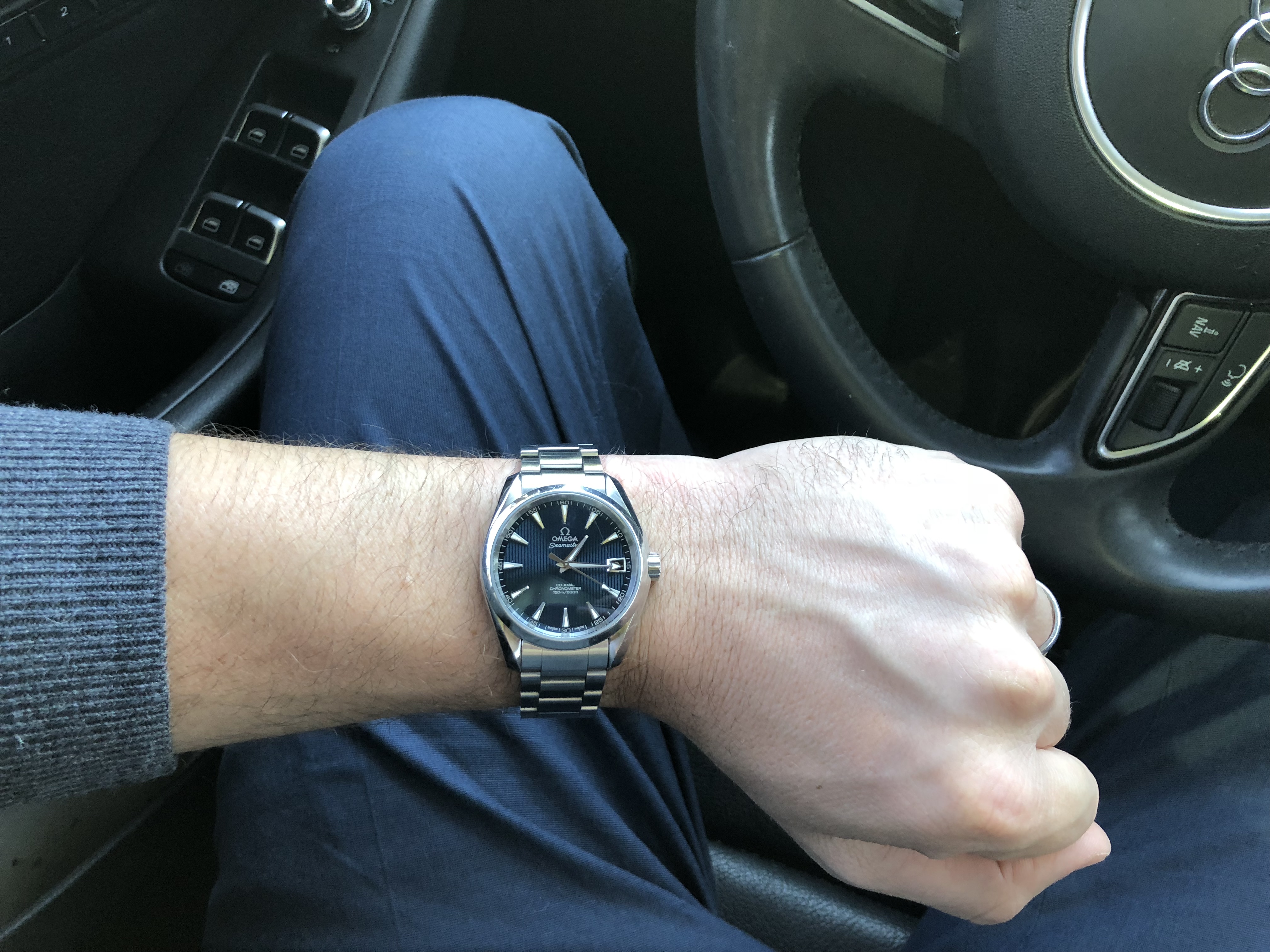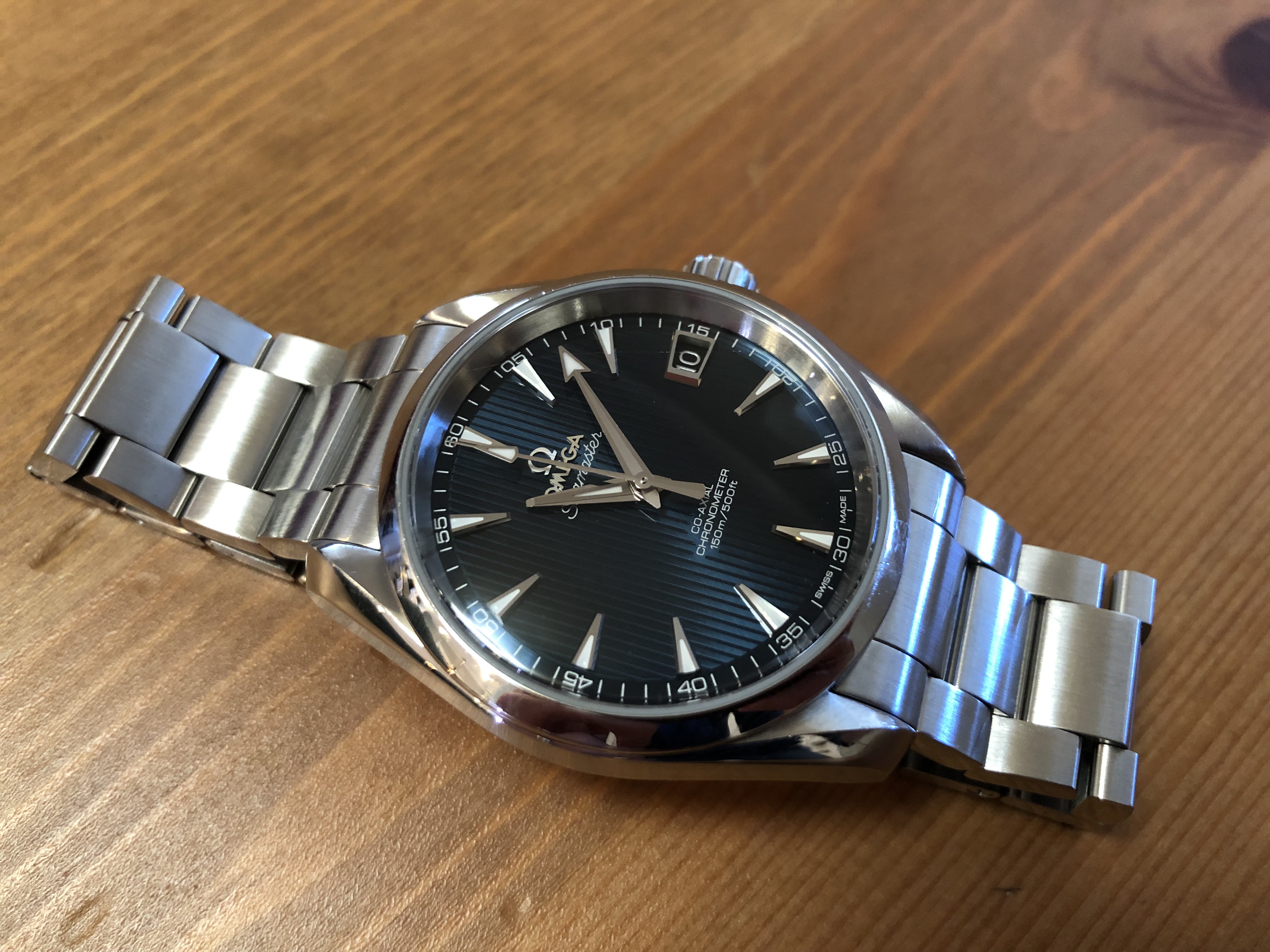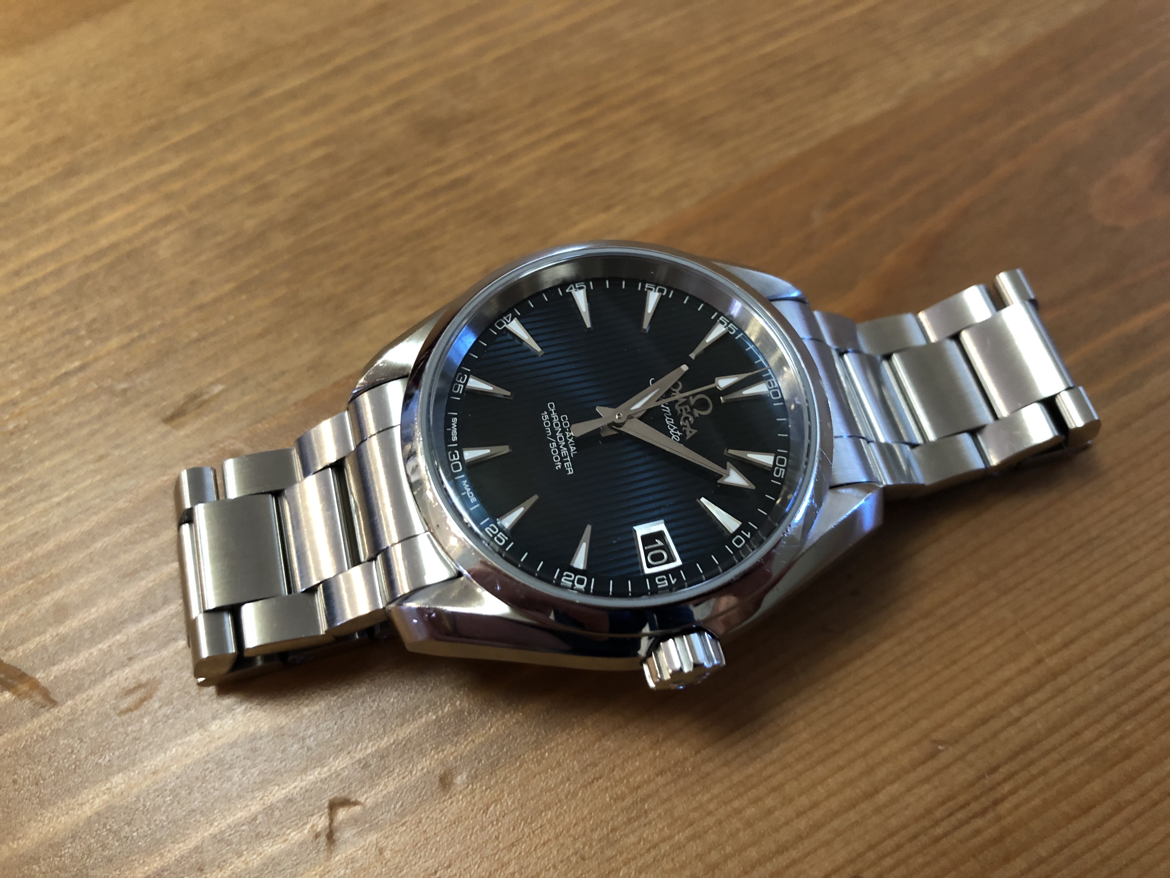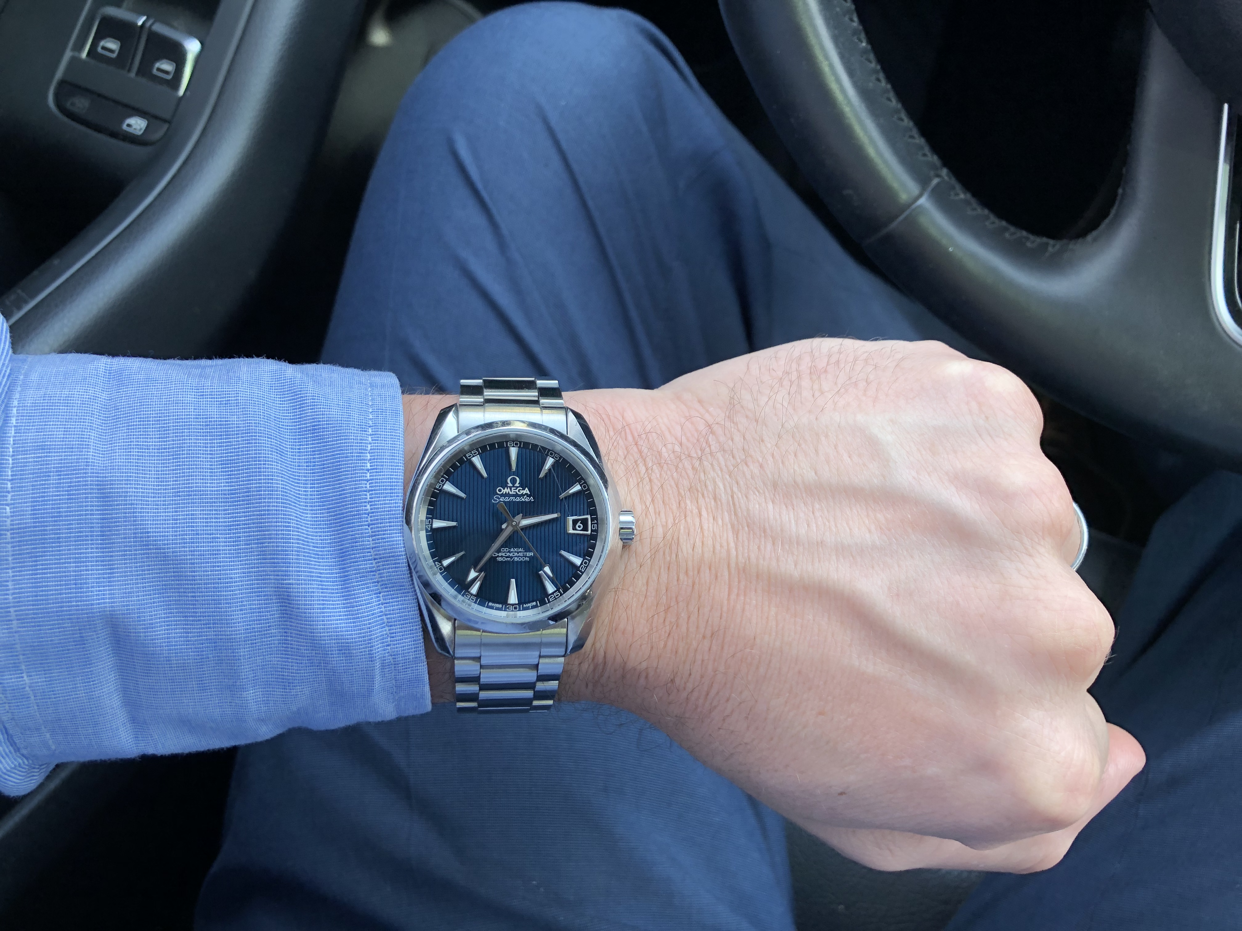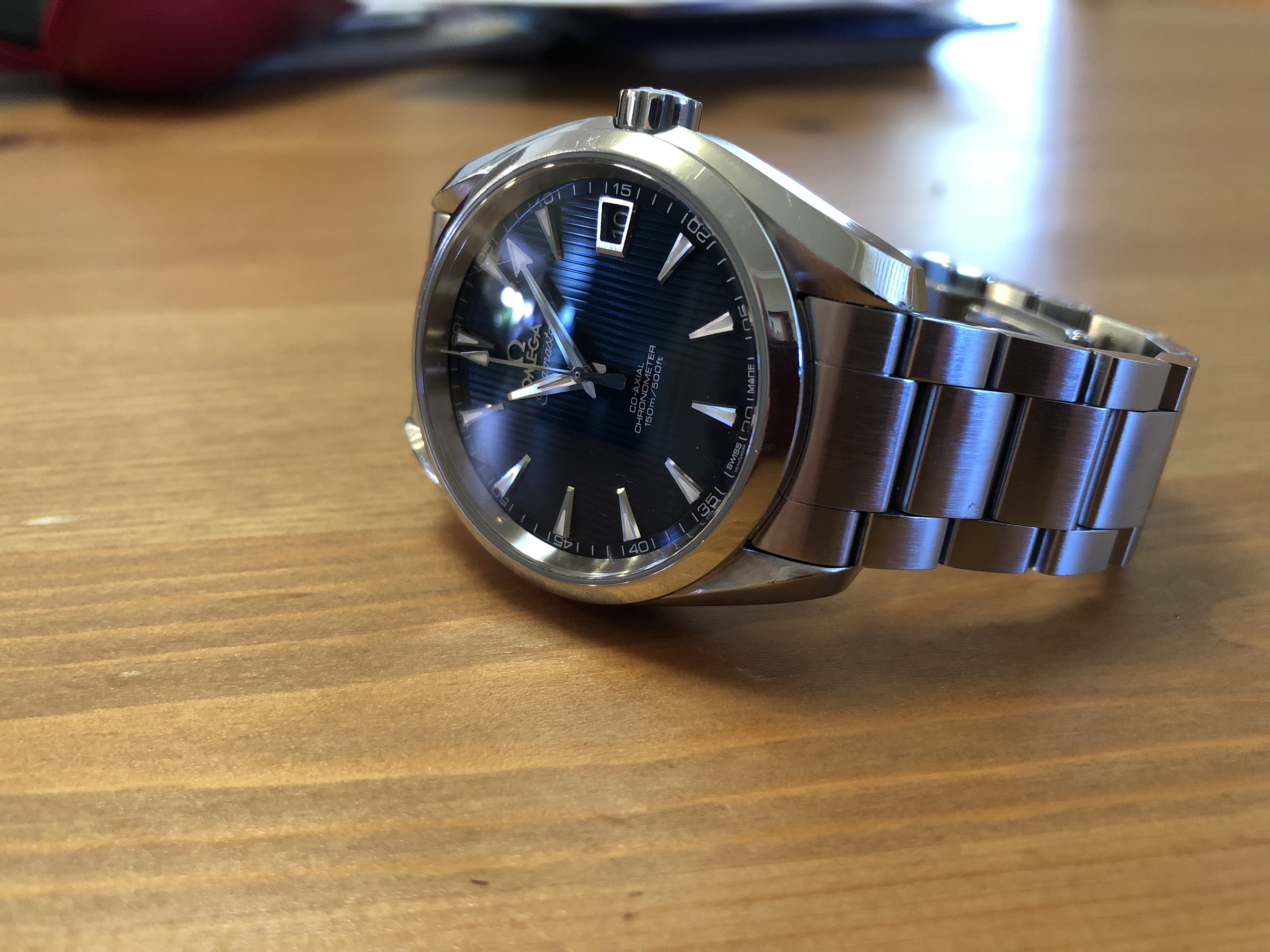 ·Omega Aqua Terra model number 231.10.39.21.03.001 blue dial, 38.5mm. It’s a stunning watch but I’m selling to help fund another. I picked this up last summer with no box or papers. This is a worn watch and as such there are several scuffs and scratches especially around the bezel. The largest scratch is across the crystal I’m unsure if the scratch is in the AR coating or in the sapphire itself. It can be seen obviously in some lighting conditions and not so obviously in others. I tried to capture the best I could in photos so there are no surprises. Watch keeps excellent time and functions normally. Bracelet will fit up to a 7.25 inch wrist.