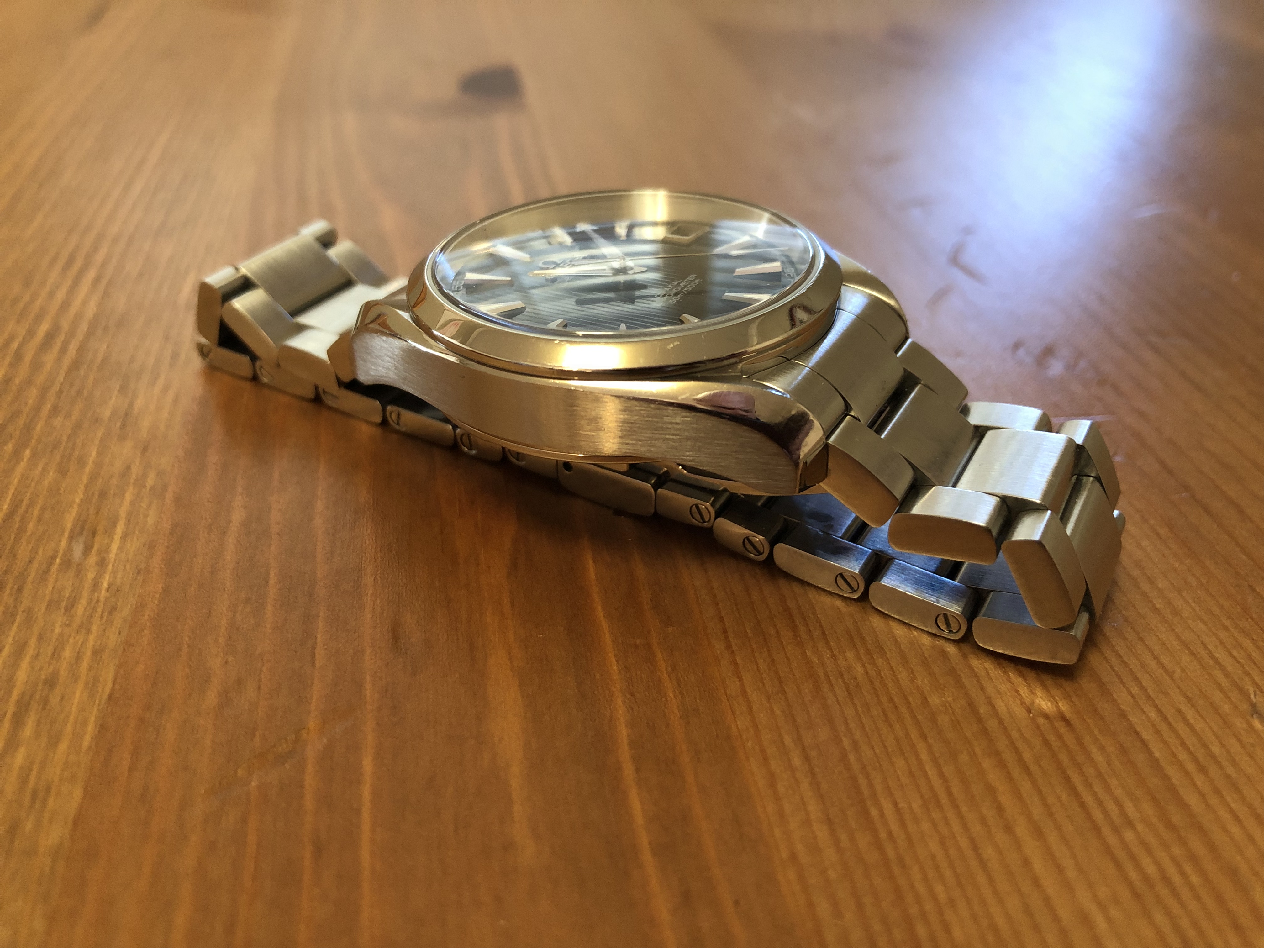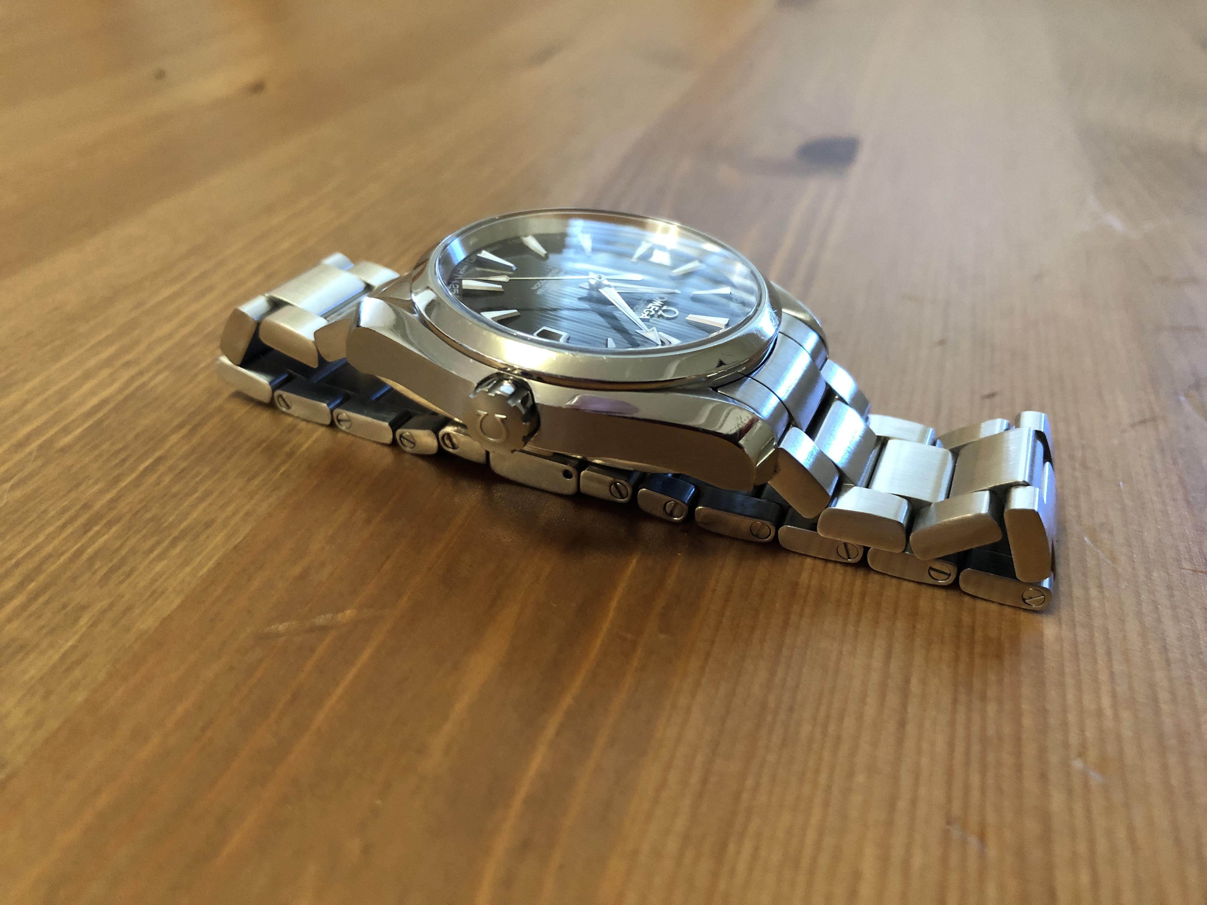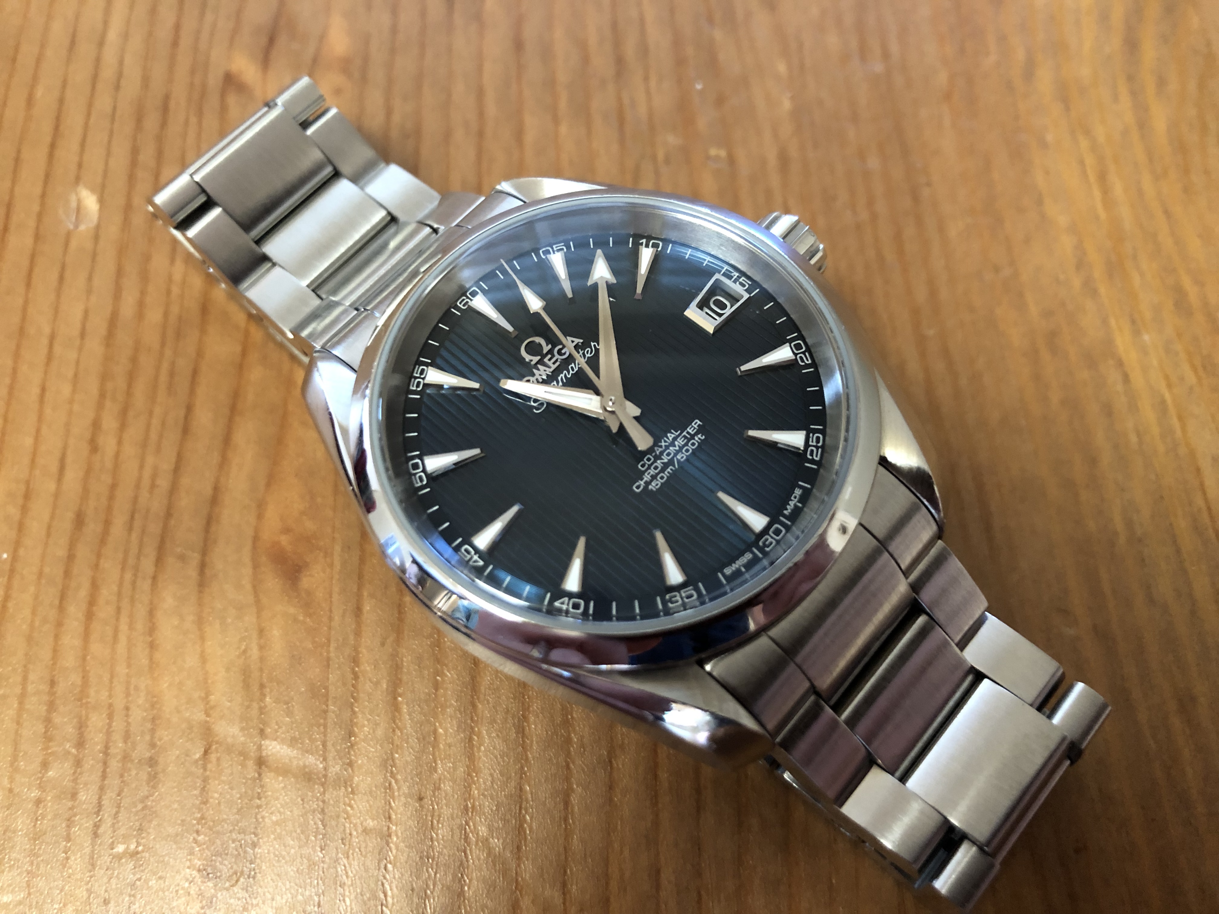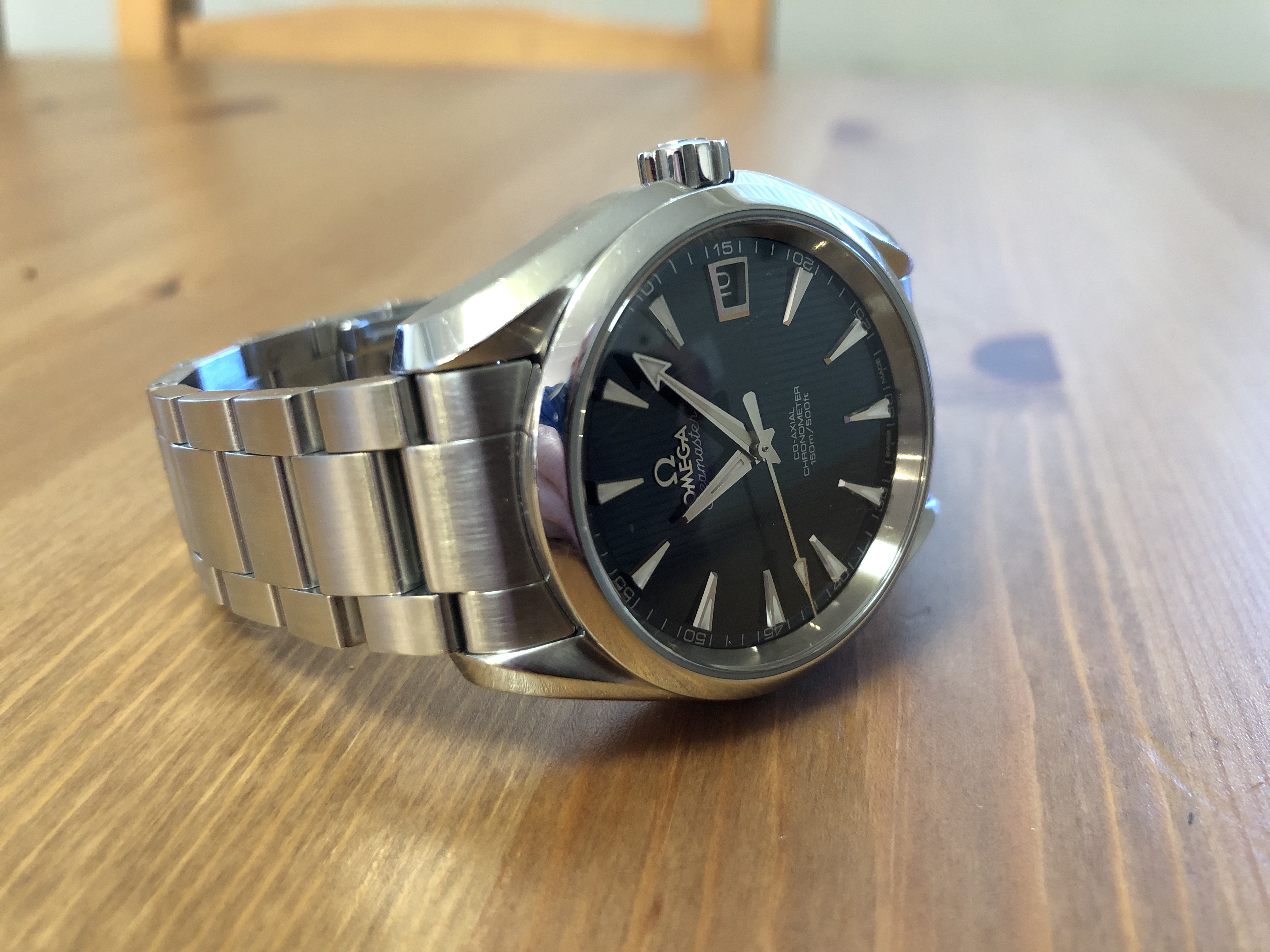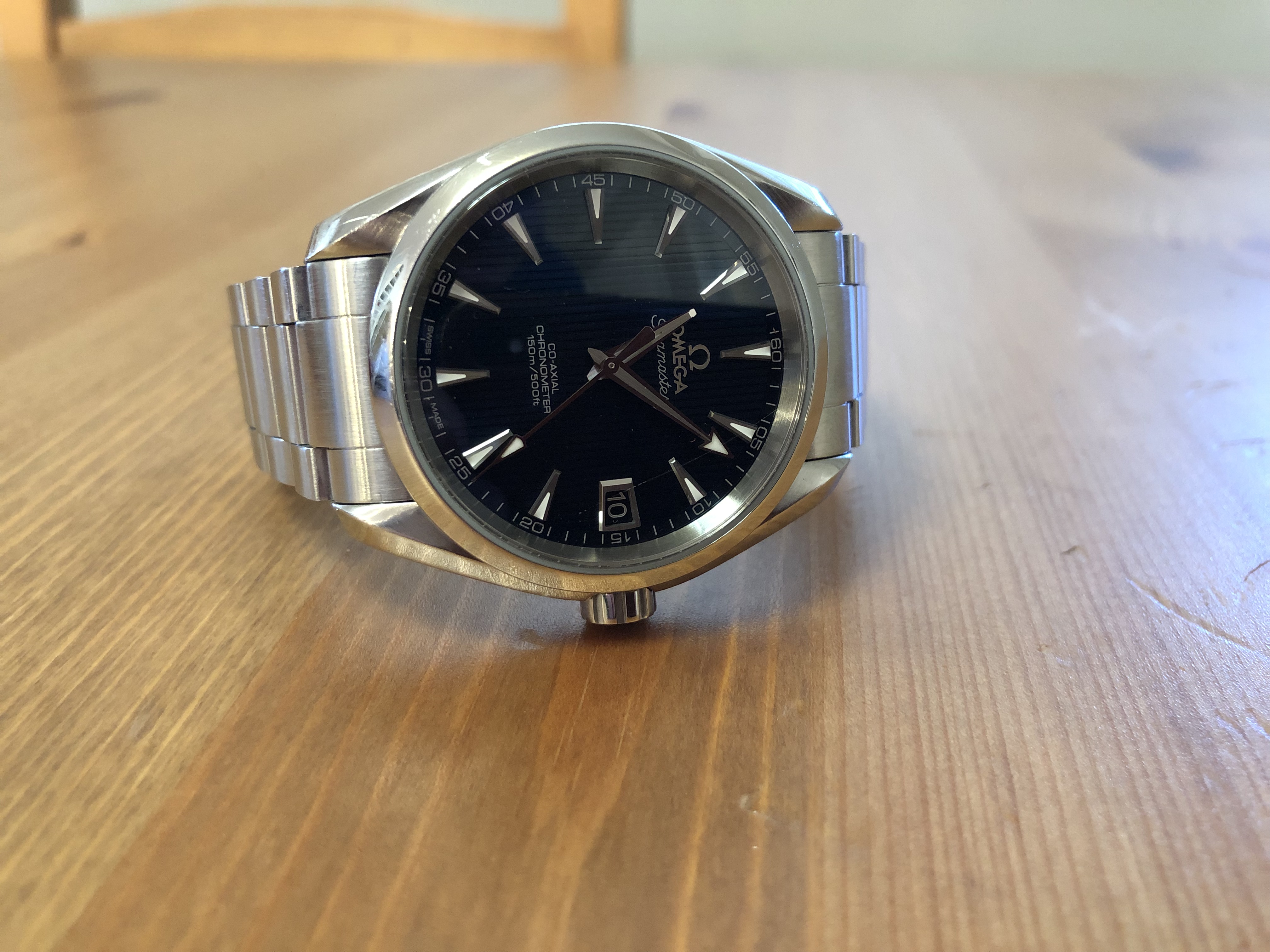 ·Omega Aqua Terra model number 231.10.39.21.03.001 blue dial, 38.5mm. It’s a stunning watch but I’m selling to help fund another. I picked this up last summer with no box or papers. This is a worn watch and as such there are several scuffs and scratches especially around the bezel. The largest scratch is across the crystal I’m unsure if the scratch is in the AR coating or in the sapphire itself. It can be seen obviously in some lighting conditions and not so obviously in others. I tried to capture the best I could in photos so there are no surprises. Watch keeps excellent time and functions normally. Bracelet will fit up to a 7.25 inch wrist.